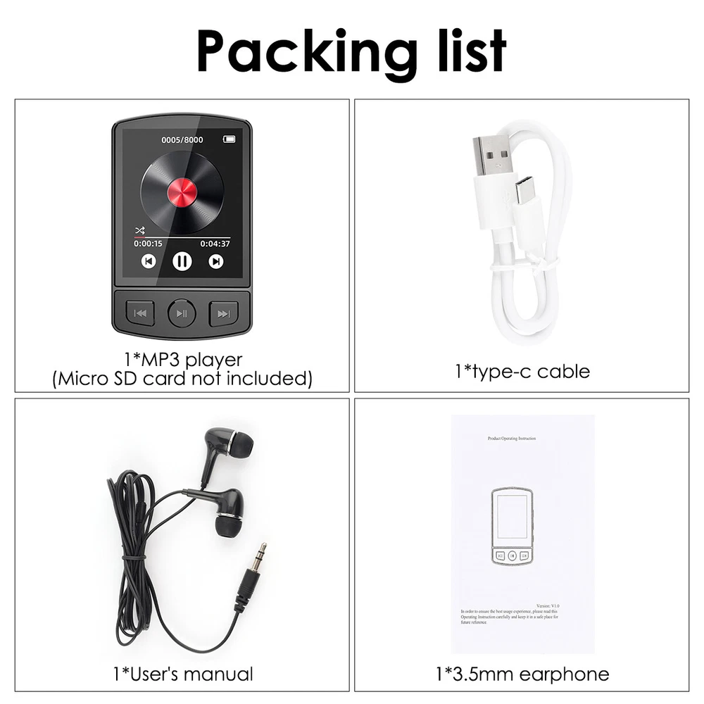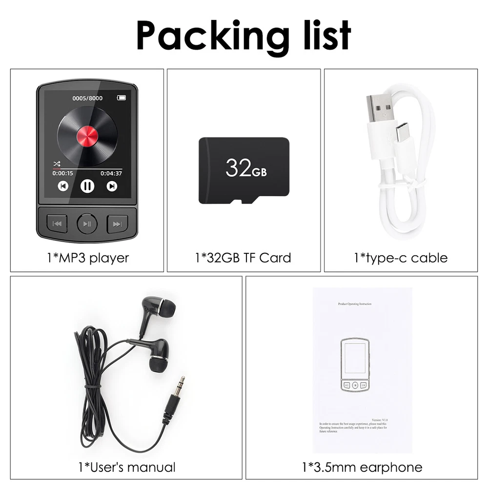 Product Description Bluetooth Sport Lossless Music MP4 MP3 Player FM Radio Recorder W/ 32GB Card US Features: ●1.77" colour screen. ●Time and date setting. ●Built-in speaker, built-in microphone. ●Music lossless hi-fi sound quality player. ●Support multi-format music playback and lyrics synchronisation. ●Rugged and durable, the front of the screen tempered glass anti-scratch. ●Support memory expansion, support up to 128GB micro SD card. ●Support recording, alarm clock, video playback, photo album, eBook, external speaker. ●Using Bluetooth 5.2, you can connect Bluetooth headset, Bluetooth speaker and other audio devices, the connection is more stable and the sound quality is better. ●You can fix the player firmly on the shoulder strap or pocket T-shirt, suitable for dancing and fitness, leisure and entertainment, hiking and cycling, running and fitness good companion. PLEASE NOTE: 1.The bluetooth of the player can not be paired with, computer bluetooth, mobile phone bluetooth! 2.Player bluetooth may not be compatible with genuine iPhone, JBL bluetooth headphones, bluetooth speakers! Specification: Product Name: MP3 Player Product Model: A7 Screen size: 1.77 inch Screen resolution: 128 * 160 Bluetooth connection: Bluetooth 5.2 Operation mode: button Video format: AVI Recording format: WAV/MP3 Picture format: JPG/JPEG/BMP Music format: MP3/WMA/APE/FLACWAV/AAC-LC Headphone port: 3.5MM Charging time: about 2 hours Battery life: 24 hours (3.5mm headphones resting to listen to music) Capacity battery: 250mAh Charging port: type-c Memory Expansion: Support up to 128G Micro SD card (not included) Language support: English/French/German/Italian/Spanish/Chinese Main features: back clip / Bluetooth / FM / recording / alarm clock / camera / e-books Product weight: 32g Product material: ABS Product size: 65*40*15mm Package Content: 1*MP3 player / 1*MP3 player + 32GB TF Card (Optional) 1*type-c cable 1*User's manual 1*3.5mm earphone Attention: 1.Please allow 1cm difference due to manual measurement! 2.Due to the difference between different monitors, the picture may not reflect the actual colour of the item. Thanks! Payment Shipping Terms Returns Contact Us We accept only. If buyer want to delay the payment because of financial problem, please contact me by the ebay message within 3 days Payment via PayPal (PayPal accepts all major credits/debit cards and eCheque) ECheque payment will tak e 3-10 days to get clear, thus DELAYing the shipment. Item will be shipped within 1-2 working day of payment cleared. All items will be checked strictly before shipping and it will be shipped to your PayPal address. Estimated delivery time is 4-8 working days (Not including weekend or public holidays) Delivery times may vary particularly during peak periods or unexpected weather conditions. In event of a very unlikely slight delay, your patience would be highly appreciated. We do not provide pick up or local collection service so far. For any issues with Defects, Return, Item Exchange request, please contact us first and send us a message first before opening any type of case or request. We devote ourselves making EVERY CUSTOMER in 100% Satisfactory and resolve any problem. We highly value and appreciate your business. Thank you. No returns will be accepted without an RMA number. Please contact us for the RMA number. Return is acceptable within 30 days of delivery. Return for replacement or money back is optional. Returned items must be in the brand new, unaltered and resalable condition. Seller is not responsible for any labor cost, expense in a dealer store, or damage due to wrong installation. Return is accepted within 14 days after the buyer's receiving the item. (Excluding contrived damagement or misusage).100% money-back Guaranteed! All product will be tested in 100% before delivery.If the item is defected by the processing of postage,Buyer has up to 14 days from date of receipt for exchange of a new one.All shipping charges for returned products are to be paid by the buyer,Please contact us for the return address All messages will be answered within 24 office hours. Please contact us either by clicking "contact seller" in the "purchase history" section or simply click "ask a question" at the bottom of this page. If you are unsatisfied with our item or service, please contact us before leaving any feedback. We are committed to resolve all issues in a friendly and satisfactory manner. We always reply to messages within 2 business days (off-duty at weekend). If you do not get a response from us, then please check your junk or spam mailbox. Payment We accept only. If buyer want to delay the payment because of financial problem, please contact me by the ebay message within 3 days Payment via PayPal (PayPal accepts all major credits/debit cards and eCheque) ECheque payment will tak e 3-10 days to get clear, thus DELAYing the shipment. Shipping Item will be shipped within 1-2 working day of payment cleared. All items will be checked strictly before shipping and it will be shipped to your PayPal address. Estimated delivery time is 4-8 working days (Not including weekend or public holidays) Delivery times may vary particularly during peak periods or unexpected weather conditions. In event of a very unlikely slight delay, your patience would be highly appreciated. We do not provide pick up or local collection service so far. Terms For any issues with Defects, Return, Item Exchange request, please contact us first and send us a message first before opening any type of case or request. We devote ourselves making EVERY CUSTOMER in 100% Satisfactory and resolve any problem. We highly value and appreciate your business. Thank you. No returns will be accepted without an RMA number. Please contact us for the RMA number. Return is acceptable within 30 days of delivery. Return for replacement or money back is optional. Returned items must be in the brand new, unaltered and resalable condition. Seller is not re