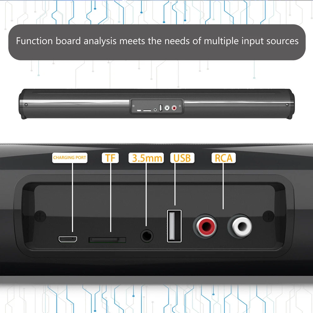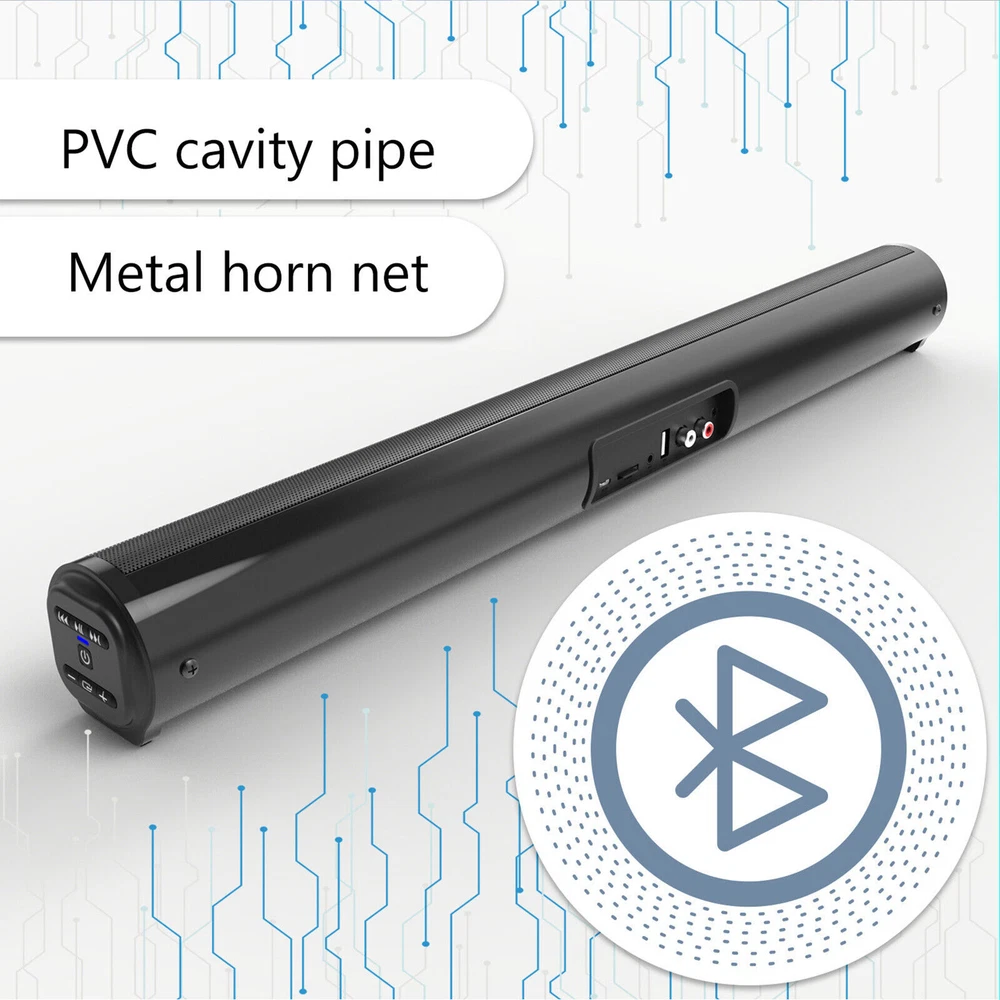 Product Description Bluetooth 5.0 Home TV Sound Bar Speaker System Wireless Subwoofer 3D Surround Feature: 1. Bluetooth 5.0 Technology: Compatible with most Bluetooth-enabled devices, connect to your smart phone instantly. And the transmission distance up to 10 meters. 2. Multiple Connection Methods: Not only come with Bluetooth function, but also support TF card, U disk, RCA,AUX playback, and support FM radio. Support A2DP, AVRCP, HSP and HF format. 3. Excellent Sound Quality: Adopted the newest configurations, this Soundbar has 4*10W built-in speakers and Bluetooth 5.0 chipset, which means it can produce greater bass and excellent sound performance. Four speakers for high performance multi-dimensional sound and an unparalleled cinematic deep bass surround sound, let you enjoy high-quality music. Watching TV at home is like watching a movie at a movie theater. It gives you a theater level sound experience. 4. Elegant Design & Long Battery Life: With the 2000mAh built-in battery (charged by USB cord included), the speaker can play music for 4H when it is fully charged. And the standby time up to 240 Hours. Just enjoy the music without needing to worry the battery. 5. High Quality: Made of high quality metal mesh material, it can effectively prevent music distortion and block external noise. 6. 6 Kinds of Sound Effects: 6 kinds of sound effects can be switched at will. To meet different sound quality needs. 7. Equipped With A Remote Control: You can remotely control the speaker and switch the sound effect through the remote control. 8. TWS Function: TWS technology allows you to pair two bluetooth speakers by wireless Bluetooth, then audio can be played in sync on two speakers (as left/right channel outputs respectively), for true double enhanced stereo sound. The 4*10W drivers enhance the bass and provide more louder sound, which will crash the party or dancing. 9. Hands-free Call: With stable bluetooth connect, nothing will get in the way between you and your phone call. Hands-free calling havenever been easier. Specifications: Item Type: Bluetooth Speaker Material: metal + plastic Waterproof rating: IPX 4 Expansion storage: 32G Bluetooth Version: 5.0 Color: Black Speaker Power: 4 * 5w Use Transmit Power: 1.49mw Transmission Frequency: 2.48ghz Transmission Distance: 10 Meters Music Playback Time: About 8 hours Supported Formats: A2DP, AVRCP, HSP AND HF Battery: 3.7V / 2000MA Signal To Noise Ratio: -80db Frequency Response: 20hz-20khz Charging Voltage: Dc 5v / 1a-2a Charging Socket: Micro USB Size: 560 x 62 x 62mm / 22.05 x 2.44 x 2.44 inch Package included: 1 * Bluetooth Speaker 1 * Remote Control 1 * Charging Cable 1 * RCA Cable 1 * User Manual About Us Shipping Terms Returns Contact Us About Item All items sold by us are being described to the best of our abilities, as accurate as possible, and with utmost conscientiousness on our part. However, to avoid any potential oversights, I respectfully request your assistance in helping us to make this a mutually satisfactory transaction by THOROUGHLY reviewing item description and photos, and asking all questions PRIOR TO BIDDING. Customer Satisfactory 1.We back our commitment with superb service, 100% full money back and a customer satisfaction guarantee. 2.I am here and ready to assist you with any questions or concerns you might have before or after the purchase. 3.My goal is to make sure you are a happy customer and pleasant shopping with us. Feedback If you are satisfied with the purchase and our total service, your comment is very important in our business success. Please take a minute to leave us a positive feedback with an overall Detailed Selling Rating (DSR) of 5. Our eBay account setup auto feedback, so eBay system gives you automatically Positive feedback back after your positive feedback left. IF YOU PLAN TO GIVE US A NEUTRAL/NEGATIVE FEEDBACK OR OPEN EBAY/PAYPAL CASE, PLEASE WRITE TO US IMMEDIATELY SO THAT WE CAN DO OUR BEST TO RESOLVE YOUR PROBLEM. United States Buyers Same business day free shipping within United States All orders will be shipped through USPS First Class, UPS and Fedex depends on the weight of the items. Shipping Time Usually ,Parcel will be delivered 2-5 working day include Handling time. Sometimes shiping time may has a little delay, such as Bad wether,Holidays We stand behind everything that we sell and will do everything possible to assure you are satisfied. When you receive your purchase if you are not 100% satisfied, please sent me ebay message and we will do our best to make you happy. If you still want to return your purchase, simply ship the item(s) back to us and we will refund your original purchase price and the original shipping charge. Buyers are responsible for the postal cost of returning the items. We must be notified of the intent to return your item within 30 days of receiving the item. Items returned must be in the same condition that they were received. How to return 1,Please ask us for return address . 2,Shipping back the package . The RMA#(Return Merchant Authorization Number = Your ebay ID) must be clearly written on the return package ,Otherwise the package will be refused. 3,Sent us the return tracking number. 4,All returns will be inspected prior to a credit being issued. 1:Returns are accepted within 60 days of purchase. 2:All returned items MUST BE in the original packaging. 3:We will be happy to assist you if if any item needs to be returned or replaced 4:Please don't open a return request before contacting us first to solve, many thanks. Sent ebay message in English If you have any questions, our Customer Service staffs welcome you to sent me ebay message. We strive to answer all questions and resolve any problems as quickly as possible. Business Hours: Monday-Saturday 9:00-17:00 About Us About Item All items sold by us are being described to the best of our abilities, as accurate as possible, and with utmost conscientiousness on our part. However, to avoid any potential oversigh