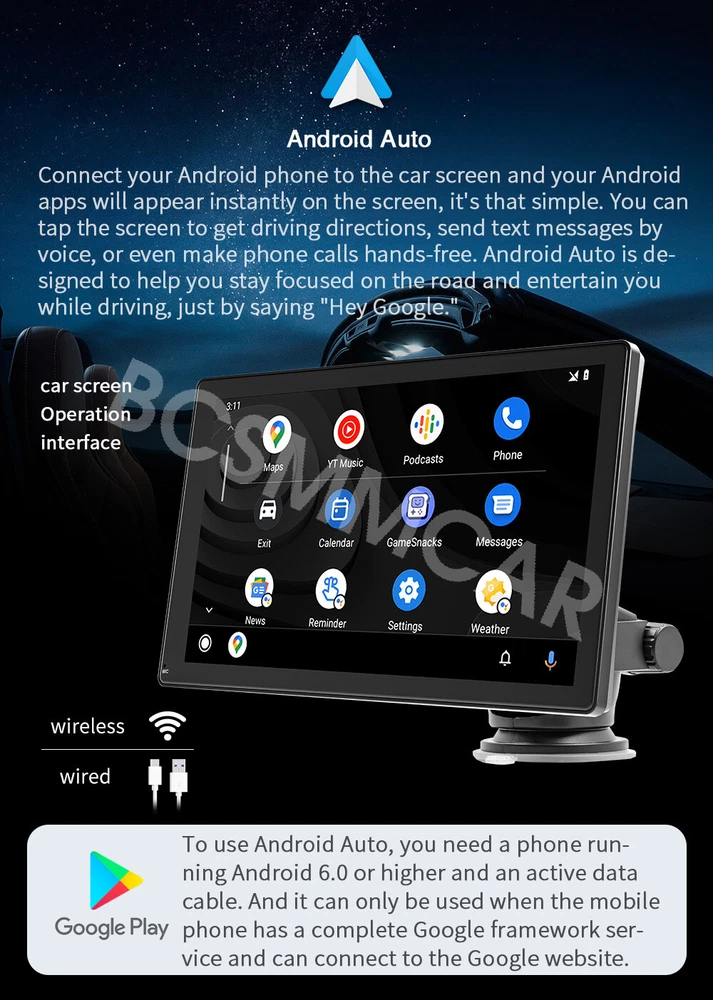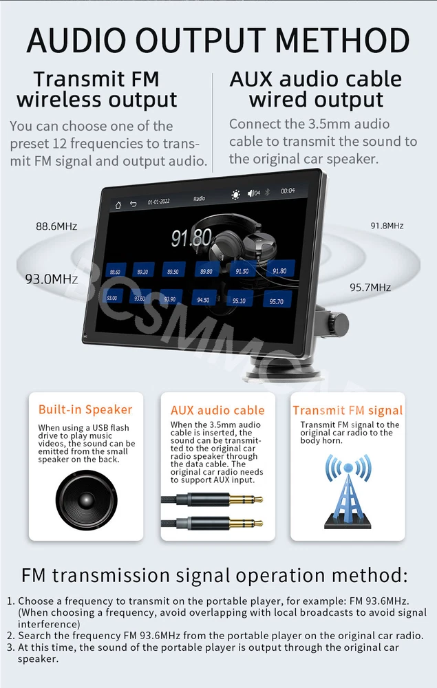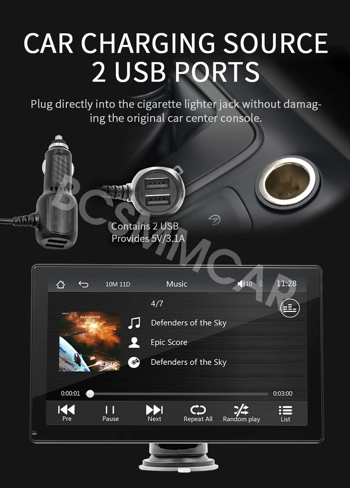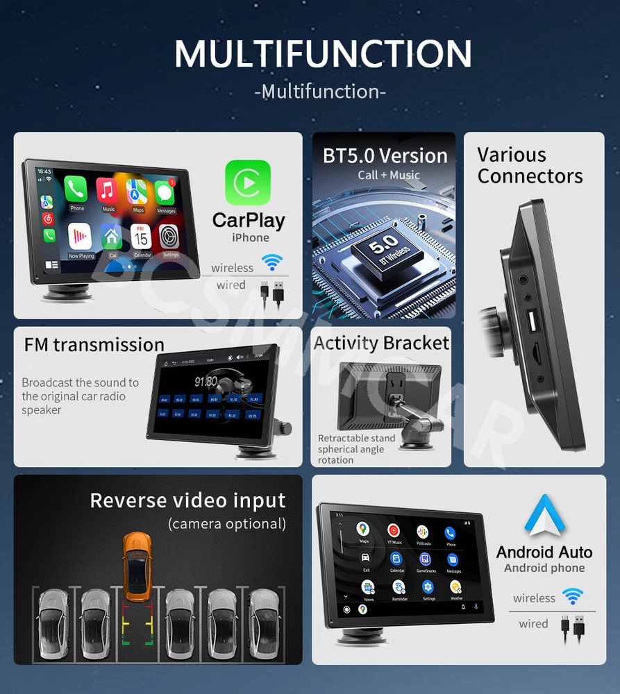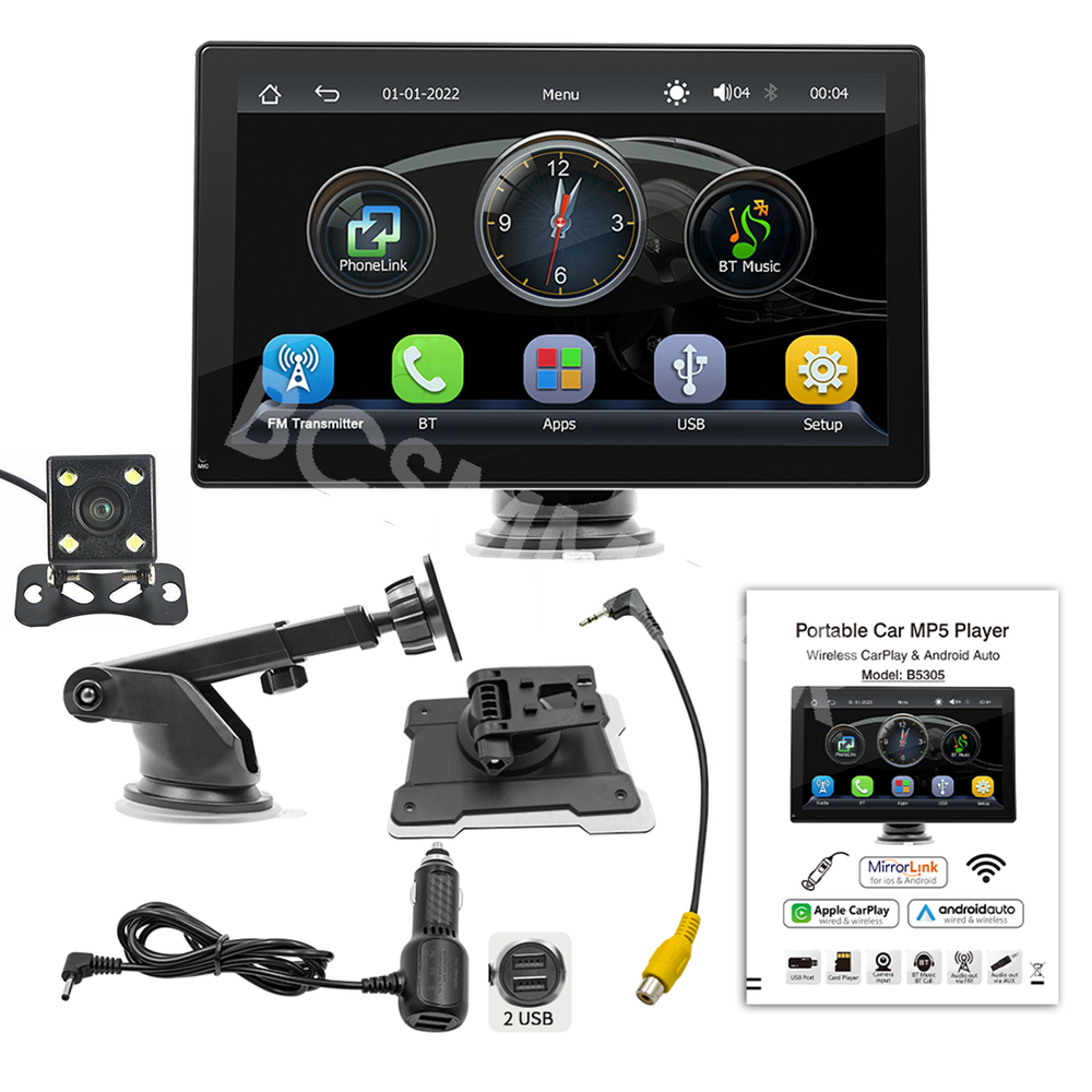 Product View Detail 9In Car MP5 Player Wired Wireless CarPlay Android Auto Wired Mirror Link Portable Car Radio Multimedia Player With Free 4LED Rear Camera Kit Add our listing to Watchlist Or Add to Cart , you will get more discount Portable 9in Car MP5 Player, Wired Wireless CarPlay Android Auto, Wired Mirror Link Features: Mirrorlink: Mobile screen projection, compatible with Android/iOS Phone. CarPlay: Apple's unique car mode, the CarPlay function allows you to Use various functions of iOS Phone. You can open navigation, make calls, send and receive messages, and listen to your favorite songs. All of this is integrated on the central control display in the car. Android Auto: Connect your Android phone to the car screen, and the screen will immediately-display your Android application. Multimedia player: Support reading TF card/U disk, built-in 1W speaker. Reversing camera: Automatically switch to reverse image when reverse gear is engaged (camera optional). Audio output method: FM wireless output, AUX line wired output. In The Box: 1*Host, 1*User manual, 1*Power cable, 1*Mounting bracket, 1*Reversing video cable,1*4LED Rear Camera kit Specifications: Type: portable car MP5 System: for Allwinner melis system Software solution: F133 FM transmission: 88.60/89.20/89.50/89.80/91.50/91.80/93.00/93.60/93.90/94.50/95.10/95.70MHz Radio transmitter IC: AB5301B. Power amplifier IC: CS8571E. GPS signal: not supported. Output power: built-in 1W speaker Operating voltage: 12 to 36V Temperature: -10 to 60℃ BT version: version 5.0 (default name: CarPlay) WiFi frequency: 2.4G/5G Dual Band Running memory: 1Gbit DRAM resolution: 1024x600 Screen size: 9 inches HD (IPS) Installation size: 130x85MM Shell size: 225x136MM Host depth: 25MM Mobile internet: support Mirrorlink (wired), Apple CarPlay (wired and wireless), Android Auto (wired and wireless). Reversing image: support Play video warning: support Built-in speaker: support USB interface: USB2.0 TF card: support Audio output: support Reversing video input: support (included 4LED camera) Audio format: MP3/AAC/APE/OGG/M4A/RA/WAV Video format: H263/H264/H265/DIVX HD/AVI/FLV/MKV/MPEG/MP4/WMV9/VC/ASF/TS/QT Image format: IPEG/PNG/BMP/GIF/TIFF Language:English/Chinese/Spanish/Portuguese/Russian/German/French/Polish/Turkish/Arabic/Hebrew/Italian/Czech/Japanese/Korean/Thai. Factory set password: 113266 Note: Light shooting and different displays may cause the color of the item in the picture a little different from the real thing. The measurement allowed error is +/- 10-30mm. Shipping Policy Payment Method Returns Policy Shipping Policy Payment Method Returns Policy Copyright © 2017 DataCaciques Home Payment Shipping About us Contact us BCSMMCAR Store Categories Store Categories Other Product View Detail 9In Car MP5 Player Wired Wireless CarPlay Android Auto Wired Mirror Link Portable Car Radio Multimedia Player With Free 4LED Rear Camera Kit Add our listing to Watchlist Or Add to Cart , you will get more discount Portable 9in Car MP5 Player, Wired Wireless CarPlay Android Auto, Wired Mirror Link Features: Mirrorlink: Mobile screen projection, compatible with Android/iOS Phone. CarPlay: Apple's unique car mode, the CarPlay function allows you to Use various functions of iOS Phone. You can open navigation, make calls, send and receive messages, and listen to your favorite songs. All of this is integrated on the central control display in the car. Android Auto: Connect your Android phone to the car screen, and the screen will immediately-display your Android application. Multimedia player: Support reading TF card/U disk, built-in 1W speaker. Reversing camera: Automatically switch to reverse image when reverse gear is engaged (camera optional). Audio output method: FM wireless output, AUX line wired output. In The Box: 1*Host, 1*User manual, 1*Power cable, 1*Mounting bracket, 1*Reversing video cable,1*4LED Rear Camera kit Specifications: Type: portable car MP5 System: for Allwinner melis system Software solution: F133 FM transmission: 88.60/89.20/89.50/89.80/91.50/91.80/93.00/93.60/93.90/94.50/95.10/95.70MHz Radio transmitter IC: AB5301B. Power amplifier IC: CS8571E. GPS signal: not supported. Output power: built-in 1W speaker Operating voltage: 12 to 36V Temperature: -10 to 60℃ BT version: version 5.0 (default name: CarPlay) WiFi frequency: 2.4G/5G Dual Band Running memory: 1Gbit DRAM resolution: 1024x600 Screen size: 9 inches HD (IPS) Installation size: 130x85MM Shell size: 225x136MM Host depth: 25MM Mobile internet: support Mirrorlink (wired), Apple CarPlay (wired and wireless), Android Auto (wired and wireless). Reversing image: support Play video warning: support Built-in speaker: support USB interface: USB2.0 TF card: support Audio output: support Reversing video input: support (included 4LED camera) Audio format: MP3/AAC/APE/OGG/M4A/RA/WAV Video format: H263/H264/H265/DIVX HD/AVI/FLV/MKV/MPEG/MP4/WMV9/VC/ASF/TS/QT Image format: IPEG/PNG/BMP/GIF/TIFF Language:English/Chinese/Spanish/Portuguese/Russian/German/French/Polish/Turkish/Arabic/Hebrew/Italian/Czech/Japanese/Korean/Thai. Factory set password: 113266 Note: Light shooting and different displays may cause the color of the item in the picture a little different from the real thing. The measurement allowed error is +/- 10-30mm. Shipping Policy Payment Method Returns Policy Contact US Shipping Policy All items will be checked before packing. All items are new and of high quality. Item will be shipped within 1 business days upon receipt of payment, excluding weekends and public holidays. If to USA,we will ship your order by USPS,it will take about 8-12 working days to you,and you can track it on line. If to other country,we will ship your order by China Post or Singapore Registered Air Mail,it will take about 14-21 working days to you,you aslo can track it on line. Delivery time is about 14-28 business days and it may take up to 8 weeks . Payment Method We accept payment by PayPal only ! Payment shoul