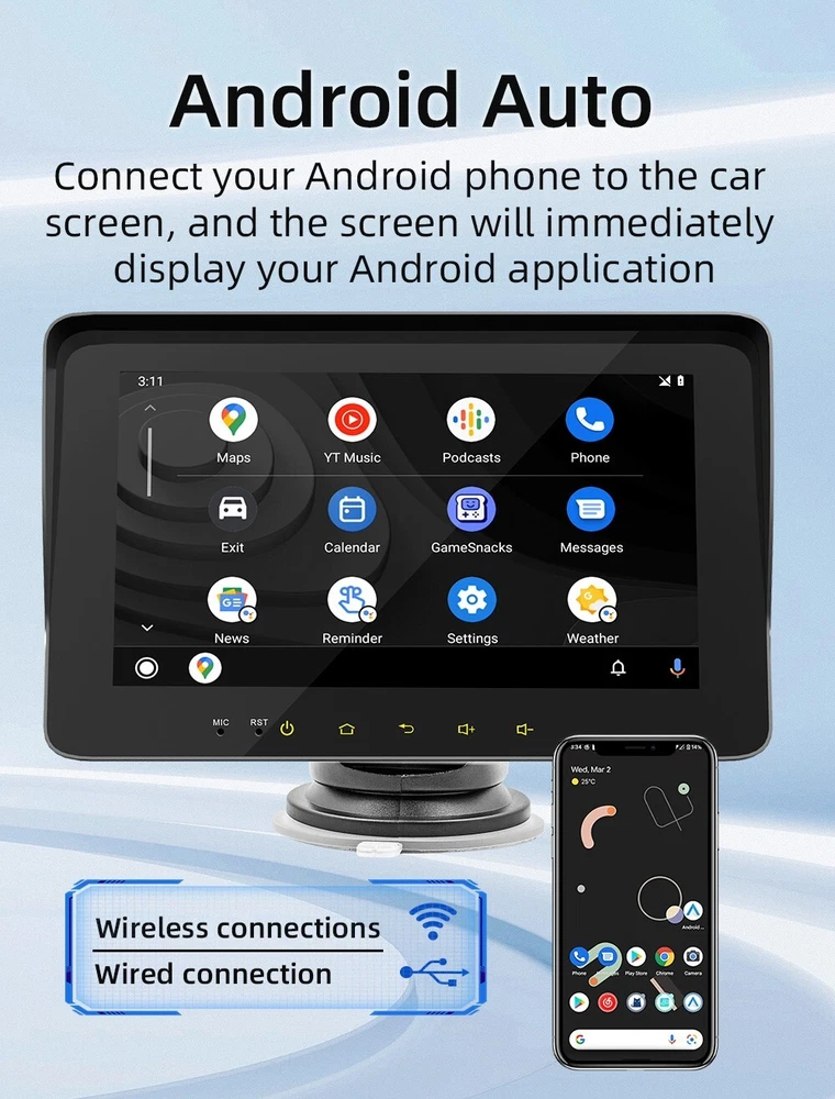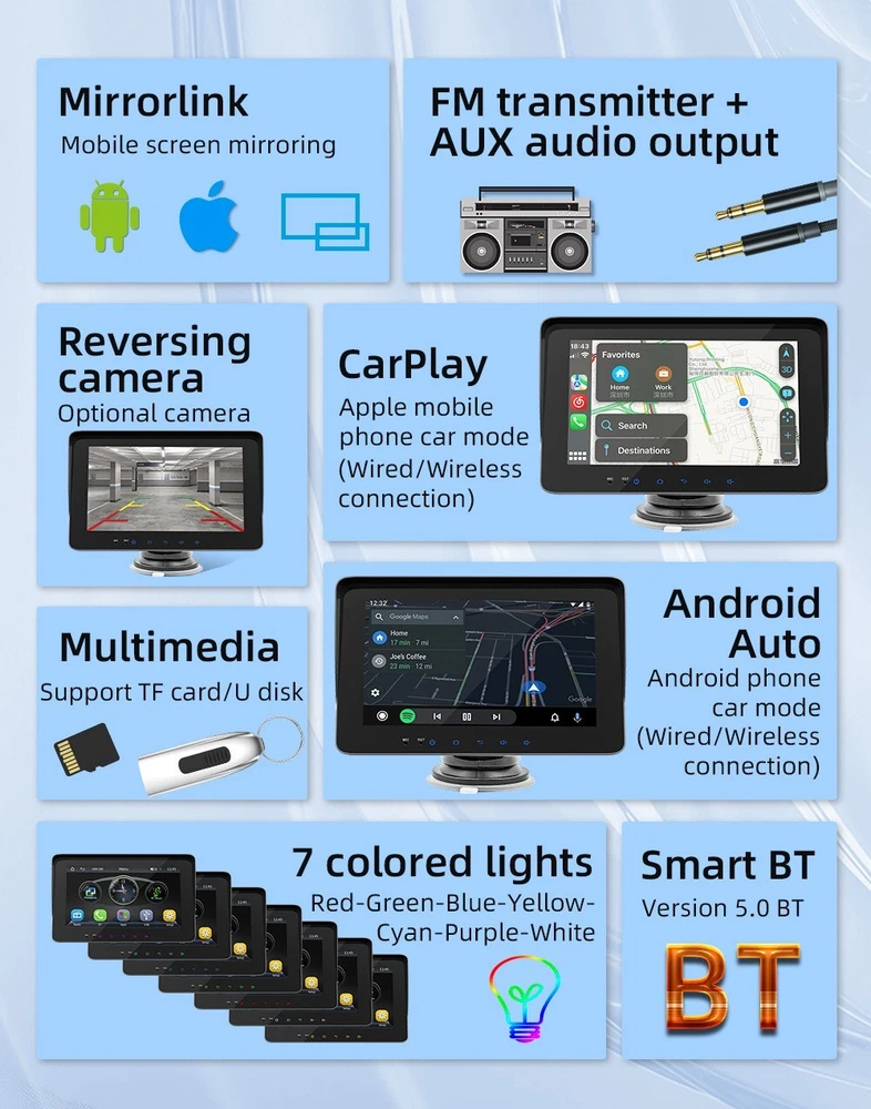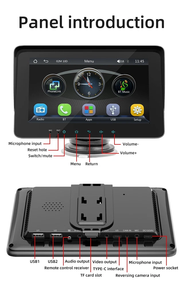 Product Description Universal 7inch Car Radio Multimedia Video Player Touch Screen Portable Wireless Apple CarPlay Android Auto With Steering Wheel Control Add our listing to Watchlist Or Add to Cart , you will get more discount Basic parameters Type:Portable Car MP5 (Sunshade version) System: full log melis system Software solution: F133 Radio transmission frequency: 88.60/89.20/89.50/89.80/91.50/91.80/93/00/93.60/93.90/94.50/95.10/95.70MHz Radio transmission IC: AB5301B Power amplifier IC: CS8571E Output power: built-in 1W speaker Working voltage: 12-36V Working temperature: -10~60 ℃ Bluetooth version: 5.0 (default name: CarPlay) WiFi frequency: 2.4G/5G dual frequency CPU: F133 Running memory: 1Gbit DRAM Display resolution: 1024x600 Screen size: 7 inches high-definition Installation size: 65x65MM Shell size: 190x116MM Host depth: 22MM Functional parameters Mobile internet: support Reverse image: support(camera not included) Play video warning: support Steering wheel remote control: support Video output: support Dash cam: support (optional,not included) Integrated speaker: support Rear USB ①: USB2.0 Rear USB ②: USB2.0 TYPE-C interface: USB2.0 Reset button: support Audio format: MP3/AAC/APE/OGG/M4A/RA/WAV Video format: H263/H264/H265/DIVX HD/AVI/FLV/MKV/MPEG/MP4/WMV9/VC/ASF/TS/QT Image format: JPEG/PNG/BMP/GIF/TIFF Language parameters:English, Chinese, Spanish, Portuguese, Russian, German, French, Polish, Türkiye, Arabic, Hebrew, Italian, Czech, Japanese Accessories 1. Host 2. Instructions 3. Cigarette lighter power cord 4. Suction cup bracket 5. Steering wheel remote control 6. Reverse video cable Basic functions 1. Radio frequency transmission function 2. SD card USB drive (audio/video/pictures) 3. Bluetooth function 4. Wired phone screen projection, wired and wireless Android AUTO/Apple CarPlay 5. Rear view function in reverse (camera optional) 6. Dash cam function (optional for dash cam) 7. Colorful lighting Payment Returns Contact Us Shipping We accept payment by PayPal only ! Payment should be completed within 5 days after buyer places the order,or else an unpaid case will be opened in order to cancel the transaction. If you can not pay in time, please contact us. e-check from PayPal will only be processed once the payment clears. All of the items will be shipped to buyer's EBAY address,please confirm your address on Ebay before you buy.Your order will be usually shipped out the same or next business days once the payment is made and cleared. 30-day Warranty with Exchange for defective, malfunctioned, incorrect or parts-missing items. Please notify us and return the item with all parts and accessories packed and marked "FOR EXCHANGE" within 14 days of receipt. If defective, malfunctioned or parts-missing items are no longer available, a refund may be issued. All returning postage costs will be the responsibility of the buyers under all circumstances. If you encounter any problems about anything, please feel free to contact us and we will do our best to assist you solve the issue. If you are not satisfied in anyway, please feel free to let us know and give us a second chance to correct it before you decide to leave any neutral or negative feedback. Please contact us through eBay link if you have any questions. We will reply you within 24- 48 hours. Please check you spam mail if no response for 48 hours. All items will be checked before packing. All items are new and of high quality. Item will be shipped within 1 business days upon receipt of payment, excluding weekends and public holidays. If to USA,we will ship your order by USPS,it will take about 8-12 working days to you,and you can track it on line. If to other country,we will ship your order by China Post or Singapore Registered Air Mail,it will take about 14-21 working days to you,you aslo can track it on line. Delivery time is about 14-28 business days and it may take up to 8 weeks . Payment We accept payment by PayPal only ! Payment should be completed within 7 days after buyer places the order,or else an unpaid case will be opened in order to cancel the transaction. If you can not pay in time, please contact us. eCHECK from PayPal will only be processed once the payment clears. All of the items will be shipped to buyer's EBAY address,please confirm your address on Ebay before you buy.Your order will be usually shipped out the same or next business days once the payment is made and cleared. Returns 30-day Warranty with Exchange for defective, malfunctioned, incorrect or parts-missing items. Please notify us and return the item with all parts and accessories packed and marked "FOR EXCHANGE" within 14 days of receipt. If defective, malfunctioned or parts-missing items are no longer available, a refund may be issued. All returning postage costs will be the responsibility of the buyers under all circumstances. Contact Us If you encounter any problems about anything, please feel free to contact us and we will do our best to assist you solve the issue. If you are not satisfied in anyway, please feel free to let us know and give us a second chance to correct it before you decide to leave any neutral or negative feedback. Please contact us through eBay link if you have any questions. We will reply you within 24- 48 hours. Please check you spam mail if no response for 48 hours. Shipping All items will be checked before packing. All items are new and of high quality. Item will be shipped within 1 business days upon receipt of payment, excluding weekends and public holidays. If to USA,we will ship your order by USPS,it will take about 7-10 working days to you,and you can track it on line. If to other country,we will ship your order by China Post or Singapore Registered Air Mail,it will take about 14-21 working days to you,you aslo can track it on line. Delivery time is about 14-28 business days and it may take up to 8 weeks . Welcome to our Store ~