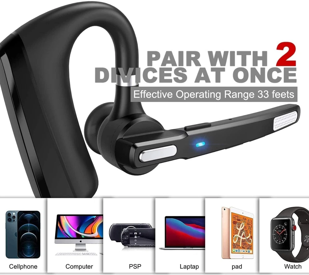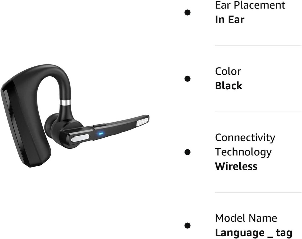 Brand MQQC Model Name language _ tag Color Black Form Factor In Ear Connectivity Technology Bluetooth 5 About this item 【Dual-Mic Noise Cancelling & Clear Sound】The wireless headset Combines 2 built-in HD microphones and advanced CVC8.0 noise reduction technology which can eliminate disruptive background noise without missing any single conversation details even in noisy place. Allows you to enjoy high quality music and clear phone calls wherever. 【Freely Angle & Comfortable Wearing】180° rotatable ear-hook and 270° flexible boom mic can be adjusted and rotated make it friendly to fit a wide range of right/left ear shapes. Weights only 0.46 oz, No more burden on ears even after wearing it for a long time. The eartip come in 3 sizes(Small Medium and Large) that conforms to the shape of either ear for all day stable fit. 【Bluetooth 5.0】Provides fast and stable pairing with any IOS and Android smart phones, tablets, laptops, MP3 players from up to 33' away. It can pair easily with any two Bluetooth devices at once. With up to 24 hours of continuous calls and up to 13.5 days in standby mode, this Bluetooth earpiece lets you make reliable wireless calls throughout the day on a single 2.5 hours quick charge. 【Hands-Free Call & Mute Function】Quickly activate Siri or Google Assistant to make hands free calls. Easy-to-reach buttons let you enjoy real hands-free of wireless for calling.Voice connection status,Equipped with a mute function, press the wireless earbuds power button twice during the call, the other party will not hear your voice, and privacy can be protected under special circumstances. (This function does not support computers.) 【SUPERIOR BATTERY SUPPLY 】150mAh battery capacity, up to 320 hours super long standby time, up to 24 hours of calling, up to 25 hours of playing time, which overcome the difficulty of battery shortage during the business trip, driving, meeting, traveling. We offer 12-month warranty ,If for whatever reason you're not satisfied with your product or experience, simply contact us, we'll get back to you within 24 hours. We 'll try our best effort towards your satisfaction.