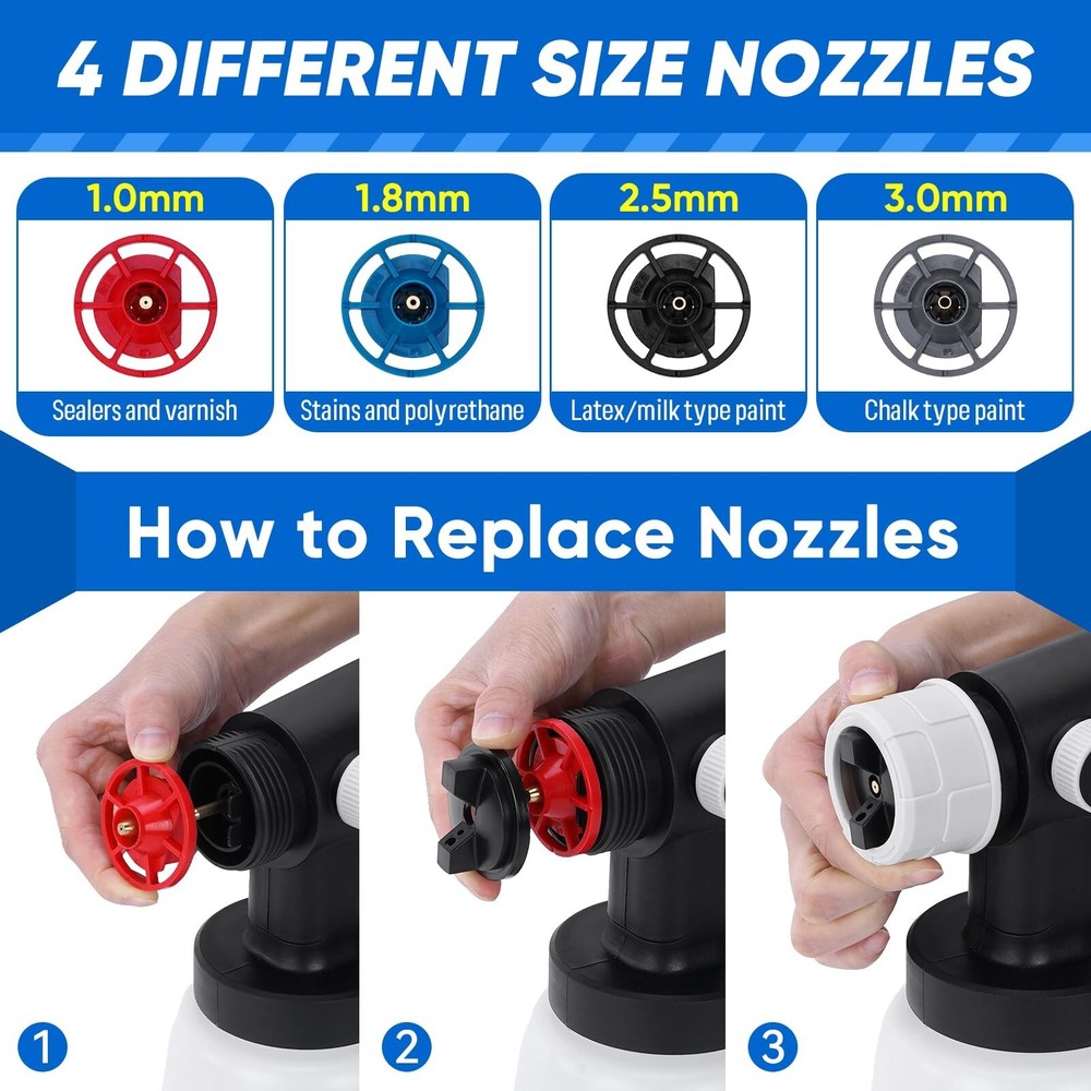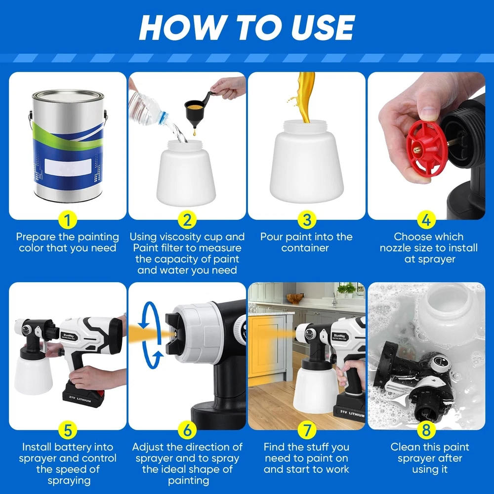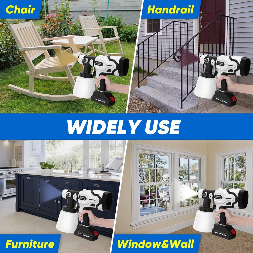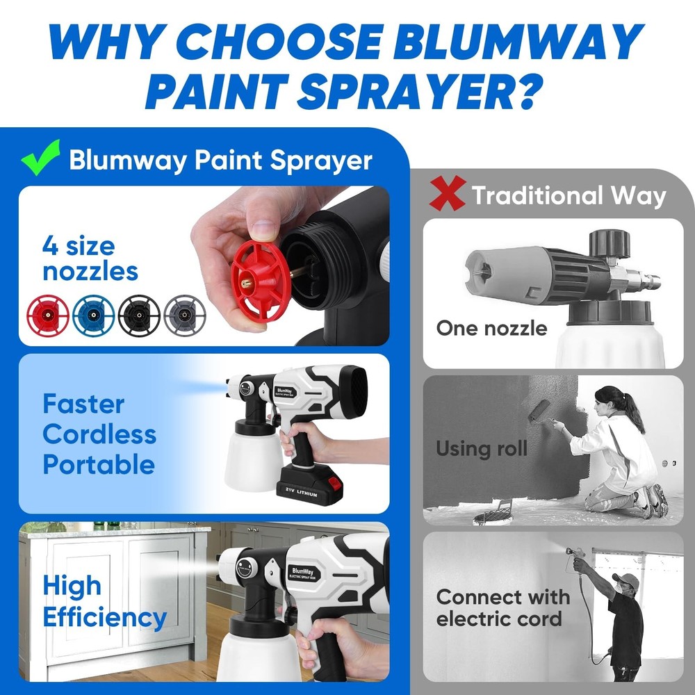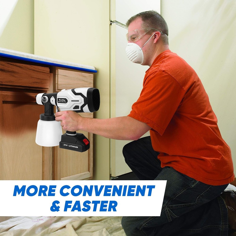 BlumWay Cordless Paint Sprayer,Upgraded HVLP Paint Sprayer with 1L Container, 400W Electric Paint Spray Gun with 4 Copper Nozzles,180° Spray Width for Home Interior, House Painting (with Battery) Product Details Brand: BlumWay Color: White Recommended Uses For Product: Painting Material: Plastic, Metal Style: Gun Brand: BlumWay Color: White Recommended Uses For Product: Painting Material: Plastic, Metal Style: Gun Power Source: Battery Powered Included Components: 1*Electric paint sprayer, 1*Rechargeable battery, 1*Charging plug, 1 *Charging cable, 4*Copper nozzles, 1*Viscosity cup, 2*Paint filters, 1*Stirring stick, 1*Cleaning brusher, 1*Gloves, 1*User manual. Model Name: IT0413 Product Dimensions: 11 x 4 x 10.5 inches Item Weight: 4.55 pounds Manufacturer: BlumWay Country of Origin: China Item model number: IT0413 Batteries: 1 Lithium Ion batteries required. (included) Upgraded Rechargeable Battery Newly cordless paint sprayer with 2000 mAh rechargeable battery.Super practical painting tools,no more troublesome charging cord with sprayer, truely a faster painting tool than roller or brush. Simplely enjoying the convenience of spraying operation with paint sprayer anytime, anywhere! High-power hvlp paint sprayer offer powerful force, painting faster and easier, saving time and energy. High-power Motor & Large Container400W electric paint sprayer comes with stronger copper motor. High-efficiency painting speed than traditional hand tools, saving energy and time. Sprays evenly without leaking, achieving better results on surfaces that need precise spraying, such as walls, ceilings. 1000 ML large capacity of this paint gun, avoiding frequent refilling of paint. Painting faster and easier, our cordless paint sprayer improve the quality of painting work. 180 Spray Width & 4 NozzlesAdjustable 180 spray width knob,perfectly achieving finer spray effects and more coverage.4 sizes of high-quality copper nozzles(1.0mm, 1.8mm, 2.5mm, 3.0mm), 3 adjustable spray patterns(horizontal, vertical, and circular). Spray paint sprayer can meet various spraying scenarios and materials. Suitable for home interior and exterior, house painting,garden,fence,furniture,walls, doors,auto parts spraying,DIY crafts and so on. Adjustable Flow & Efficient SprayingThe paint output of cordless paint sprayer can be controlled by adjusting the flow control knob. Spray paint gun with reasonable control of paint flow can achieve better painting effect and avoid paint waste. Suitable for most paint types such as latex paint, stain, sealant, polyurethane, varnish and chalk paint. Paint sprayer for house painting and home interior,the optimal spray distance is 7.8-11.8 inches. Easy to Use,Carry,CleanBeginner friendly.Easily install battery into spray paint gun,quickly start to work battery paint sprayer. Lightweight paint gun body and easy to carry and do painting work. The cleaning brush and needle is included, you can clean the hardened paint left on the nozzle to avoid clogging. It is vital to clean HVLP paint sprayer after paint job. Note:Motor parts and battery is forbidden to be cleaned with water.Only other parts can be immersed in water for cleaning. What You Will GetOur cordless paint sprayer include: 1*Electric paint sprayer, 1*Rechargeable battery, 1*Charging plug, 1 *Charging cable, 4*Copper nozzles, 1*Viscosity cup, 2*Paint filters, 1*Stirring stick, 1*Cleaning brusher, 1*Gloves, 1*User manual.