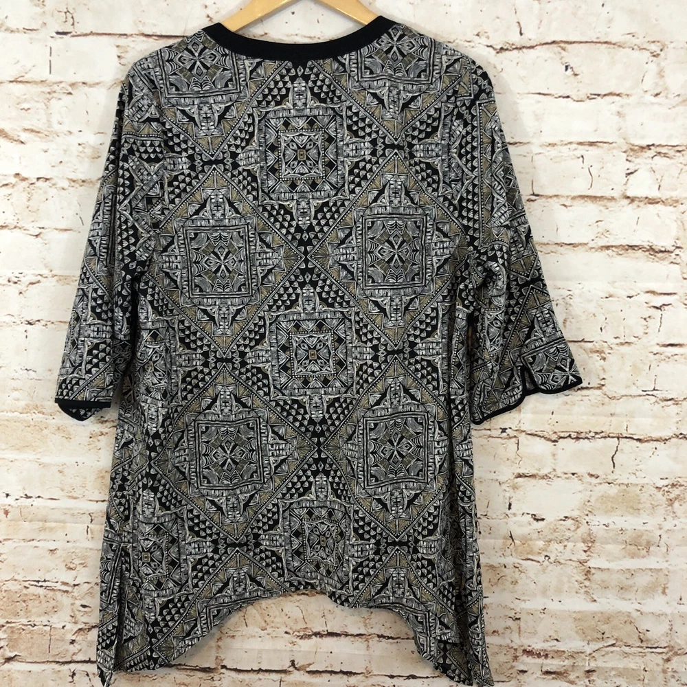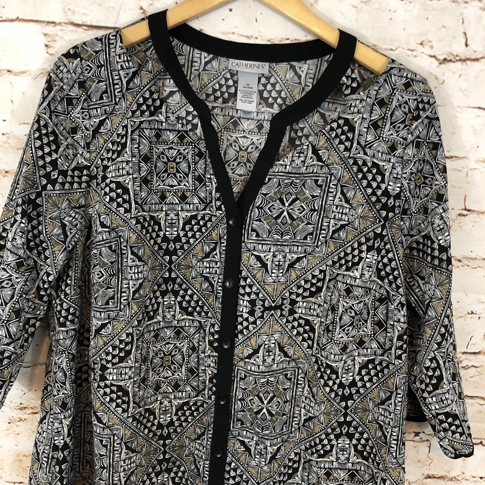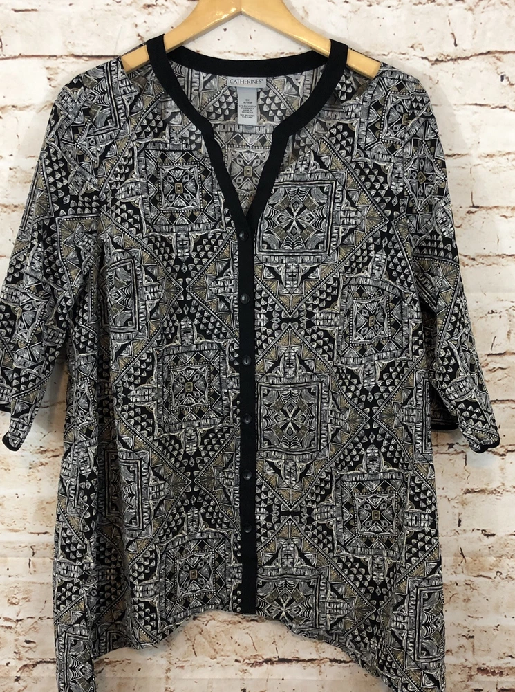 Catheirnes womens size 0X black print shirt top blouse cutout neck detail asymmetrical sharkbite hem button front 3/4 sleeve easy relaxed silhouette 95 cotton 5 spandex Gently pre-owned no flaws Measures approx: armpit to armpit: 23" length: 29"-34"