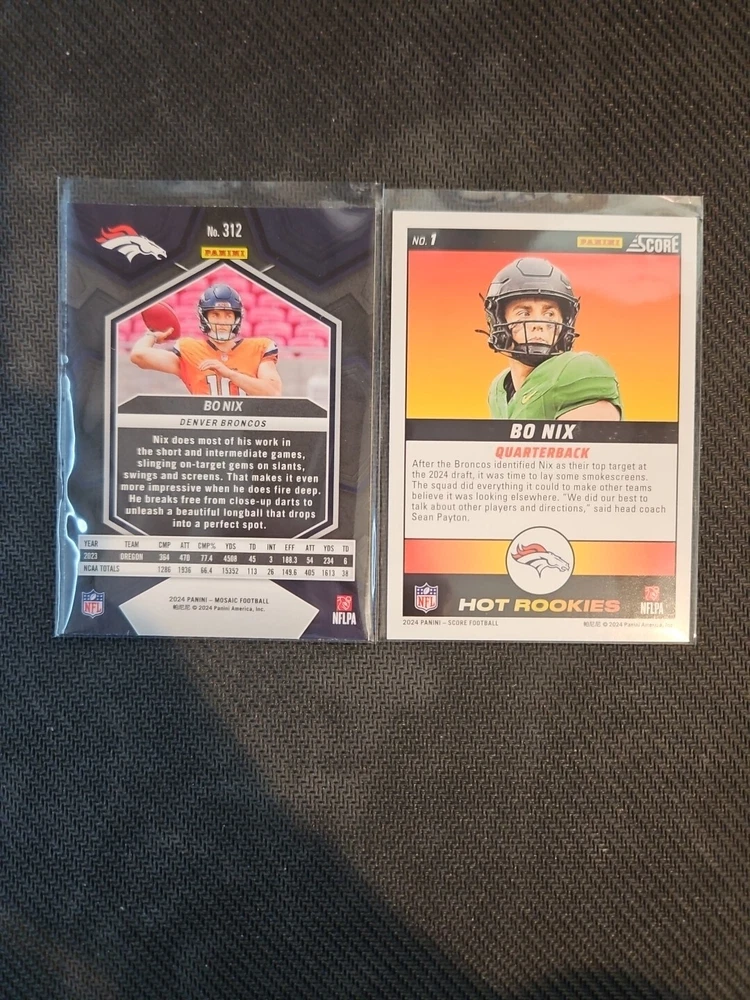 Manufacturer: Panini Year Manufactured: 2024 Set: 2024 mosaic, 2024 score Type: Sports Trading Card Number of Cards: 2 Player/Athlete: Bo Nix League: National Football League (NFL) Sport: Football Season: 2024