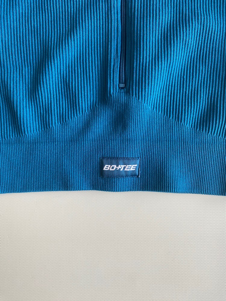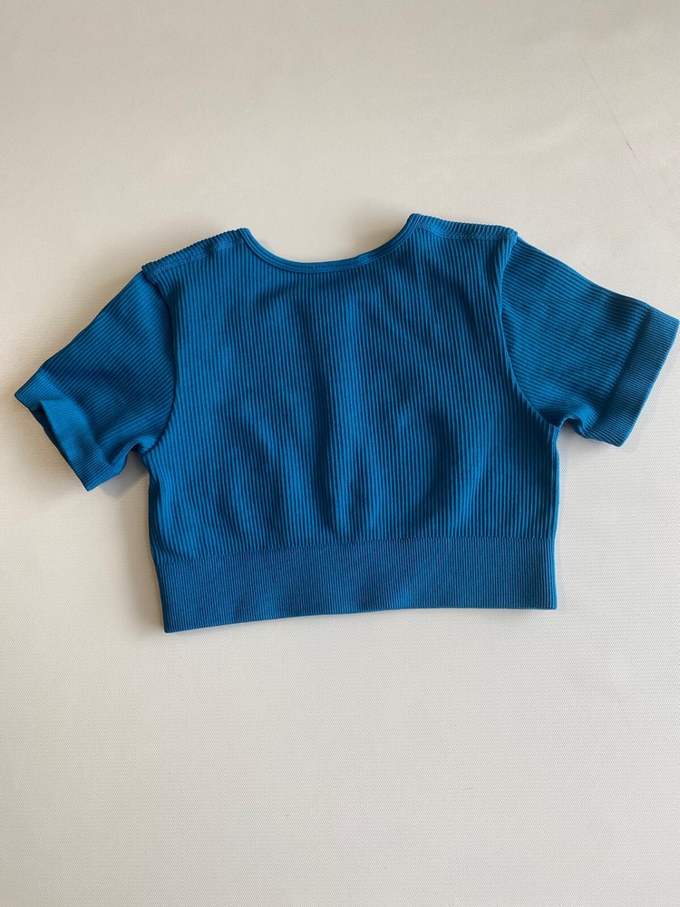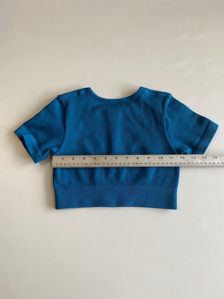 This Bo + Tee Crop Top is perfect for athletic women who want to look stylish during their workouts. The top features a round neckline and a zip closure, making it easy to put on and take off. It is made of a cotton, polyester, and spandex blend fabric that is lightweight, stretchy, and wrinkle-resistant. The ribbed pattern adds a touch of texture to the design, while the blue color gives it a sporty vibe. The top is slim-fitting and cropped, making it ideal for summer, fall, and spring seasons. It is machine washable and easy to care for. Whether you are into gym and training, cycling, cross-training, CrossFit, yoga, or pilates, this top is perfect for you. Condition of the item is Pre-Owned in great shape! Shipped asap by First Class Mail.