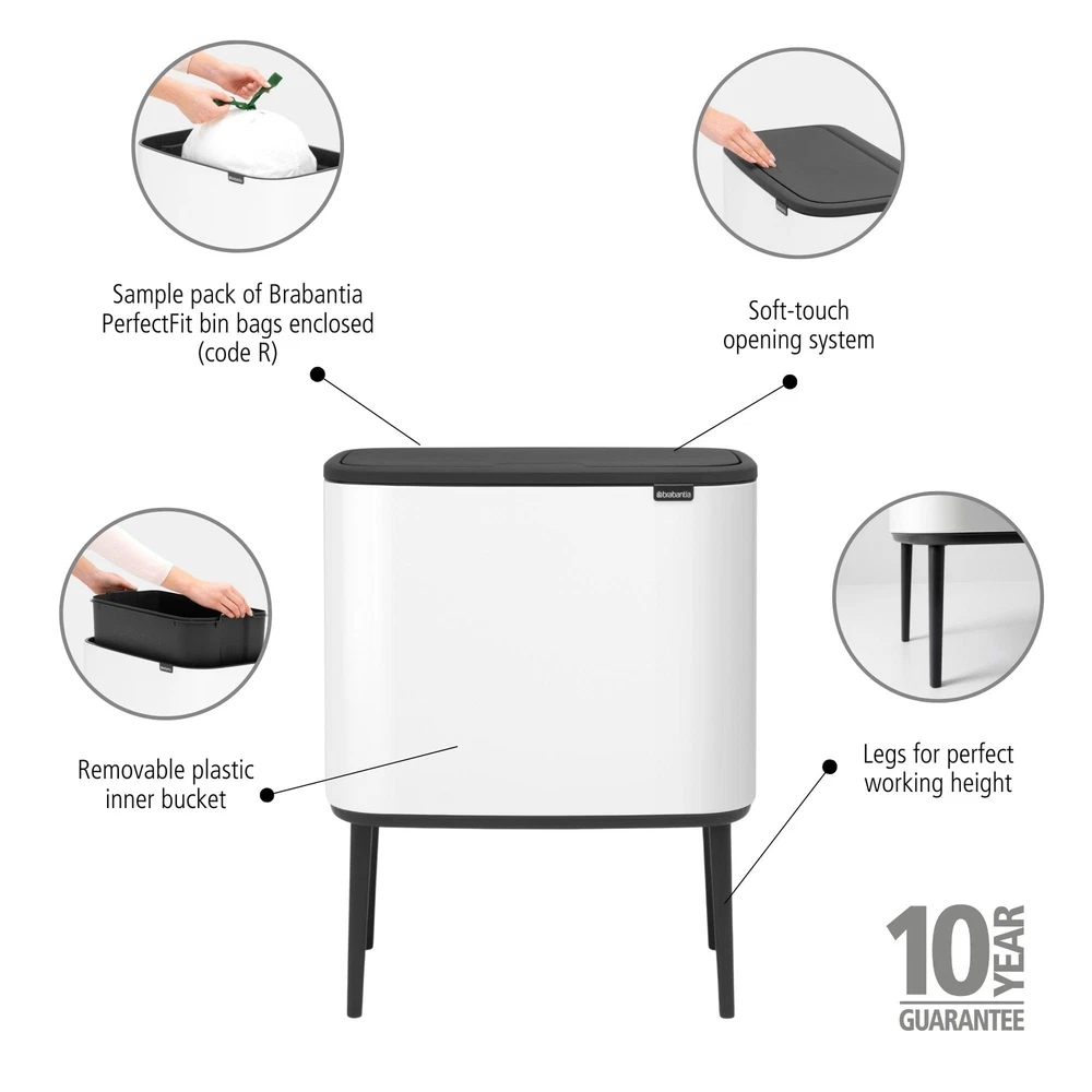 Looking for a waste solution that matches your style? This Bo Touch Trash Can combines a beautiful design with 9.5 gallons of capacity. It is designed with love for your home and care for our planet. This space-saving can fits perfectly against a wall, and is very stable, thanks to the adjustable non-skid legs. Its unique soft-touch opening makes for easy and light operation at the touch of your hand. Go Bo! Large capacity: 9.5 Gallon (1 removable inner bucket) Opens at the lightest touch - soft-touch opening system. Hygenic and easy to clean - removable plastic inner bucket. Dimensions: H26.8 x W21.3 x D12.4 in. 10 year guarantee and cradle-to-cradle certified