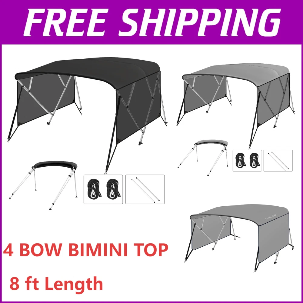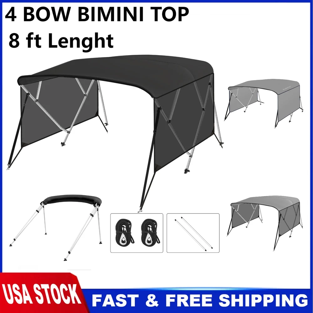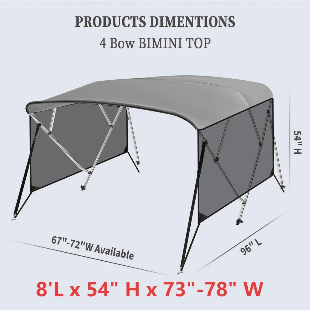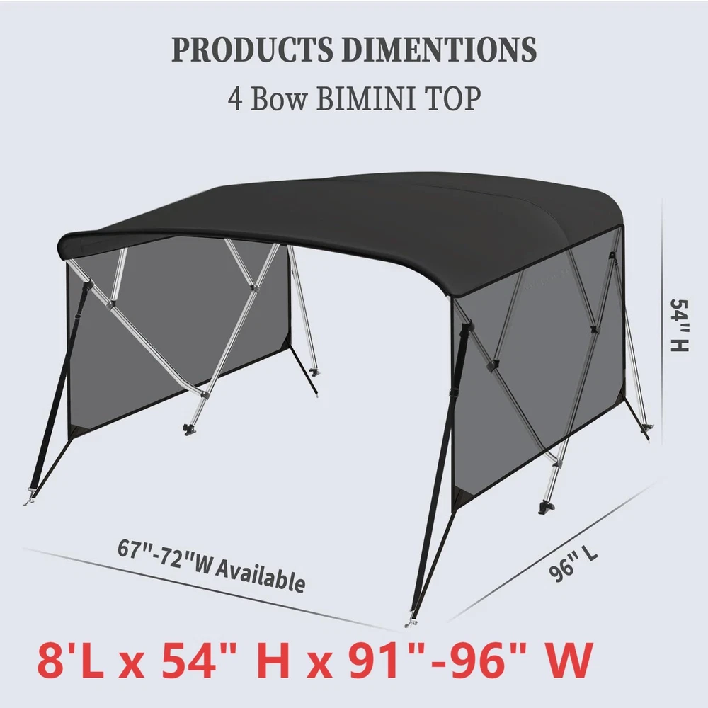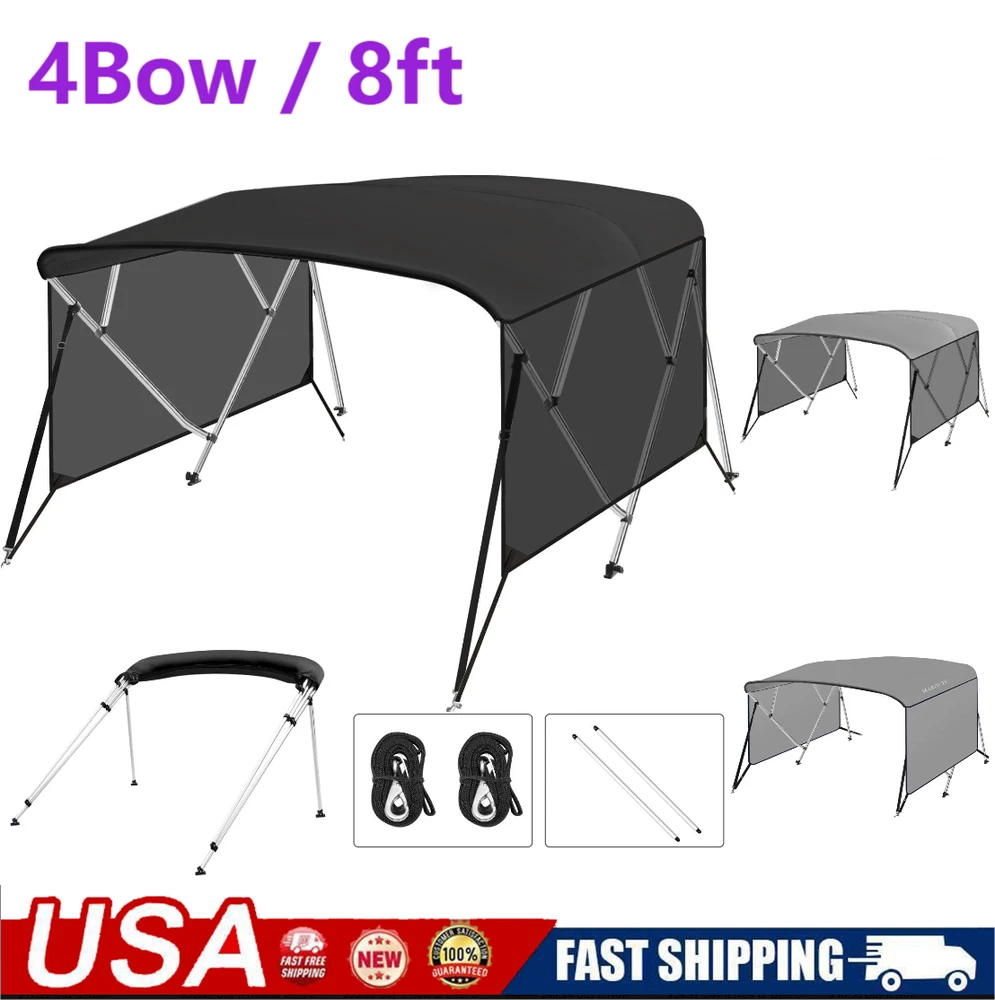 Boat Bimini Top 4 Bow Canopy Cover 8ft Long With Frame & Rear Poles & Sidewalls Bimini Tops for Boats 4 Bow Boat Canopy Marine Grade Canvas & PU-Coated Fabric,with 2 Removable Light Transmission Side Curtains Premium Marine-Grade Fabric & Removable Side Panels: Crafted from heavy-duty 600D marine-grade fabric with dual-layer 1200mm PU waterproof coating and reinforced double-stitched seams, this boat canopy delivers unmatched durability and weather resistance. The detachable side panels feature heavy-duty zippers for effortless installation or removal—adjust airflow and shade on one or both sides in seconds. Bimini Tops for Boats 4 Bow Boat Canopy Marine Grade Canvas & PU-Coated Fabric,with 2 Removable Light Transmission Side Curtains Adjustable Reinforced Support System: Designed with 2 sturdy rear support poles, this bimini top offers enhanced stability in windy conditions. When shade isn’t needed, simply fold back the canopy without disassembling—quick and hassle-free storage. Bimini Tops for Boats 4 Bow Boat Canopy Marine Grade Canvas & PU-Coated Fabric,with 2 Removable Light Transmission Side Curtains Ultra-Strong Aircraft-Grade Frame: Includes 2 rear support poles, 2 adjustable tie-down straps, and a storage bag for compact transport. Built with 1" diameter 6000-series aluminum alloy tubing (1.5mm thick), the 4-bow frame provides exceptional strength while remaining lightweight. Corrosion-resistant and built to last, it withstands harsh marine environments. Bimini Tops for Boats 4 Bow Boat Canopy Marine Grade Canvas & PU-Coated Fabric,with 2 Removable Light Transmission Side Curtains Ideal for Sun & Rain Protection: Whether cruising, fishing, or anchored, this bimini top delivers superior UV defense and waterproof shelter. Upgrade your boating experience with premium durability, smart adjustability, and hassle-free setup!(Note: Mounting hardware included. Fits most standard boat deck configurations.) Product Description: Premium Marine-Grade Fabric & Removable Side Panels : Crafted from heavy-duty 600D marine-grade fabric with dual-layer 1200mm PU waterproof coating and reinforced double-stitched seams, this boat canopy delivers unmatched durability and weather resistance. The detachable side panels feature heavy-duty zippers for effortless installation or removal—adjust airflow and shade on one or both sides in seconds. Adjustable Reinforced Support System: Designed with 2 sturdy rear support poles, this bimini top offers enhanced stability in windy conditions. When shade isn’t needed, simply fold back the canopy without disassembling—quick and hassle-free storage. Ultra-Strong Aircraft-Grade Frame : Includes 2 rear support poles, 2 adjustable tie-down straps, and a storage bag for compact transport. Built with 1" diameter 6000-series aluminum alloy tubing (1.5mm thick), the 4-bow frame provides exceptional strength while remaining lightweight. Corrosion-resistant and built to last, it withstands harsh marine environments. Custom Fit for Your Boat: Available in multiple widths to fit most boats:8’L x 54"H x 67"-72"W to 8’L x 54"H x 91"-96"W.Measure your boat’s deck width before ordering to ensure a perfect fit. Ideal for Sun & Rain Protection: Whether cruising, fishing, or anchored, this bimini top delivers superior UV defense and waterproof shelter. Upgrade your boating experience with premium durability, smart adjustability, and hassle-free setup!(Note: Mounting hardware included. Fits most standard boat deck configurations.) Payment Delivery details Terms of sales About us Contact us Payment We accept payment either via PayPal or any of the following credit cards; Visa, MasterCard, Discover, and American Express. Delivery details 1. We will delivery out at the handing time when we receive the payment. 2. The delivery time is 3-5 business days to US by usually time.The parcel maybe delay 1-2day of the weekend.Due to the bad weather,Holidays,Hot Season ect.the parcel maybe delay,If you have any problems,mssage us,we will try our best to solve it. 3. We ship to your eBay address. Please make sure your eBay address is correct before you pay. 4. If you want to change the shipping address,message us before our send out. Terms of sales If you are not satisfied with the item for any reason, please do not quick to leave negative/neutral feedback even open request and case without any communication with us. We devote ourselves making EVERY CUSTOMER in 100% Satisfactory and resolve any problem. Thank you for your understanding and recognition,we are always leave positive feedback to all our customers. About Reply: All replies will be sent to your email box, if you do not get response within 24 hours (Sat. & Sun. excluded) please check your eBay My Messages in case that our emails will be filtered automatically by your settings. About us skybridge99 is a brand new store but we are one of North America’s top online suppliers of specialized, high-quality aftermarket online retailers and suppliers, committed to developing new markets. We primarily offers tool sets, auto parts, home goods, etc..With over 20 years of product selection and manufacturing experience, we delivers unparalleled quality, value, service and satisfaction. Our highly-trained, professional staff offer in-depth knowledge and personalized assistance for customers worldwide. Providing our customers with a simple, hassle-free experience with best-in-class customer service is more than a goal. Contact us Any problem please rest assure to contact us by eBay message first. We will reply you as soon as we can. We will deal with it within 24hs on working days.