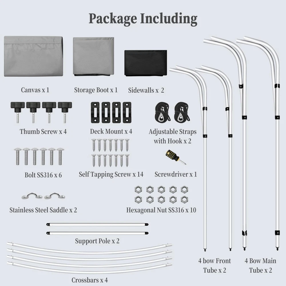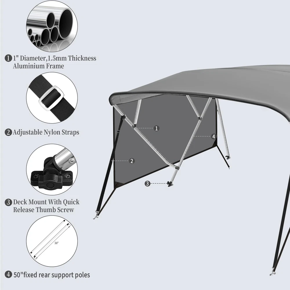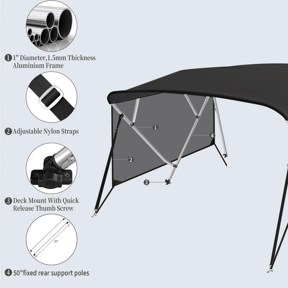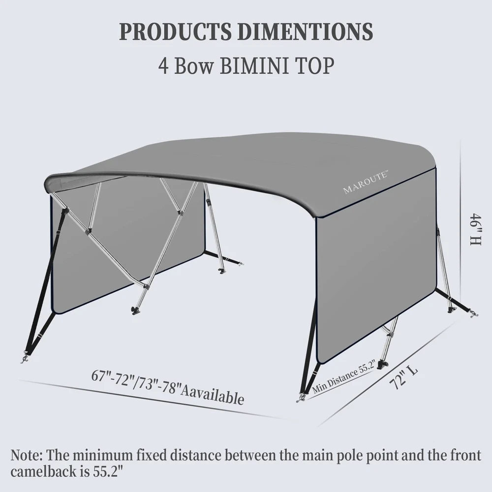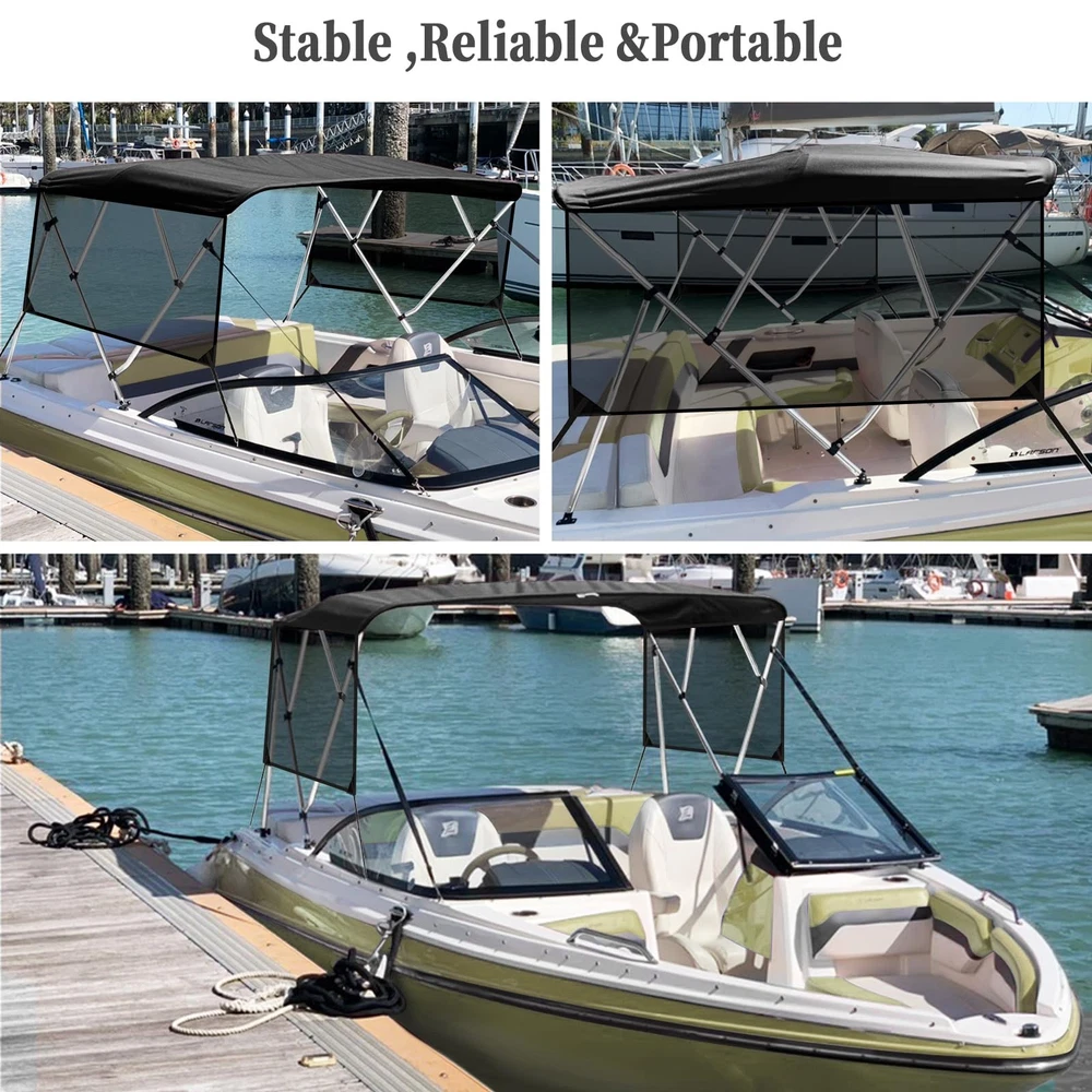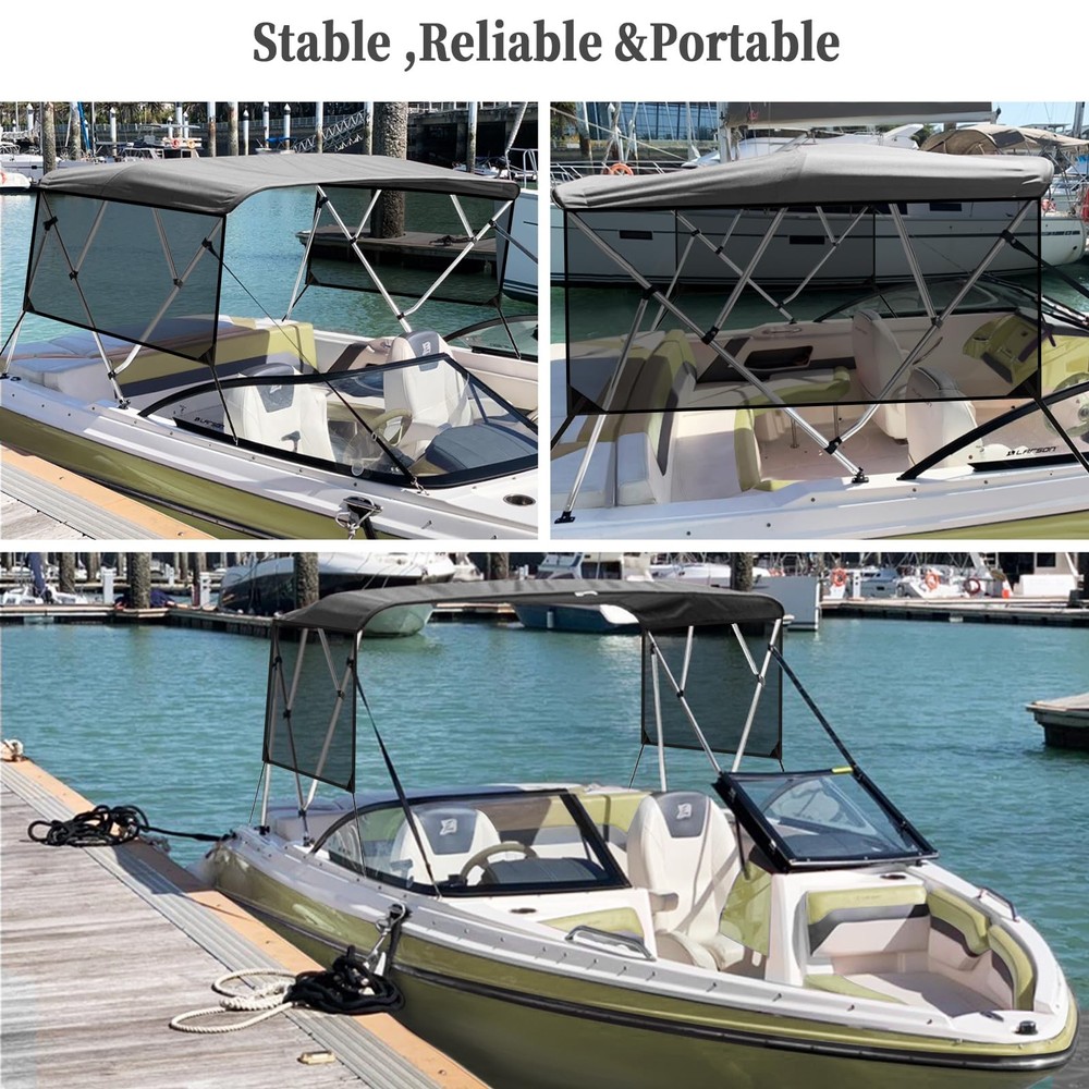 Boat Bimini Top 4 Bow Canopy Cover 8ft Long With Frame & Rear Poles & Sidewalls Bimini Tops for Boats 4 Bow Boat Canopy Marine Grade Canvas & PU-Coated Fabric,with 2 Removable Light Transmission Side Curtains Premium Marine-Grade Fabric & Removable Side Panels: Crafted from heavy-duty 600D marine-grade fabric with dual-layer 1200mm PU waterproof coating and reinforced double-stitched seams, this boat canopy delivers unmatched durability and weather resistance. The detachable side panels feature heavy-duty zippers for effortless installation or removal—adjust airflow and shade on one or both sides in seconds. Bimini Tops for Boats 4 Bow Boat Canopy Marine Grade Canvas & PU-Coated Fabric,with 2 Removable Light Transmission Side Curtains Adjustable Reinforced Support System: Designed with 2 sturdy rear support poles, this bimini top offers enhanced stability in windy conditions. When shade isn’t needed, simply fold back the canopy without disassembling—quick and hassle-free storage. Bimini Tops for Boats 4 Bow Boat Canopy Marine Grade Canvas & PU-Coated Fabric,with 2 Removable Light Transmission Side Curtains Ultra-Strong Aircraft-Grade Frame: Includes 2 rear support poles, 2 adjustable tie-down straps, and a storage bag for compact transport. Built with 1" diameter 6000-series aluminum alloy tubing (1.5mm thick), the 4-bow frame provides exceptional strength while remaining lightweight. Corrosion-resistant and built to last, it withstands harsh marine environments. Bimini Tops for Boats 4 Bow Boat Canopy Marine Grade Canvas & PU-Coated Fabric,with 2 Removable Light Transmission Side Curtains Ideal for Sun & Rain Protection: Whether cruising, fishing, or anchored, this bimini top delivers superior UV defense and waterproof shelter. Upgrade your boating experience with premium durability, smart adjustability, and hassle-free setup!(Note: Mounting hardware included. Fits most standard boat deck configurations.) Product Description: Premium Marine-Grade Fabric & Removable Side Panels : Crafted from heavy-duty 600D marine-grade fabric with dual-layer 1200mm PU waterproof coating and reinforced double-stitched seams, this boat canopy delivers unmatched durability and weather resistance. The detachable side panels feature heavy-duty zippers for effortless installation or removal—adjust airflow and shade on one or both sides in seconds. Adjustable Reinforced Support System: Designed with 2 sturdy rear support poles, this bimini top offers enhanced stability in windy conditions. When shade isn’t needed, simply fold back the canopy without disassembling—quick and hassle-free storage. Ultra-Strong Aircraft-Grade Frame : Includes 2 rear support poles, 2 adjustable tie-down straps, and a storage bag for compact transport. Built with 1" diameter 6000-series aluminum alloy tubing (1.5mm thick), the 4-bow frame provides exceptional strength while remaining lightweight. Corrosion-resistant and built to last, it withstands harsh marine environments. Custom Fit for Your Boat: Available in multiple widths to fit most boats:8’L x 54"H x 67"-72"W to 8’L x 54"H x 91"-96"W.Measure your boat’s deck width before ordering to ensure a perfect fit. Ideal for Sun & Rain Protection: Whether cruising, fishing, or anchored, this bimini top delivers superior UV defense and waterproof shelter. Upgrade your boating experience with premium durability, smart adjustability, and hassle-free setup!(Note: Mounting hardware included. Fits most standard boat deck configurations.) Payment Delivery details Terms of sales About us Contact us Payment We accept payment either via PayPal or any of the following credit cards; Visa, MasterCard, Discover, and American Express. Delivery details 1. We will delivery out at the handing time when we receive the payment. 2. The delivery time is 3-5 business days to US by usually time.The parcel maybe delay 1-2day of the weekend.Due to the bad weather,Holidays,Hot Season ect.the parcel maybe delay,If you have any problems,mssage us,we will try our best to solve it. 3. We ship to your eBay address. Please make sure your eBay address is correct before you pay. 4. If you want to change the shipping address,message us before our send out. Terms of sales If you are not satisfied with the item for any reason, please do not quick to leave negative/neutral feedback even open request and case without any communication with us. We devote ourselves making EVERY CUSTOMER in 100% Satisfactory and resolve any problem. Thank you for your understanding and recognition,we are always leave positive feedback to all our customers. About Reply: All replies will be sent to your email box, if you do not get response within 24 hours (Sat. & Sun. excluded) please check your eBay My Messages in case that our emails will be filtered automatically by your settings. About us skybridge99 is a brand new store but we are one of North America’s top online suppliers of specialized, high-quality aftermarket online retailers and suppliers, committed to developing new markets. We primarily offers tool sets, auto parts, home goods, etc..With over 20 years of product selection and manufacturing experience, we delivers unparalleled quality, value, service and satisfaction. Our highly-trained, professional staff offer in-depth knowledge and personalized assistance for customers worldwide. Providing our customers with a simple, hassle-free experience with best-in-class customer service is more than a goal. Contact us Any problem please rest assure to contact us by eBay message first. We will reply you as soon as we can. We will deal with it within 24hs on working days.
