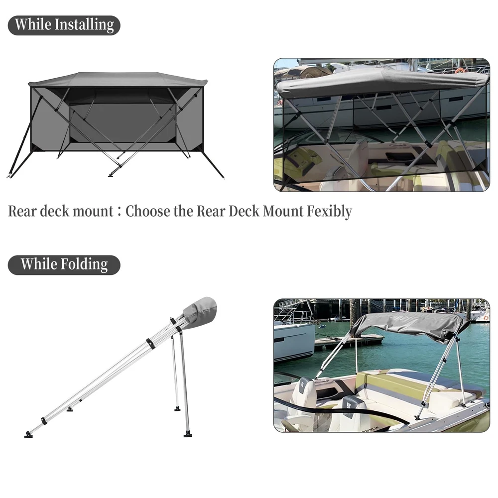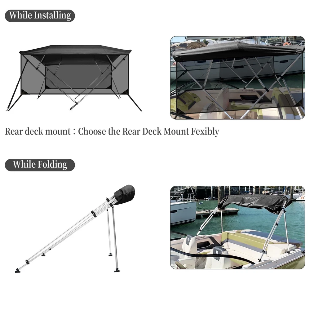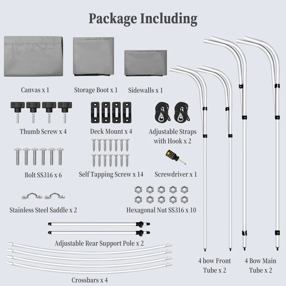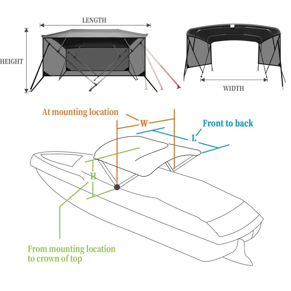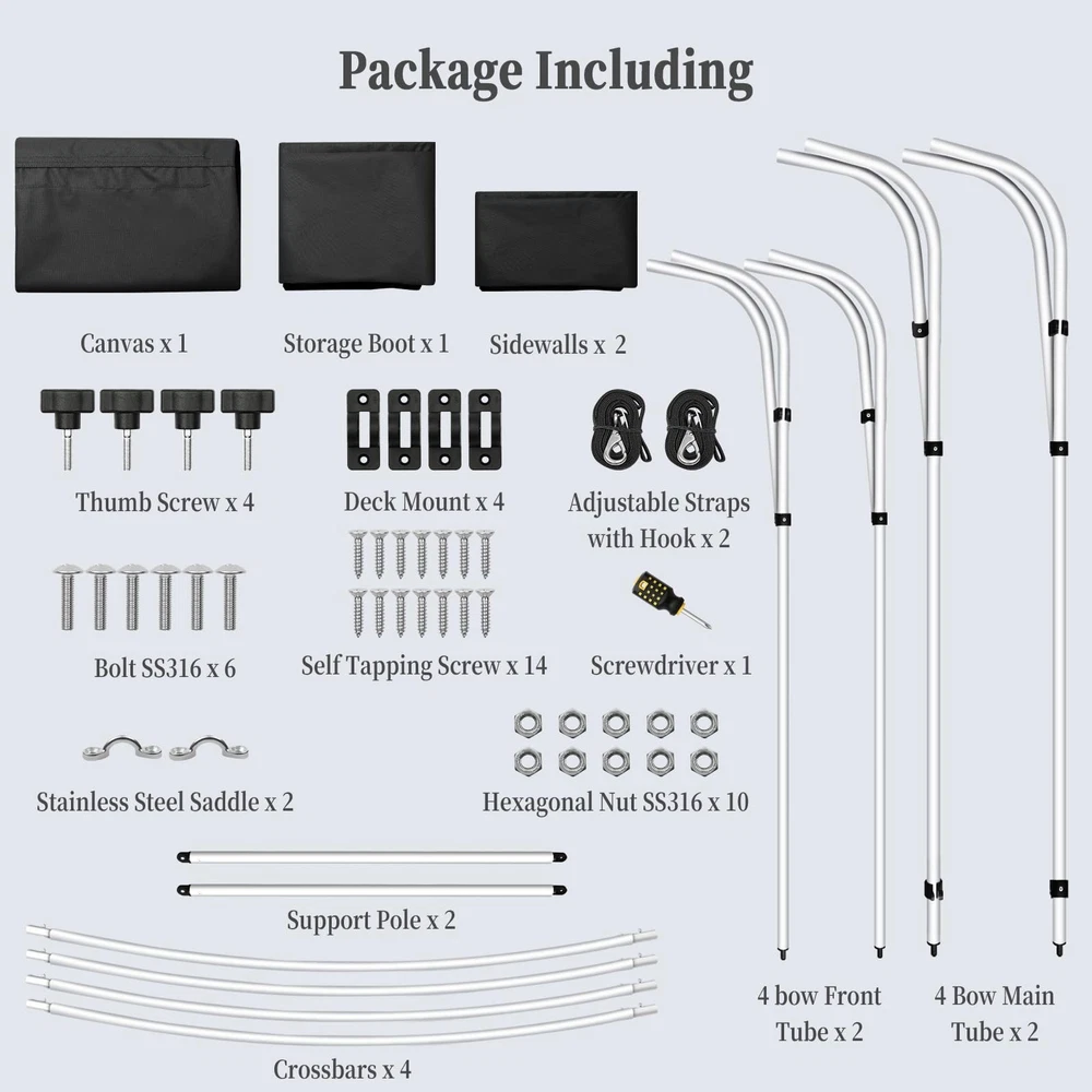 Boat Bimini Top 4 Bow Canopy Cover 8ft Long With Frame & Rear Poles & Sidewalls Bimini Tops for Boats 4 Bow Boat Canopy Marine Grade Canvas & PU-Coated Fabric,with 2 Removable Light Transmission Side Curtains Premium Marine-Grade Fabric & Removable Side Panels: Crafted from heavy-duty 600D marine-grade fabric with dual-layer 1200mm PU waterproof coating and reinforced double-stitched seams, this boat canopy delivers unmatched durability and weather resistance. The detachable side panels feature heavy-duty zippers for effortless installation or removal—adjust airflow and shade on one or both sides in seconds. Bimini Tops for Boats 4 Bow Boat Canopy Marine Grade Canvas & PU-Coated Fabric,with 2 Removable Light Transmission Side Curtains Adjustable Reinforced Support System: Designed with 2 sturdy rear support poles, this bimini top offers enhanced stability in windy conditions. When shade isn’t needed, simply fold back the canopy without disassembling—quick and hassle-free storage. Bimini Tops for Boats 4 Bow Boat Canopy Marine Grade Canvas & PU-Coated Fabric,with 2 Removable Light Transmission Side Curtains Ultra-Strong Aircraft-Grade Frame: Includes 2 rear support poles, 2 adjustable tie-down straps, and a storage bag for compact transport. Built with 1" diameter 6000-series aluminum alloy tubing (1.5mm thick), the 4-bow frame provides exceptional strength while remaining lightweight. Corrosion-resistant and built to last, it withstands harsh marine environments. Bimini Tops for Boats 4 Bow Boat Canopy Marine Grade Canvas & PU-Coated Fabric,with 2 Removable Light Transmission Side Curtains Ideal for Sun & Rain Protection: Whether cruising, fishing, or anchored, this bimini top delivers superior UV defense and waterproof shelter. Upgrade your boating experience with premium durability, smart adjustability, and hassle-free setup!(Note: Mounting hardware included. Fits most standard boat deck configurations.) Product Description: Premium Marine-Grade Fabric & Removable Side Panels : Crafted from heavy-duty 600D marine-grade fabric with dual-layer 1200mm PU waterproof coating and reinforced double-stitched seams, this boat canopy delivers unmatched durability and weather resistance. The detachable side panels feature heavy-duty zippers for effortless installation or removal—adjust airflow and shade on one or both sides in seconds. Adjustable Reinforced Support System: Designed with 2 sturdy rear support poles, this bimini top offers enhanced stability in windy conditions. When shade isn’t needed, simply fold back the canopy without disassembling—quick and hassle-free storage. Ultra-Strong Aircraft-Grade Frame : Includes 2 rear support poles, 2 adjustable tie-down straps, and a storage bag for compact transport. Built with 1" diameter 6000-series aluminum alloy tubing (1.5mm thick), the 4-bow frame provides exceptional strength while remaining lightweight. Corrosion-resistant and built to last, it withstands harsh marine environments. Custom Fit for Your Boat: Available in multiple widths to fit most boats:8’L x 54"H x 67"-72"W to 8’L x 54"H x 91"-96"W.Measure your boat’s deck width before ordering to ensure a perfect fit. Ideal for Sun & Rain Protection: Whether cruising, fishing, or anchored, this bimini top delivers superior UV defense and waterproof shelter. Upgrade your boating experience with premium durability, smart adjustability, and hassle-free setup!(Note: Mounting hardware included. Fits most standard boat deck configurations.) Payment Delivery details Terms of sales About us Contact us Payment We accept payment either via PayPal or any of the following credit cards; Visa, MasterCard, Discover, and American Express. Delivery details 1. We will delivery out at the handing time when we receive the payment. 2. The delivery time is 3-5 business days to US by usually time.The parcel maybe delay 1-2day of the weekend.Due to the bad weather,Holidays,Hot Season ect.the parcel maybe delay,If you have any problems,mssage us,we will try our best to solve it. 3. We ship to your eBay address. Please make sure your eBay address is correct before you pay. 4. If you want to change the shipping address,message us before our send out. Terms of sales If you are not satisfied with the item for any reason, please do not quick to leave negative/neutral feedback even open request and case without any communication with us. We devote ourselves making EVERY CUSTOMER in 100% Satisfactory and resolve any problem. Thank you for your understanding and recognition,we are always leave positive feedback to all our customers. About Reply: All replies will be sent to your email box, if you do not get response within 24 hours (Sat. & Sun. excluded) please check your eBay My Messages in case that our emails will be filtered automatically by your settings. About us skybridge99 is a brand new store but we are one of North America’s top online suppliers of specialized, high-quality aftermarket online retailers and suppliers, committed to developing new markets. We primarily offers tool sets, auto parts, home goods, etc..With over 20 years of product selection and manufacturing experience, we delivers unparalleled quality, value, service and satisfaction. Our highly-trained, professional staff offer in-depth knowledge and personalized assistance for customers worldwide. Providing our customers with a simple, hassle-free experience with best-in-class customer service is more than a goal. Contact us Any problem please rest assure to contact us by eBay message first. We will reply you as soon as we can. We will deal with it within 24hs on working days.