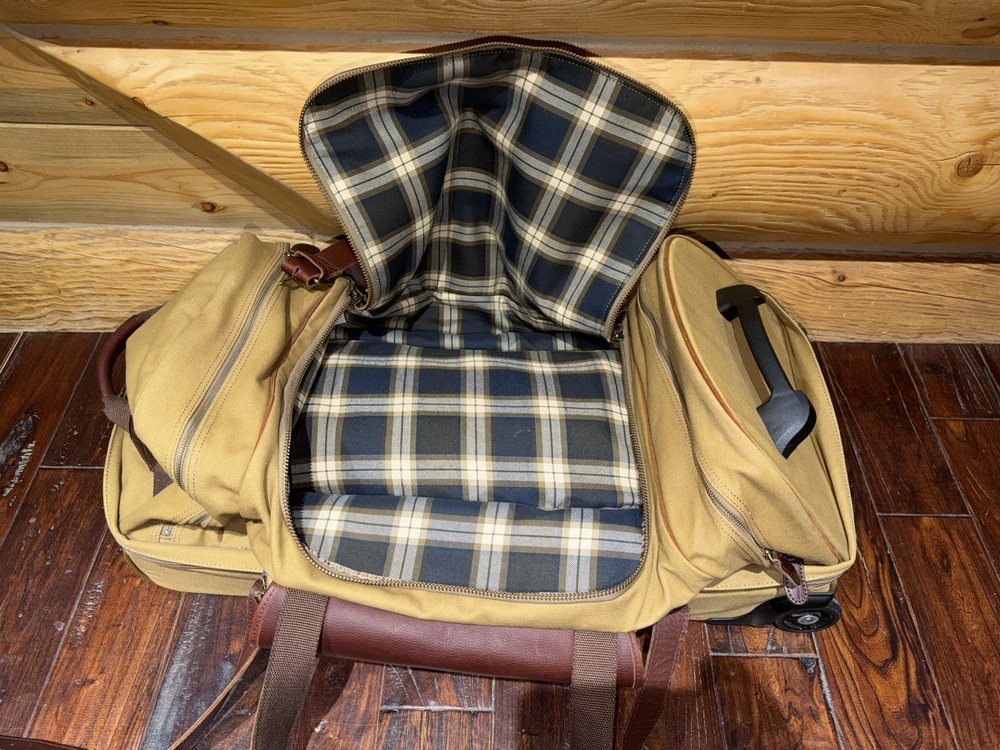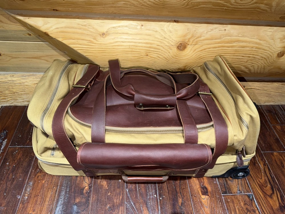 New Never Used!! The Bob Timberlake Large Tan Canvas Leather Wheeled Duffle Luggage is a stylish and durable travel bag designed for the modern individual. Made of high-quality leather with a solid brown color, this large duffle bag features convenient wheels for easy rolling transport. The unisex adult design makes it suitable for anyone looking for a reliable and fashionable luggage option. Perfect for weekend getaways or business trips, this duffle bag combines functionality with a touch of luxury.