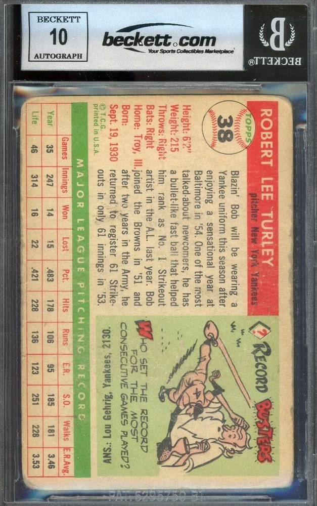 Bob Turley Gem Mint 10 Beckett BAS Signed 1955 Topps Autograph PHOTO: DESCRIPTION: FULLY CERTED BECKETT SLABBED AUTHENTIC SIGNED SPORTSCARD FROM THE INTERNETS # SELLER OF AUTHENTIC SIGNATURES SHIPPING & PAYMENT: thanks for looking. All items are mailed within 24 hrs of payment , most within a few hours.We combine shipping so if you have more than one item request total when done.We combine shipping at about .50 extra a piece to point then free.Feel free to ask . International shipping rates have gone up this year, we will ship at the cost we pay.Most will be between 6-12.00 for like slabbed cards to a baseball. Feel free to email any questions about items or to talk collectibles, thanks always!!!! This listing created with GLETech Multiple Selling Channel tools.