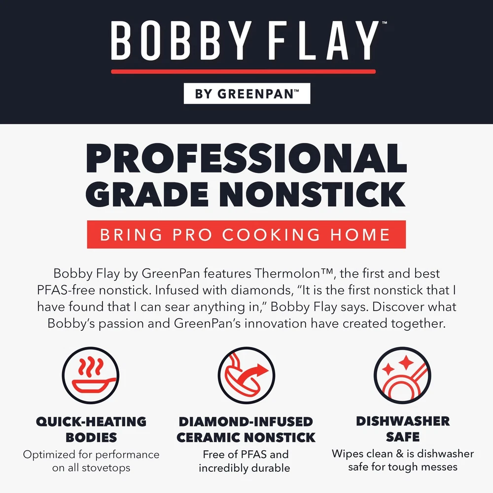 BOBBY FLAY x : Legendary chef Bobby Flay partnered with to create innovative cookware that brings pro cooking to any home REINFORCED WITH DIAMONDS: This collection features ’s diamond-infused ceramic nonstick for incredible release, remarkable durability, and professional performance TOXIN-FREE: 's signature healthy ceramic nonstick coating is free of PFAS, PFOA, lead, and cadmium STAY-COOL CHEF HANDLE: Inspired by restaurant kitchens, this pan has a long chef handle with a stay-cool silicone grip that gives you total control and amazing comfort QUICK-HEATING BODY: Quick-heating body lets you better control your heat so you can dial in the right temp for your meal CHIP-FREE RIM: An ingenious, thoughtfully designed chip-free rim add extra strength and durability INDUCTION READY: Bring pro cooking where you need it: suitable for all stovetops including gas, electric, even induction, and oven safe up to 392˚F EASY TO CLEAN: Dishwasher safe and easy to clean for simple cleanup