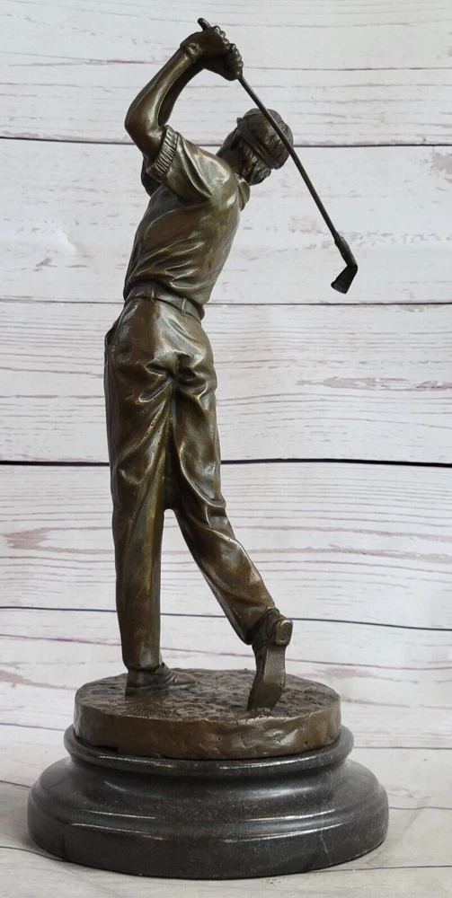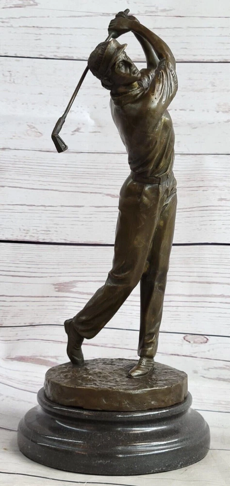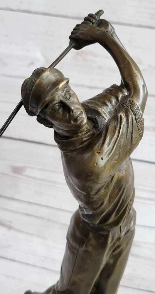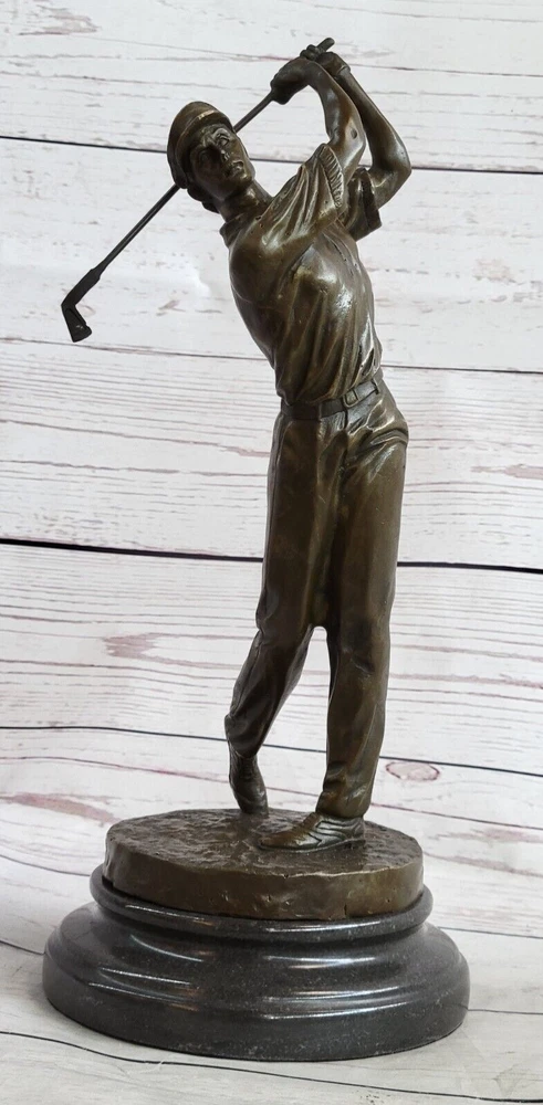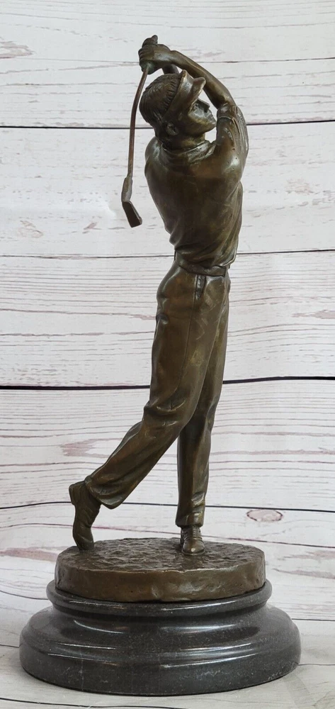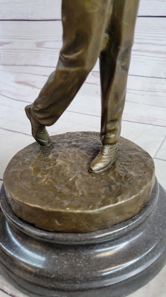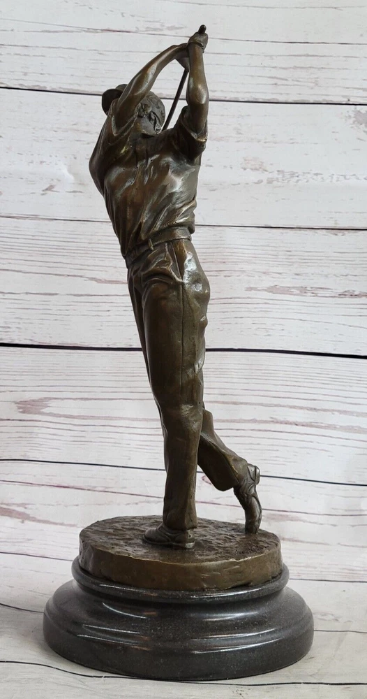 Bobby Jones Golfer Golf Club Collector Sports Memorabilia Bronze Marble Decor Bobby Jones Golfer Golf Club Collector Sports Memorabilia Bronze Marble Decor Condition : This sculpture is in perfect condition Bronze Dimensions with Marble Base: Height 13" X Width 6" Marble Dimensions: Diameter 6" Height without base:12" Weight:9 LBS Inventory:26YRD3954062 Immerse yourself in the world of golf with this captivating bronze sculpture. Depicting a skilled golfer in action, the sculpture captures the intensity and focus of the player as he watches his ball soar through the air. With his head tilted upwards, his eyes track the trajectory of the ball, calculating his next move. His body is poised with precision, reflecting his expertise and dedication to the game. Every detail of the golfer's form and attire is meticulously crafted, from the ripples in his clothes to the texture of the manicured grass beneath his feet. The sculpture is a testament to the artist's skill and attention to detail. Made from 100% bronze, it showcases the beauty and timeless allure of this noble sport. Created using the revered "Lost Wax Method," the sculpture bears the signature of the renowned artist Milo, guaranteeing its authenticity and artistic value. Mounted on a marble base, this sculpture exudes elegance and stability. Whether displayed in a golf enthusiast's collection, a sports-themed room, or as a centerpiece in a golf club, this bronze sculpture captures the spirit and passion of the game. It invites admiration and serves as a reminder of the precision and strategy that golf demands, making it a cherished addition to any space. Golfer Golf Bronze Marble Statue Club Trophy Tournament PGA Art Birthday Gift www.bronzhaus.com Video will open in a new window Using the eBay App? Paste link into a browser window: [isdntekvideo] Shipping Terms : Most of our items are shipped via USPS (United States Postal Service) mail or UPS. Most orders are shipped within 24-48 hours of purchase. Please be aware that not all items are available for USPS shipping due to size and weight. We do ship to Hawaii, Alaska, Canada, Puerto Rico, APO/AE, and U.S. Virgin Islands, however, an additional charge may be required. Please contact us before making any purchases in these areas. For Non-USA customers, you may be responsible for all duty, tax, brokerage fees that may be due upon delivery (shipping costs cover freight charges only). We also ship internationally. Please refer to the "Shipping and Handling" chart for the rates for each area. Payment : We accept just about any form of payment. PayPal, Master Card, Visa or American Express credit cards. Money orders, cashiers checks, and even personal or business checks. For governmental institutions, we will also accept a purchase order. Please understand that for personal or business checks we have to wait for the check to clear (usually 7 days) before shipping. Condition : New Detailed Hand Crafted Hot Cast Bronze Satisfaction Guaranteed. This is Stock Photo, Slight Color Variation!! Listing and template services provided by inkFrog