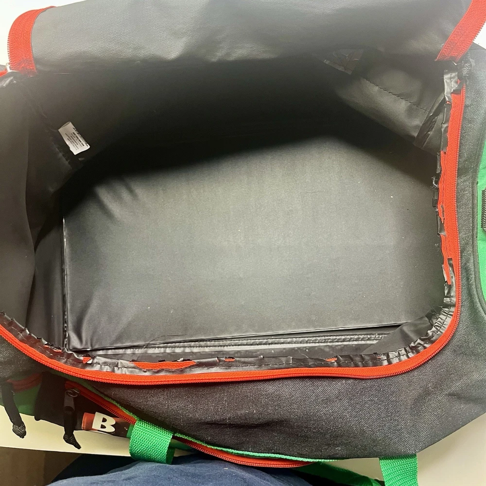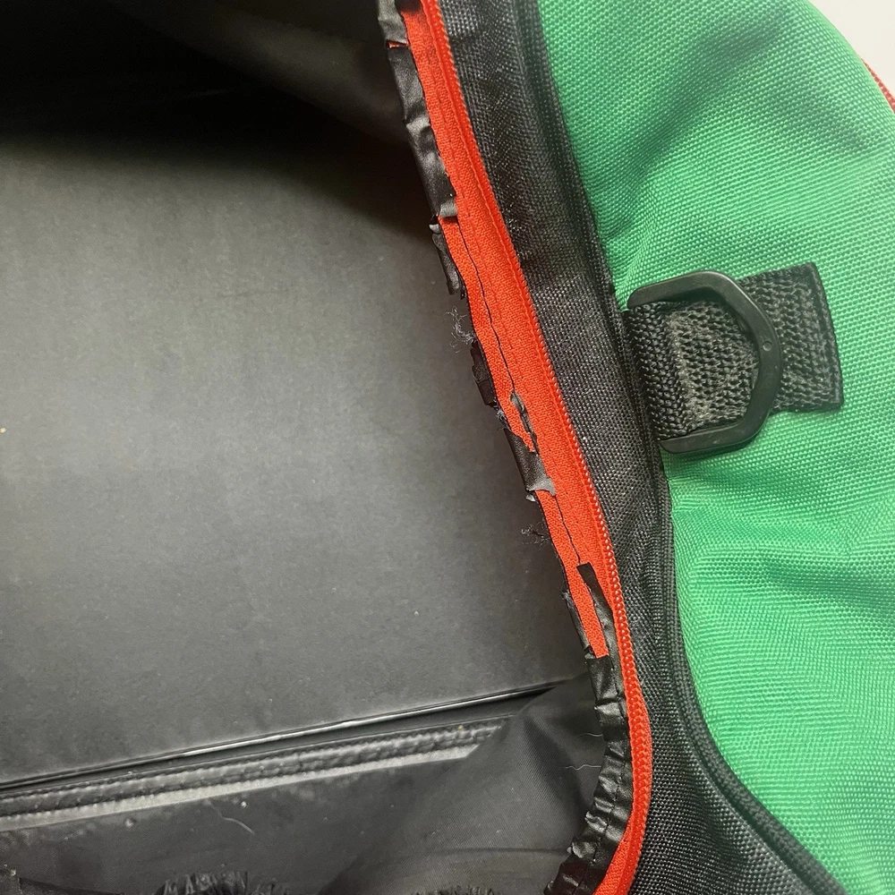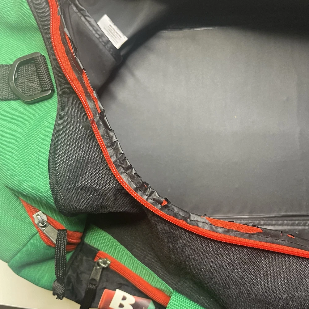 The bag is really clean and has no holes or stains. The only imperfection is shown in the last pics. Under the zipper the plastic border is falling off. It makes no difference in the bag and can’t be seen. You could get it all off and never know it was there. There is a bit of wear on the handle from it being strapped together. Please see pics to judge for yourself. I am selling as is no returns.