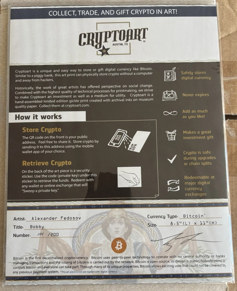 This rare and limited edition print titled "Bobby" is a stunning piece of art created by Alexander Fedosov using the Giclée printing technique. The print features a patriotic theme and is a portrait style, perfect for any art and/or bitcoin collector. The print is a multi-piece work and is made of high-quality Giclee & Iris material, ensuring its long-lasting durability. There is a small smudge top right corner you can see, but this would not be visible if framed. Sold as is. It is not loaded with any bitcoin. With a width of 8.5 inches and a height of 11 inches, this print is the perfect addition to any space. The print surface is made of paper, and the production technique used is Giclee & Iris Print. This print is an excellent example of Pop Art and is a must-have for any art enthusiast. Own a piece of art that is both unique and beautiful with this rare CryptoArt Giclée print by Alexander Fedosov. Happy bidding!