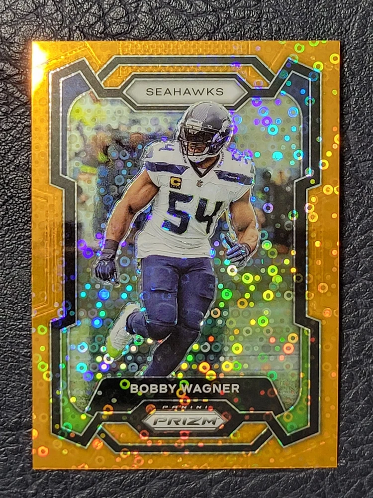 Capture a piece of football history with this set of two trading cards featuring the talented Bobby Wagner. From the 2023 Panini Prizm set, the Orange Disco card sparkles with an eye-catching design, while the 2021 Panini Score Gold card boasts a classic look. Both cards celebrate Wagner's impressive career with the Seattle Seahawks, Los Angeles Rams, and Washington Commanders, as well as his time with the Utah State Aggies in college. Each card is crafted in the United States and showcases standard-size, high-quality card stock. These non-autographed inserts and parallels are must-haves for fans and collectors alike. The cards include English language details and commemorate the exciting Super Bowl event. Add a touch of NFL prestige to your collection with these striking representations of Bobby Wagner's athletic prowess.