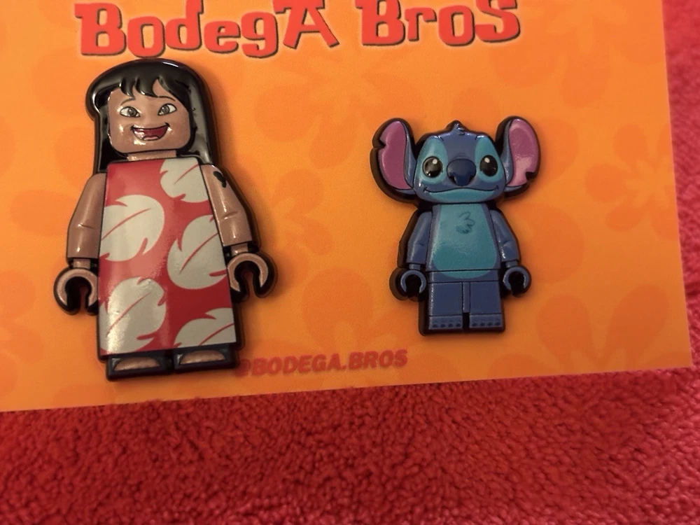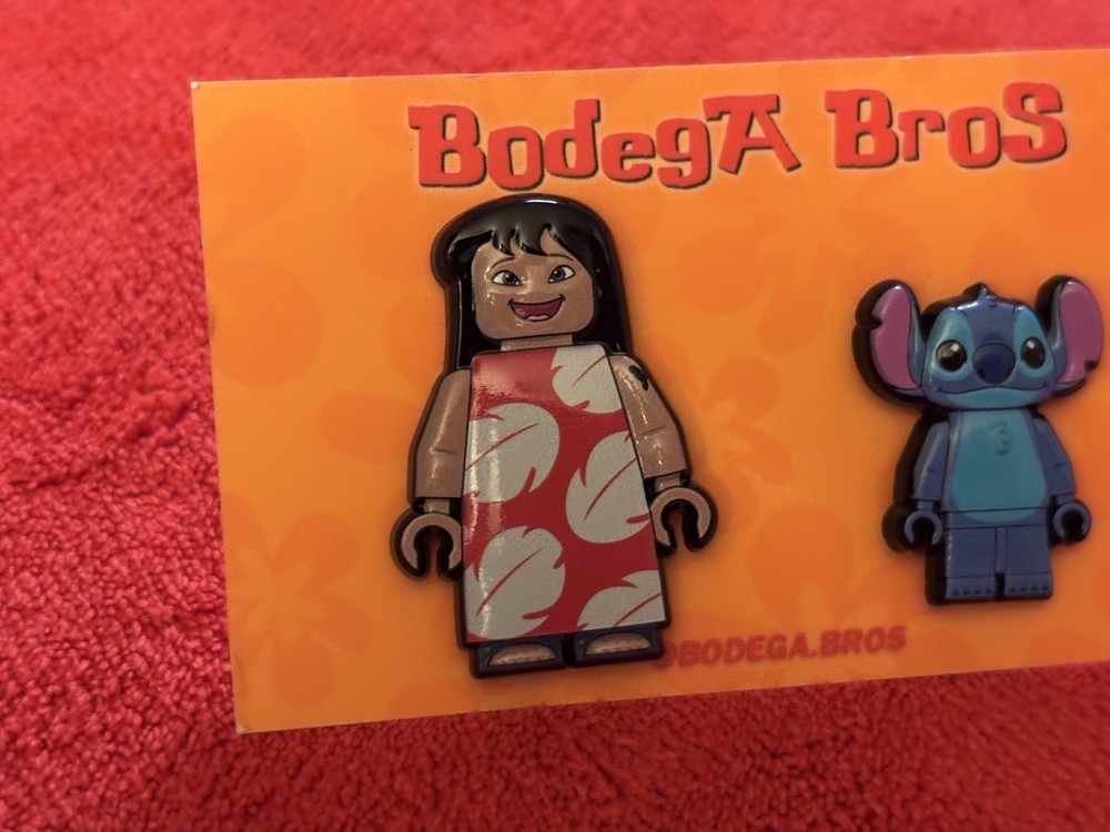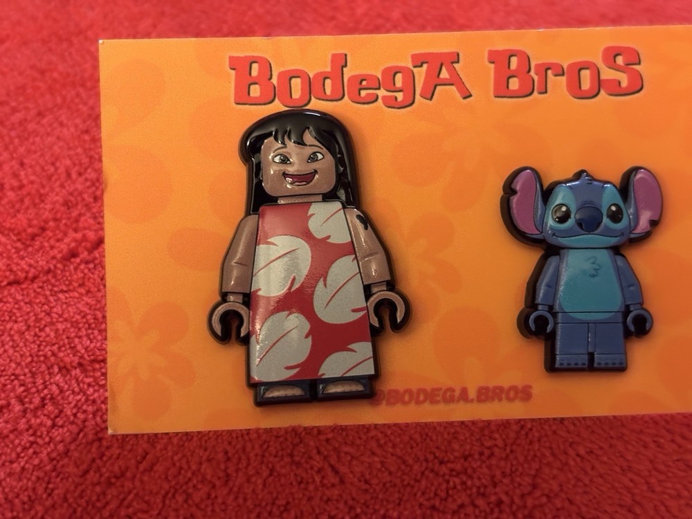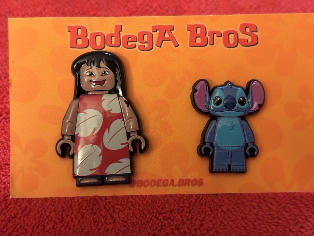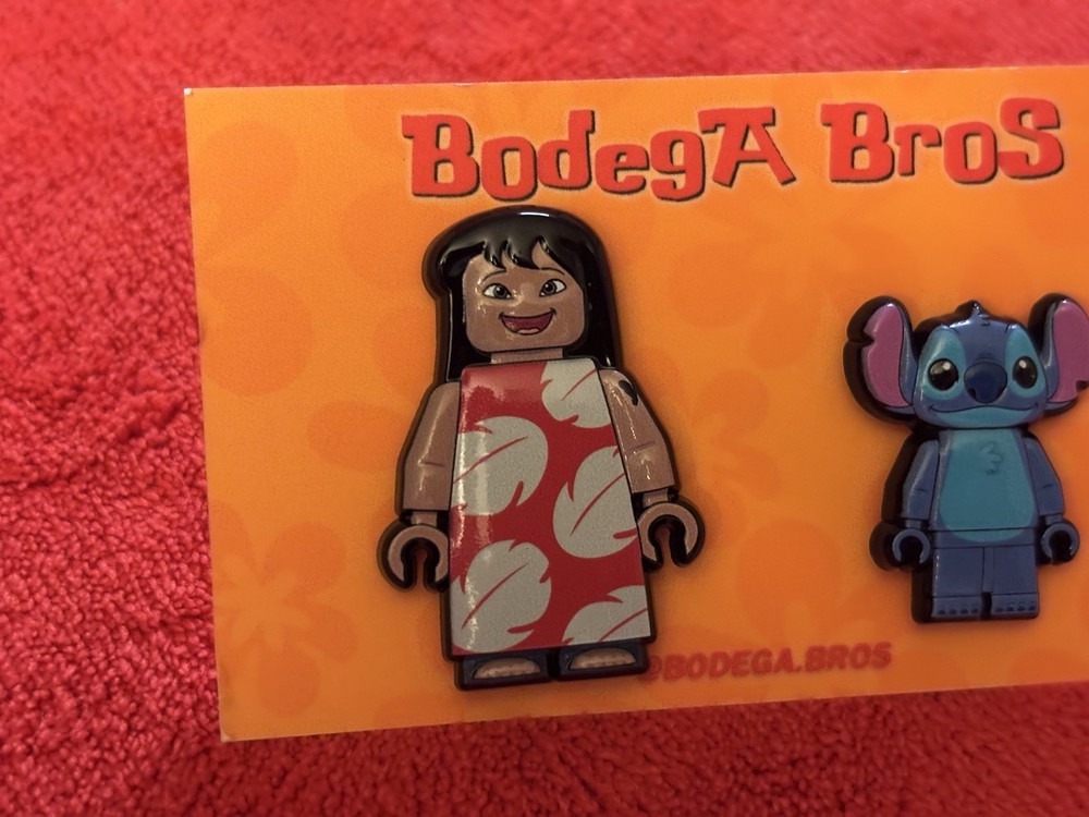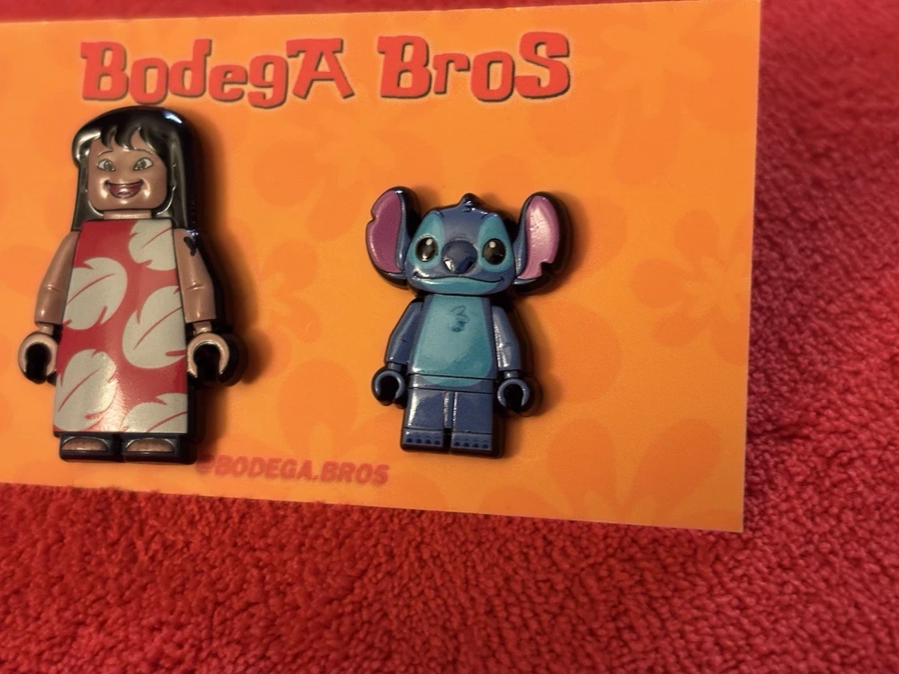 Listing price lowered for 72 hours. Enjoy! 100% authentic and brand new. Bodega Bros Lilo and Stitch pack hat pin set. Lilo does have a paint chip on the upper left arm as shown in pictures. Add this awesome pin set to your collection today.