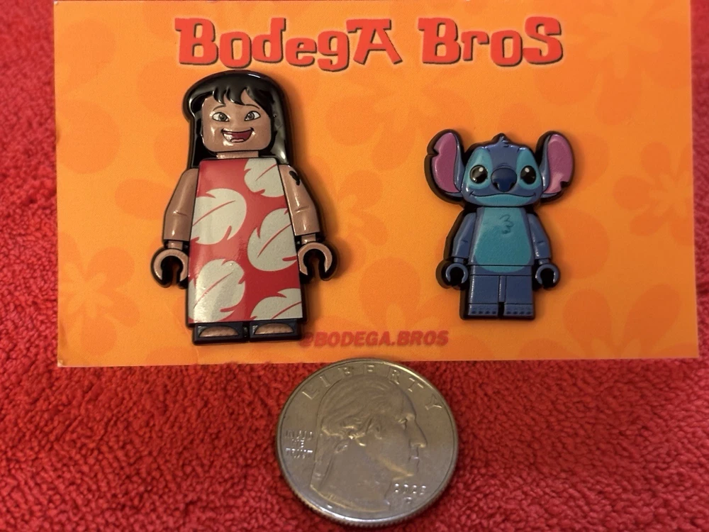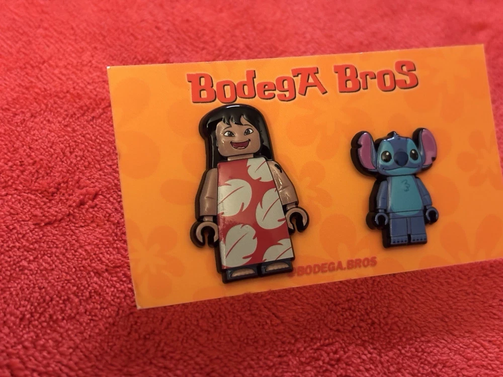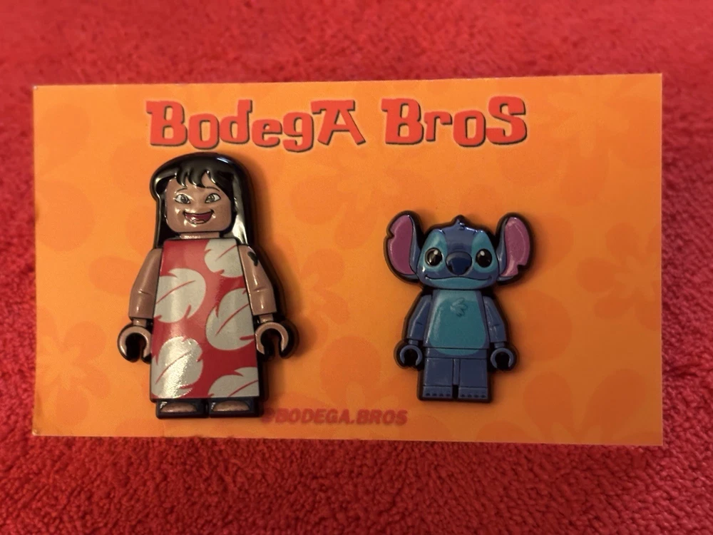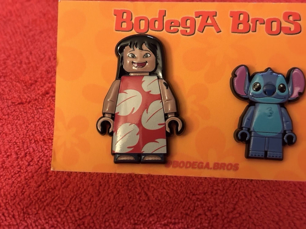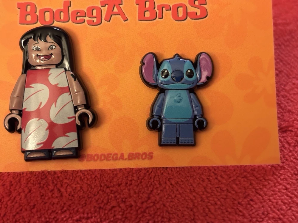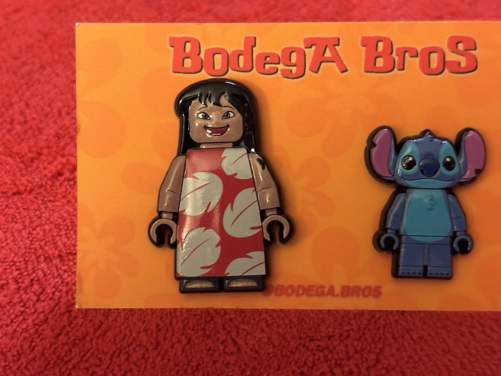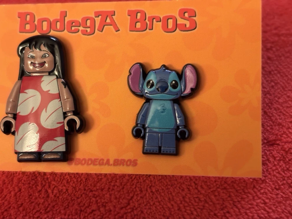 Listing price lowered for 72 hours. Enjoy! 100% authentic and brand new. Bodega Bros Lilo and Stitch pack hat pin set. Lilo does have a paint chip on the upper left arm as shown in pictures. Add this awesome pin set to your collection today.