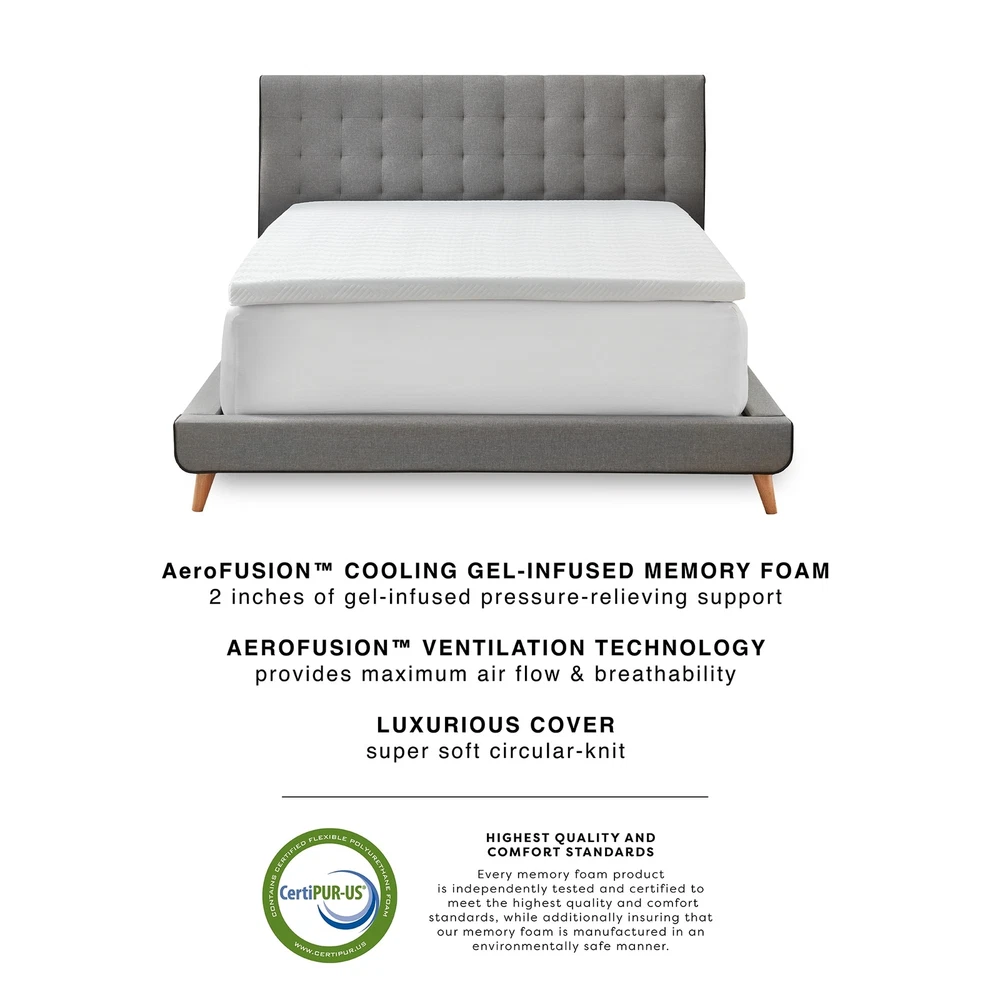Bodipedic Comfort 2-Inch Memory Foam Mattress Topper with Luxury Circular-Knit CoverImprove the comfort of your bed with supportive memory foam and luxurious softness found in this Gel-Infused Memory Foam Mattress Topper from the Bodipedic Comfort collection. Two inches of supportive AeroFusion memory foam cradles the body for targeted pressure relief and is infused with cooling gel to promote heat dissipation so you can enjoy refreshing sleep throughout the night. Built-in AeroFusion Ventilation Technology provides maximum air flow and temperature regulation through enhanced breathability. Each mattress topper includes a luxury circular-knit fabric cover that adds a layer of smooth softness and comfort and is removable for easy cleaning. The odor free memory foam meets CertiPUR-US Free Shipping Over $49.99* Details Bodipedic Comfort 2-Inch Memory Foam Mattress Topper with Luxury Cover Product Description: Bodipedic Comfort 2-Inch Memory Foam Mattress Topper with Luxury Circular-Knit Cover Improve the comfort of your bed with supportive memory foam and luxurious softness found in this Gel-Infused Memory Foam Mattress Topper from the Bodipedic Comfort collection. Two inches of supportive AeroFusion memory foam cradles the body for targeted pressure relief and is infused with cooling gel to promote heat dissipation so you can enjoy refreshing sleep throughout the night. Built-in AeroFusion Ventilation Technology provides maximum air flow and temperature regulation through enhanced breathability. Each mattress topper includes a luxury circular-knit fabric cover that adds a layer of smooth softness and comfort and is removable for easy cleaning. The odor free memory foam meets CertiPUR-US standards for content, emissions, and durability for long lasting comfort. Our gel-infused mattress toppers are backed by a 5-year limited warranty. HIGH QUALITY MEMORY FOAM- Supportive AeroFusion memory foam gently cradles the body to relieve pressure points and enhance spinal alignment and is infused with cooling gel to promote heat dissipation for refreshing slumber ENHANCED AIR FLOW- AeroFusion Ventilation Technology allows for maximum air flow and temperature regulation to promote heat dissipation for cooler rest LUXURY SOFT COVER- The included circular-knit fabric cover adds a layer of smooth softness and comfort and is removable for easy cleaning CERTIFIED DURABLE FOAM- The memory foam in this mattress topper meets CertiPUR-US standards for content, emissions, and durability, and has been analyzed by independent, accredited testing laboratories REST ASSURED- Each gel-infused mattress topper includes a 5-year limited manufacturer's warranty Twin mattress topper measures 74" x 38" Twin XL mattress topper measures 79" x 38" Full mattress topper measures 74" x 53" Queen mattress topper measures 79" x 59" King mattress topper measures 79" x 75" Cal king mattress topper measures 83" x 71"