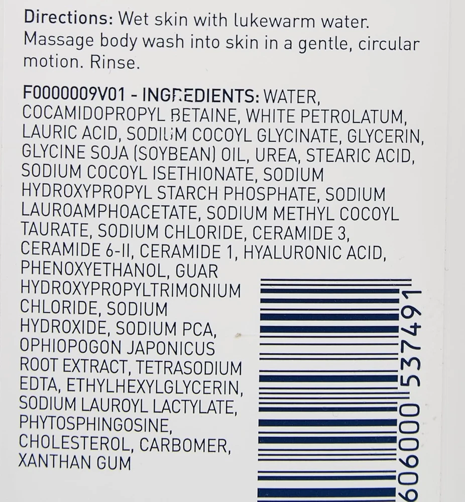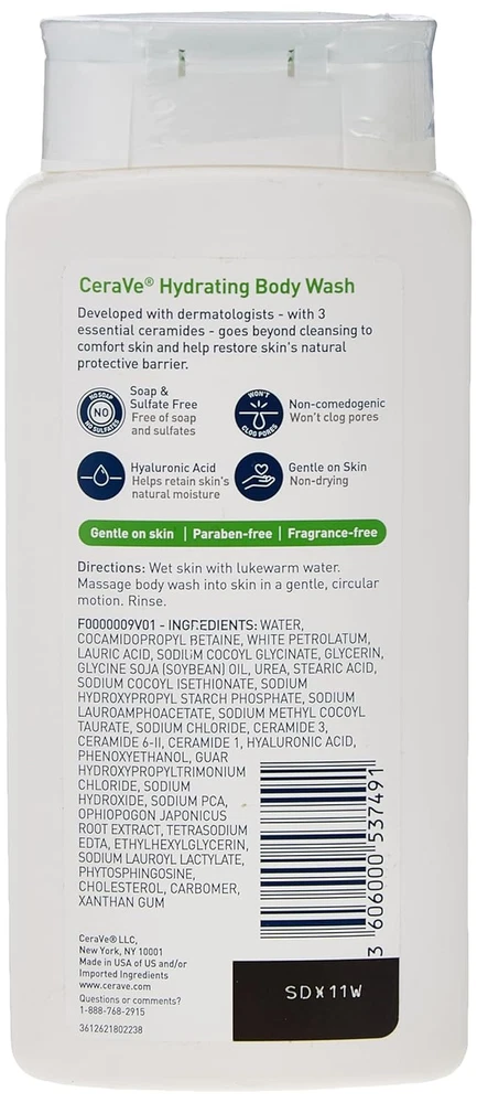 [ CLEANSE & REFRESH ] Formula forms a gentle foaming lather to cleanse without stripping skin of its natural moisture. Skin is left feeling moisturized & smooth, never tight or dry. [ HYDRATING BODY WASH ] Formulated with Hyaluronic Acid to help retain skin’s natural moisture, and Glycerin to help moisturize. [ SKIN CARE FOR DRY SKIN ] Massage CeraVe Hydrating Body Wash into skin in gentle, circular motions with a washcloth or shower loofah. Can be paired with CeraVe Moisturizing Cream to lock in moisture. [ 3 ESSENTIAL CERAMIDES ] Ceramides are found naturally in the skin and make up 50% of the lipids in the skin barrier. All CeraVe products are formulated with three essential ceramides (1, 3, 6-II) to help restore and maintain the skin’s natural barrier. [ DEVELOPED WITH DERMATOLOGISTS ] CeraVe Skincare is developed with dermatologists. Fragrance free, paraben-free, sulfate-free, soap-free, allergy-tested, and non-comedogenic. Accepted by the National Eczema Association. Developed with dermatologists, CeraVe Hydrating Body Wash contains a gentle, foaming formula that cleanses and moisturizes the skin. This foaming body wash for normal to dry skin cleanse and refresh the skin while restoring the skin's natural barrier. The formula contains hyaluronic acid to attract needed moisture to skin's surface and 3 essential ceramides (1,3 and 6-II) to help repair the skin's protective barrier. Also includes emollients to moisturize and soften the skin all day. •Fragrance-free •Paraben-free •Sulfate-free •Soap-free •Non-comedogenic •Accepted by the National Eczema Association •Suitable for normal to dry skin Key Ingredients : • Ceramides : Essential for healthy skin, ceramides help restore and maintain the skin’s natural barrier • Hyaluronic Acid : This ingredient attracts hydration to the skin’s surface and helps the skin retain moisture.