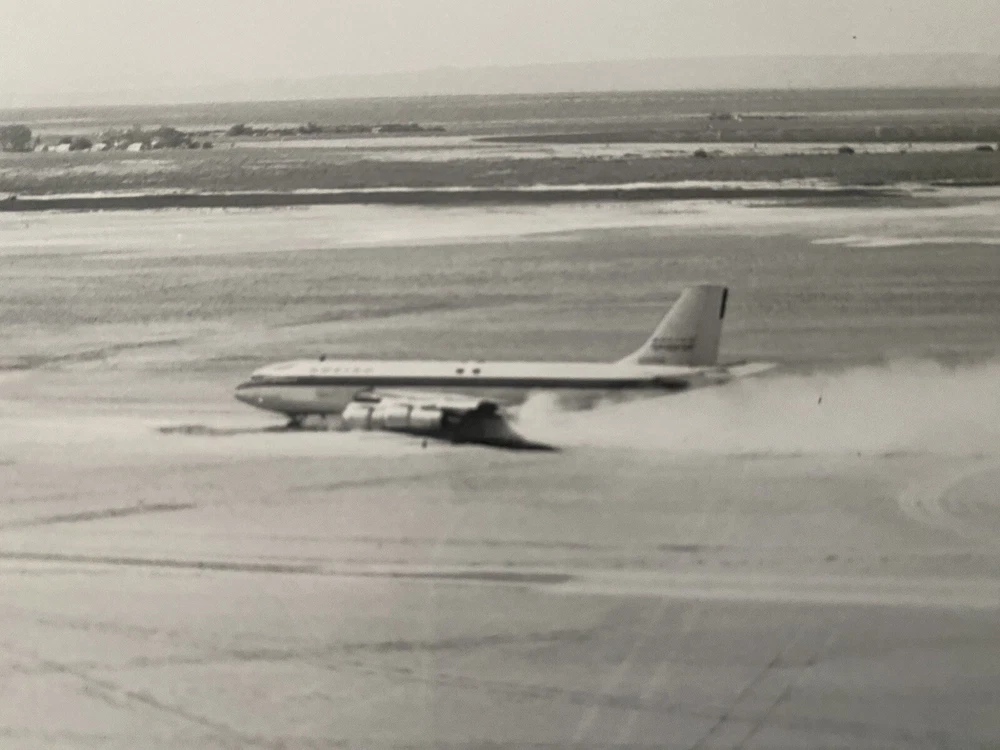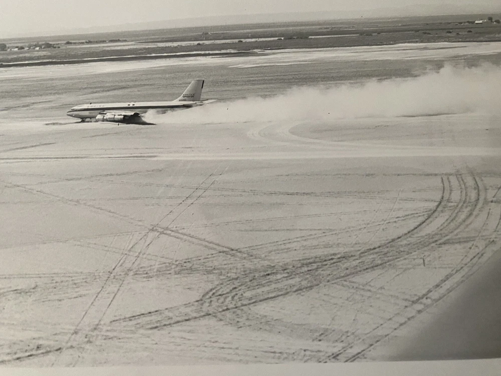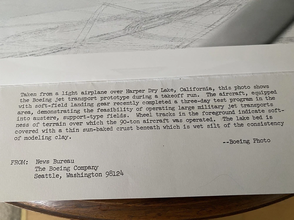 I acquired this original Boeing News Bureau photo from an estate sale of a past Boeing employee. The description of the photo says, "Taken from a light airplane over Harper Dry Lake, California, this photo shows the Boeing jet transport prototype during a takeoff run. The aircraft, equipped with soft-field landing gear recently completed a three-day test program in the area, demonstrating the feasibility be of operating large military jet transports into austere, support-type fields. Wheel tracks in the foreground indicate softness of terrain over which the 90-ton aircraft was operated. The lake bed is covered with a thin sun-baked crust beneath which is wet silt of the consistency of modeling clay." --Boeing Photo From : News Bureau The Boeing Company Seattle, Washington 98124 The back of the photo is stamped, "P36714" It's in very nice condition with a very slight crease on the right border.