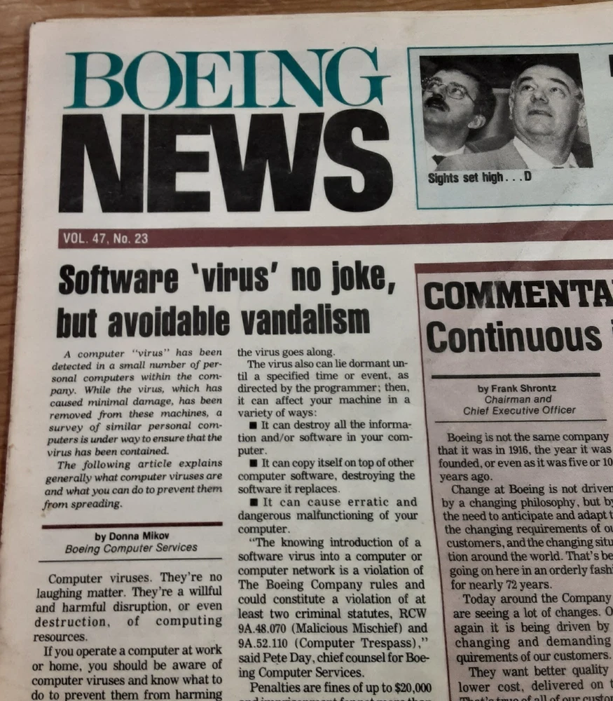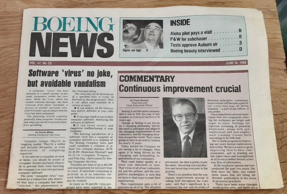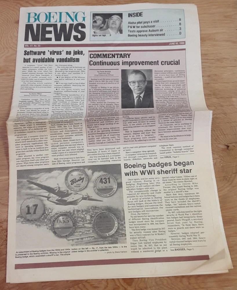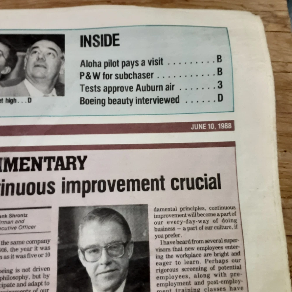 Boeing News newspaper, from June 10, 1988, volume 47, number 23. The newspaper is a collectible item for those interested in ephemera. Discoloration, and yellowing pages. Please email questions. We do combine shipping. Thank you for your interest. Have a great day!
