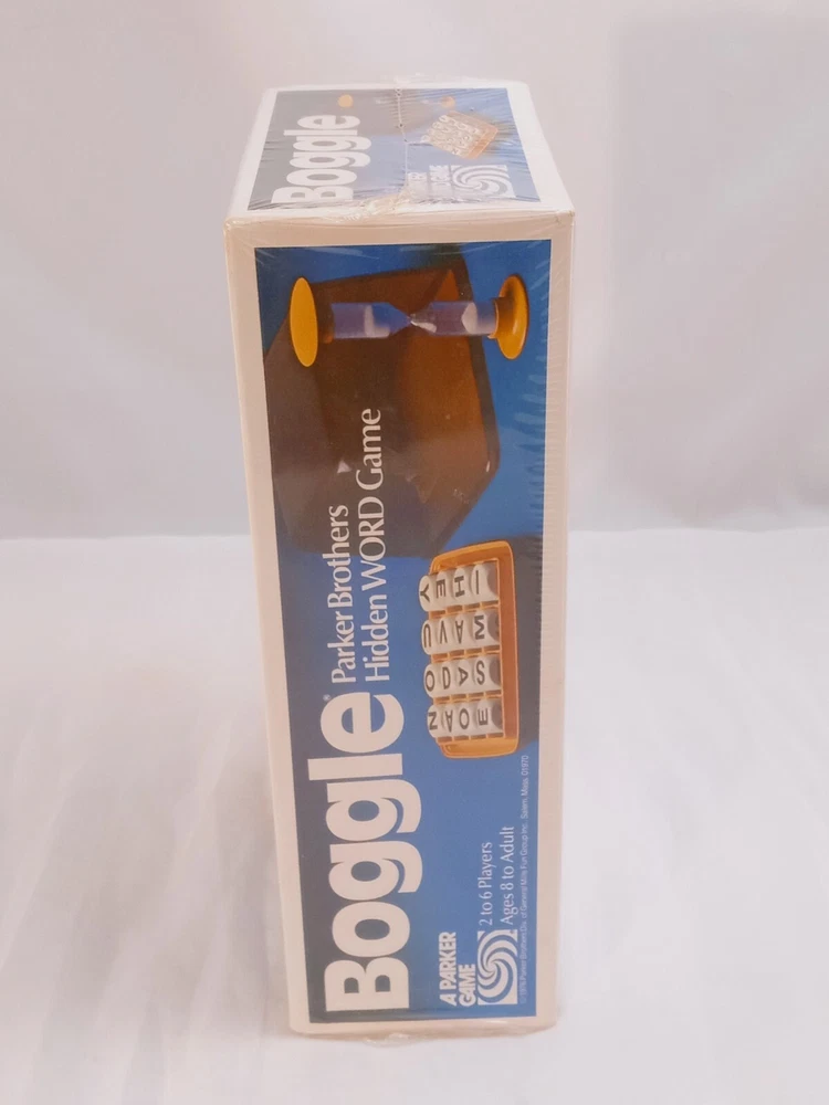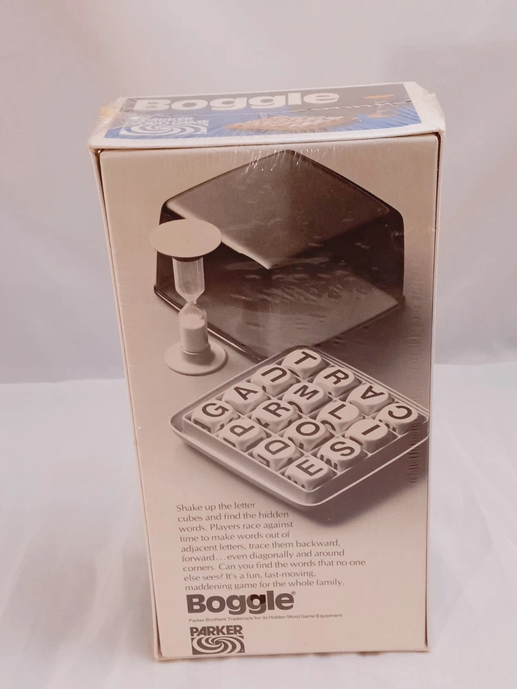 The product is a vintage 1980 version of the Boggle Hidden Word Game by Hasbro. It is a word game where players search for words in a grid of letters. This new edition is a collectible item for fans of classic board games.
