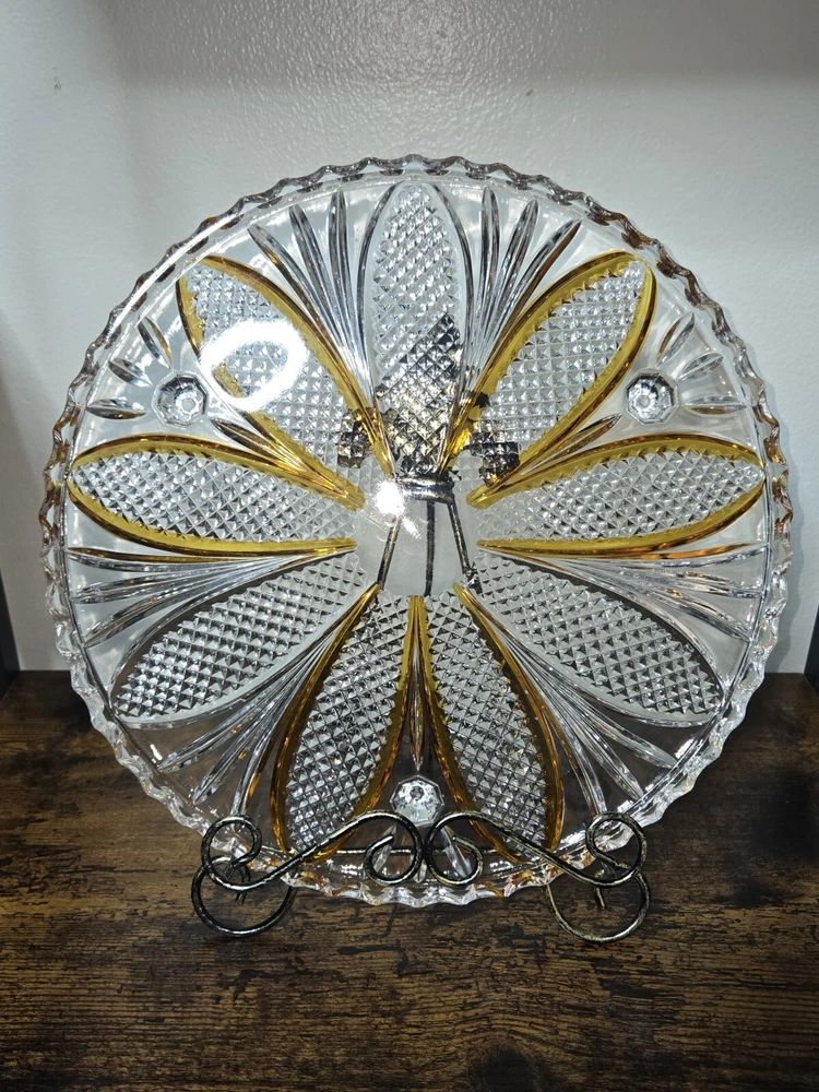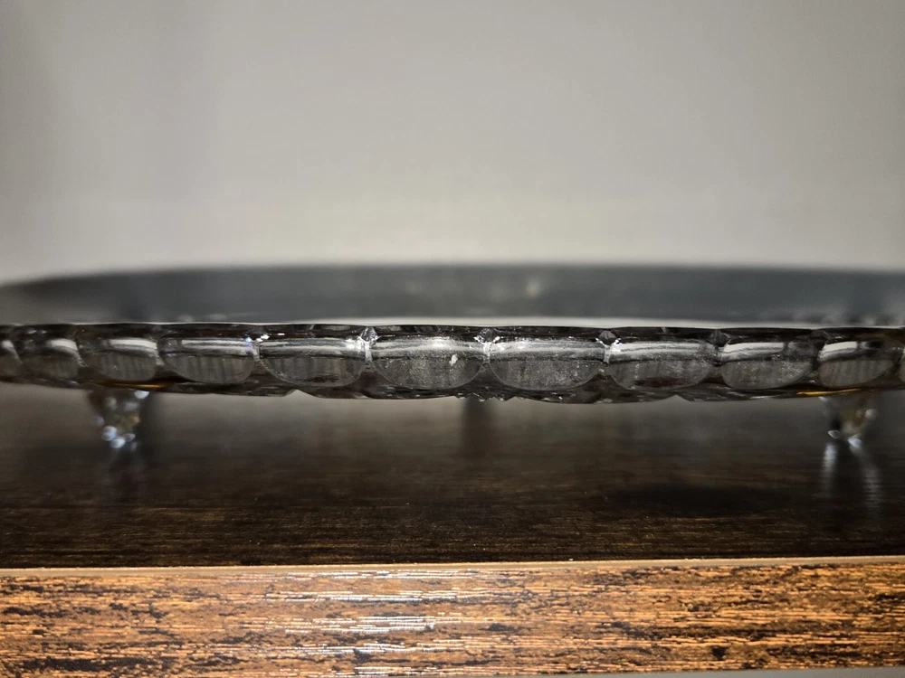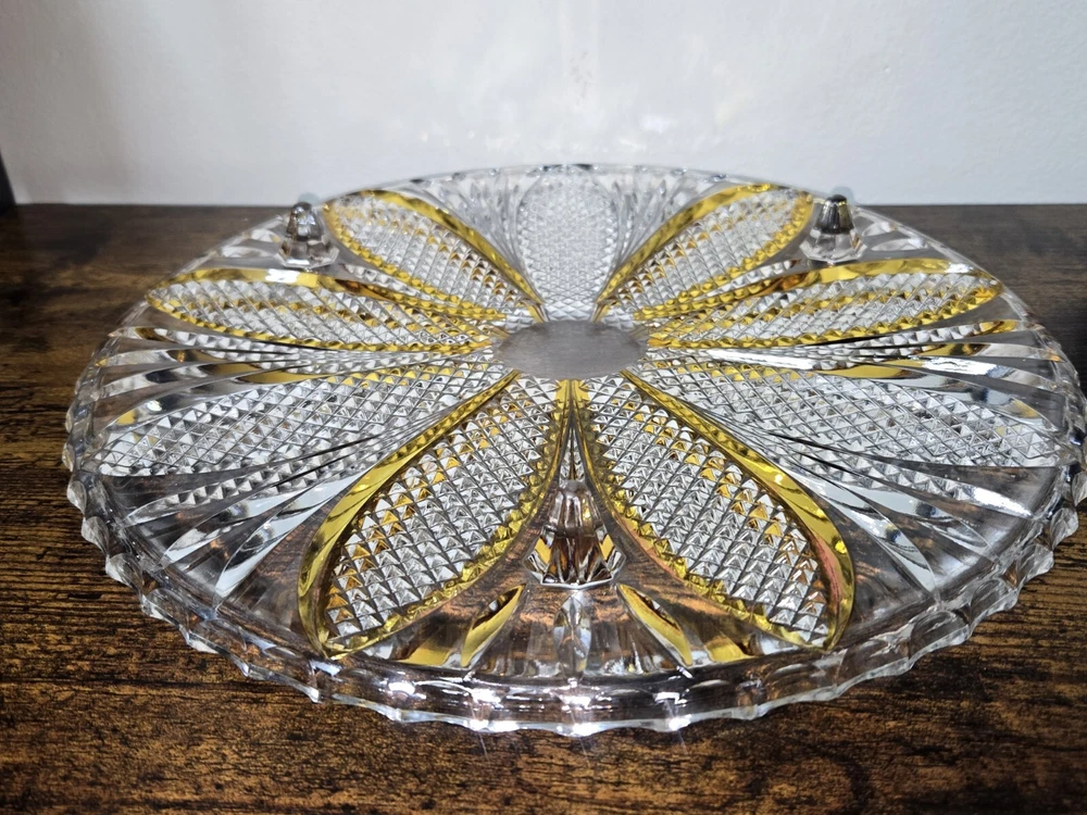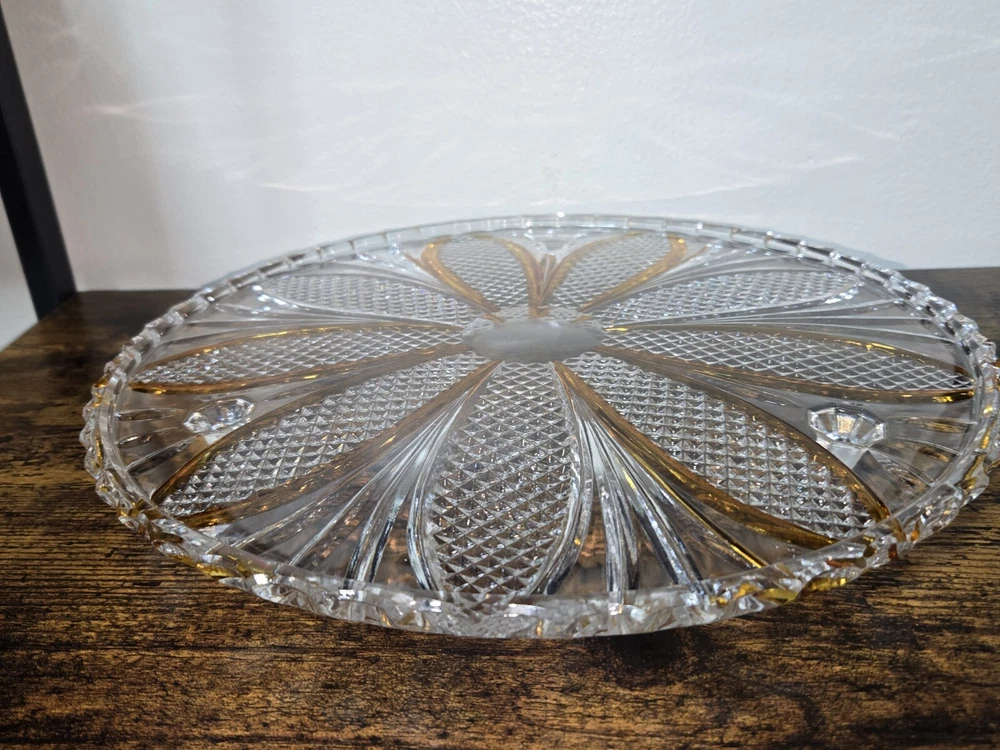 Elevate your cake presentation with this Bohemian Crystal Diamond Cut Footed Cake Plate. The stunning combination of orange and clear crystal creates a vintage charm that is perfect for any special occasion. Made in Czechia, this unmarked plate is crafted from high-quality crystal and features a intricate diamond cut pattern that will impress your guests. Perfect for those who love unique and one-of-a-kind pieces, this vintage cake plate is sure to add a touch of elegance to your dining table. Whether you're a collector or simply looking for a special piece to showcase your cakes, this plate is the perfect choice.