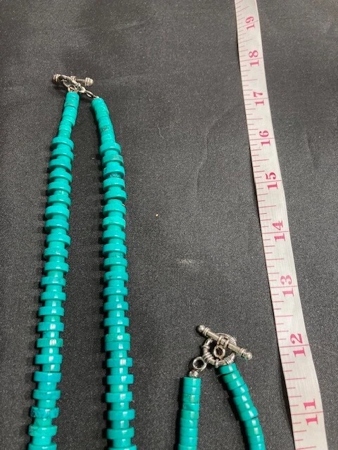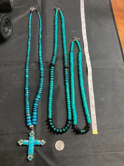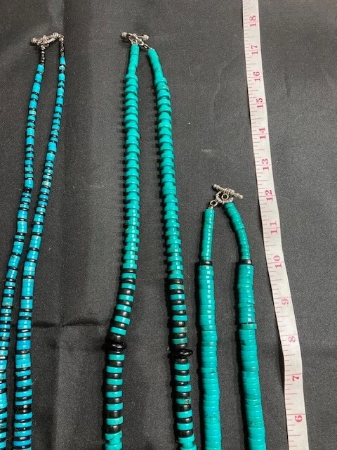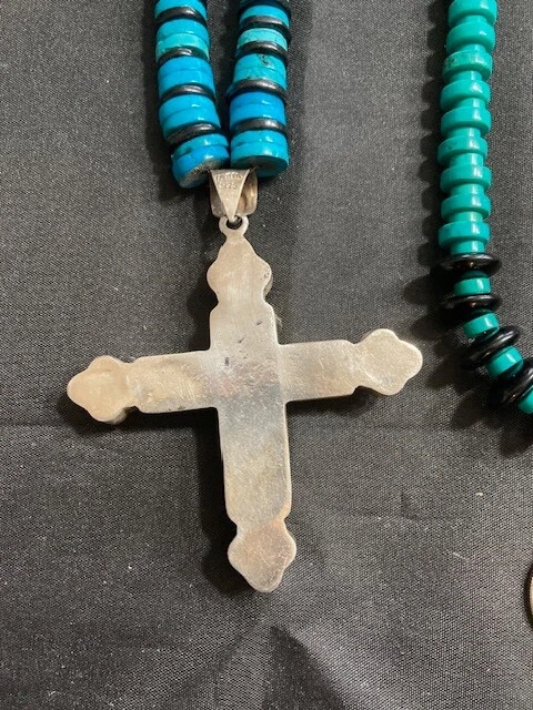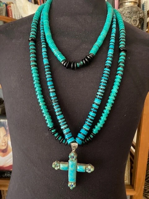Here's a great set of turquoise and onyx necklaces that will definitely make a statement. They are 36, 32 and 22 inches in length. One has a sterling, turquoise and lapis cross pendant that is stamped India. Used many times on my shows on Bohemian types and worn by me. This is a great set that is a worthy addition to any jewelry collection with the added bonus of a Hollywood history. To my E-Bay buyers, My name is Joseph Porro. I am a twice nominated Hollywood Costume Designer. My latest Emmy nomination was for the Disney show "The Mandalorian". I have worked for over 45 years in the film and television industry and designed for hundreds of famous stars. I am now retiring from the business and selling my extensive collection of one of a kind custom made and designer wardrobe pieces and a vast and unusual collection of vintage and custom made jewelry. You can check me out on IMDB and Google search. Over the next several months I will be listing pieces from my collection. It's time to give these treasures a new home. Buyer has 4 days to complete transaction or item will be relisted. Thanks and happy bidding!!!