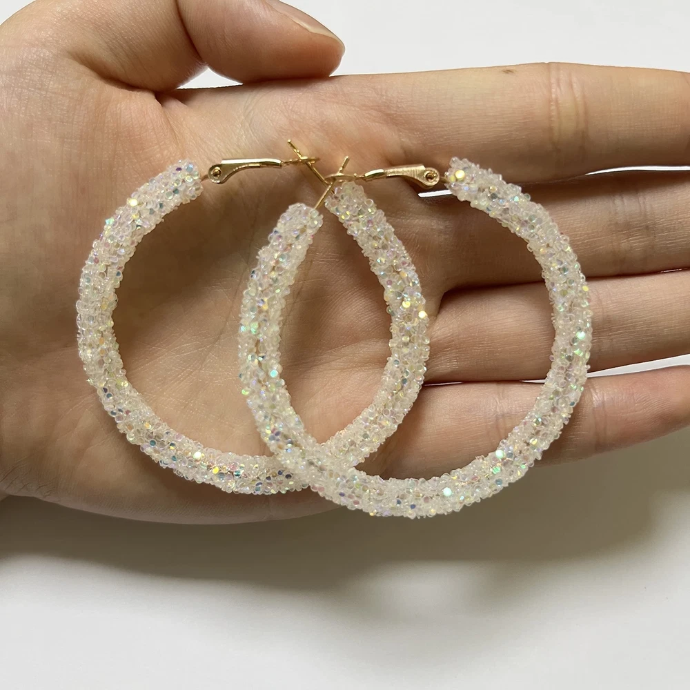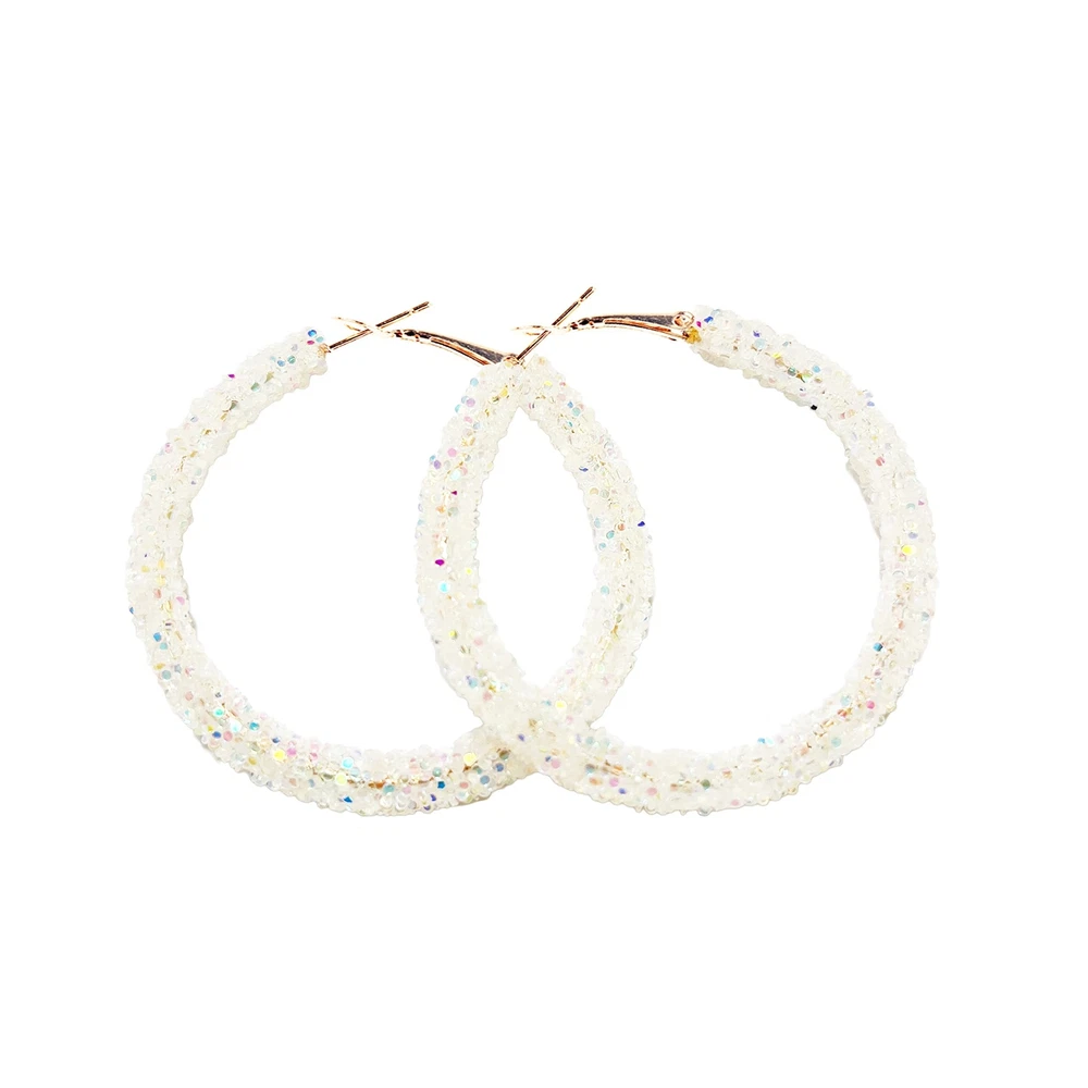 Bohemian Shiny Glitter Sequins Hoop Earrings Wrapped Gold Plated Circle Statement Rhinestone Dangle Drop Earrings for Women Boho Jewelry Product Details Color: transparent Brand: COLORFUL BLING MPN: Does not apply UPC: Does not apply EAN: Does not apply Package Dimensions : 4.72 x 3.94 x 0.04 inches; 1.06 ounces Department : womens Date First Available : May 18, 2022 Manufacturer : COLORFUL BLING Brand, Seller, or Collection Name: COLORFUL BLING Metal: alloy Material: Alloy, Sequins, Stainless Steel Gem Type: sequin Setting: Other-Setting-Type Clasp: Buckles Back finding: French Wire Different colors sparkly sequins hoop earringsColor: white/yellow/red/purple/pink/lake blue/light blue/colorfulPlease refer to the photo display.Size:65mm/2.56inch in diameter. please refer to the product picture size introduction.Perfect size and comfortable to wear all day.Style: Fashion Jewelry.New close sure design, Easy to wear and take it off.