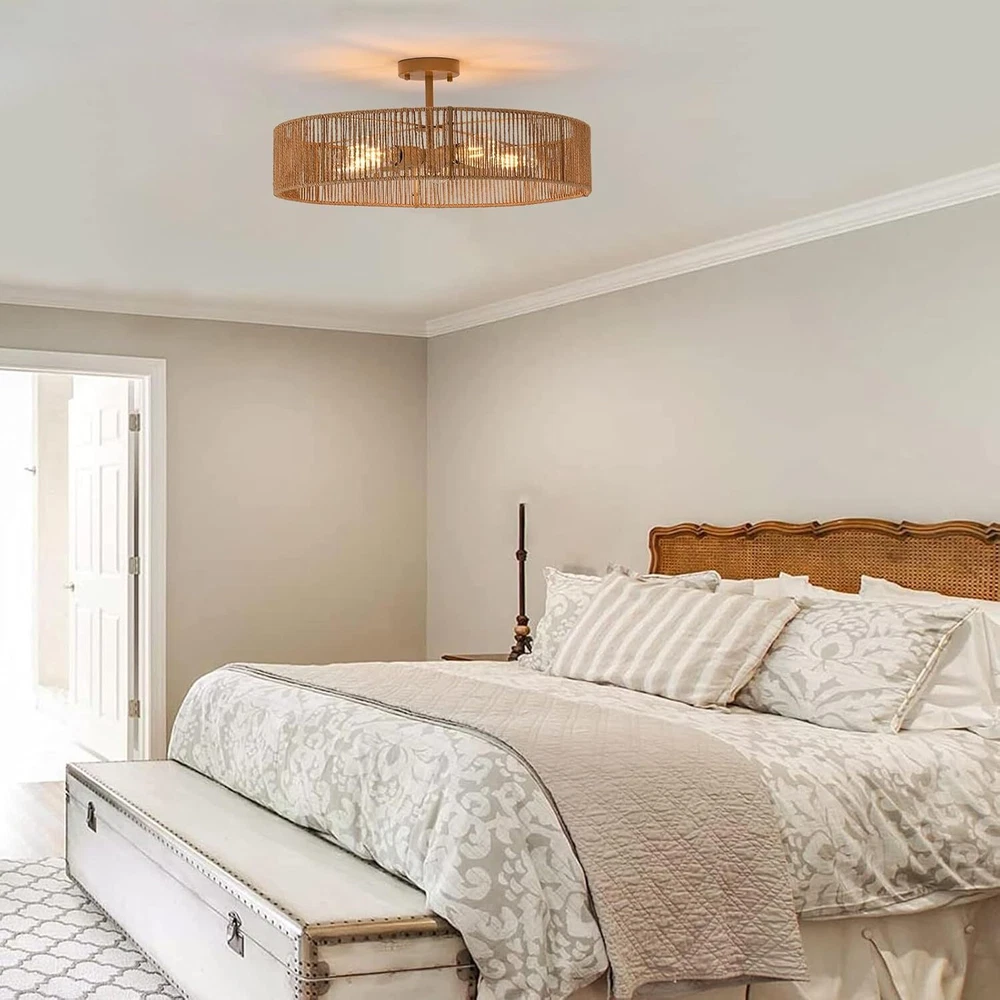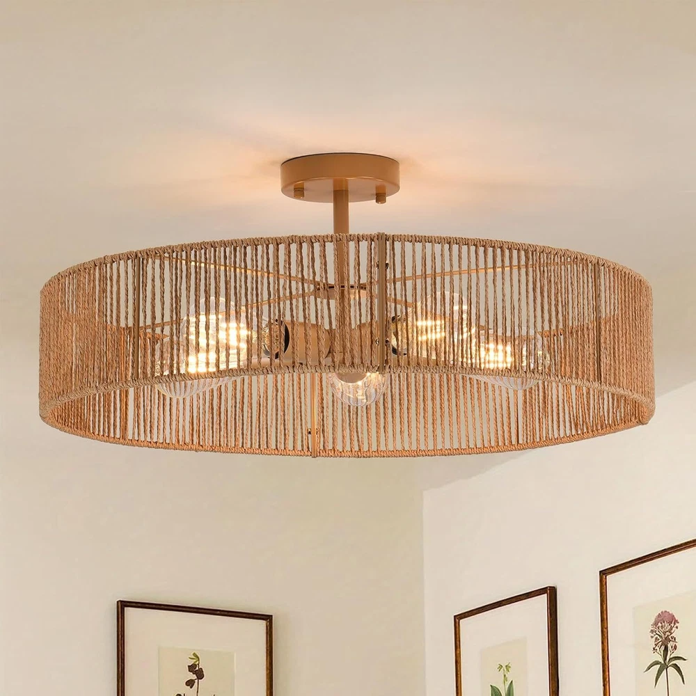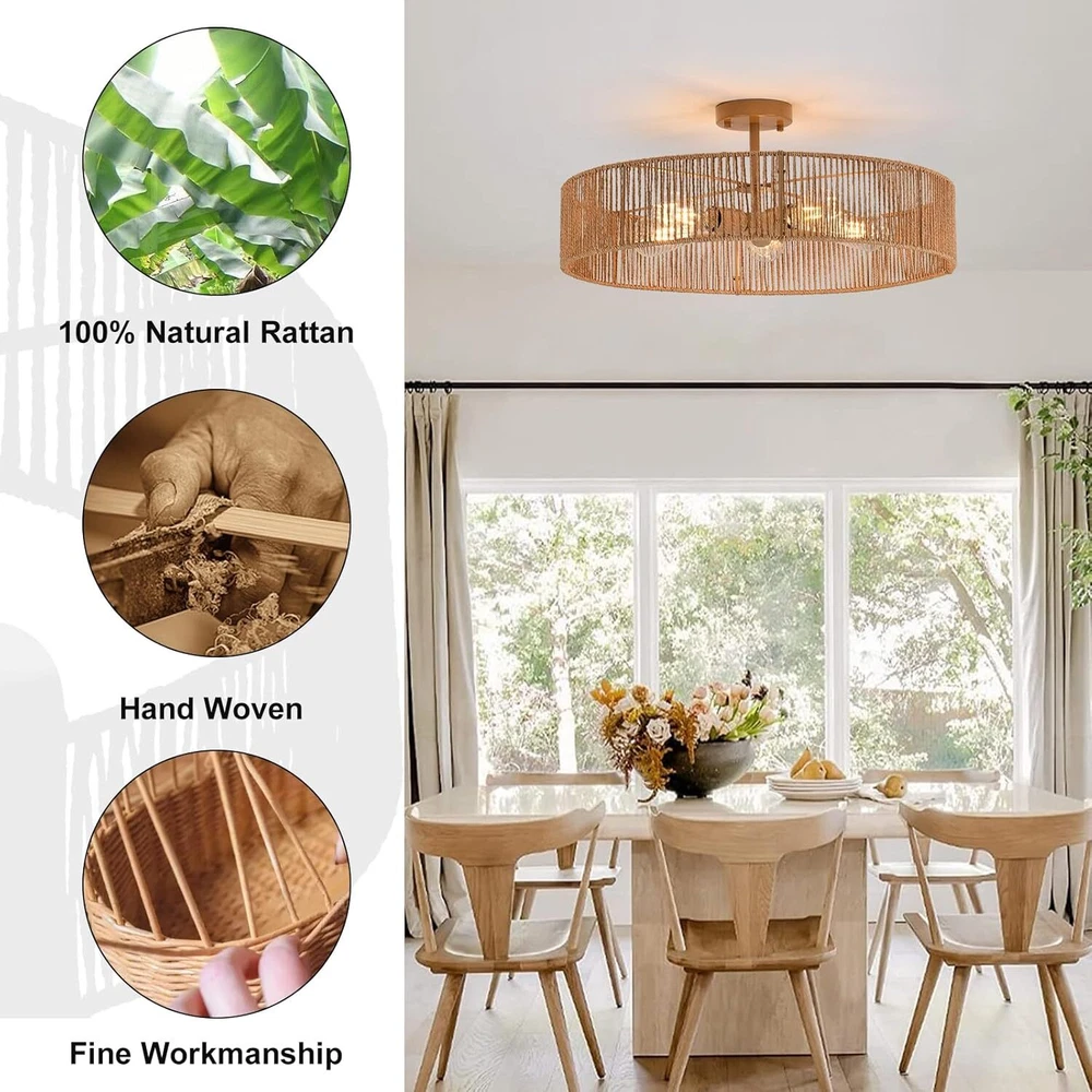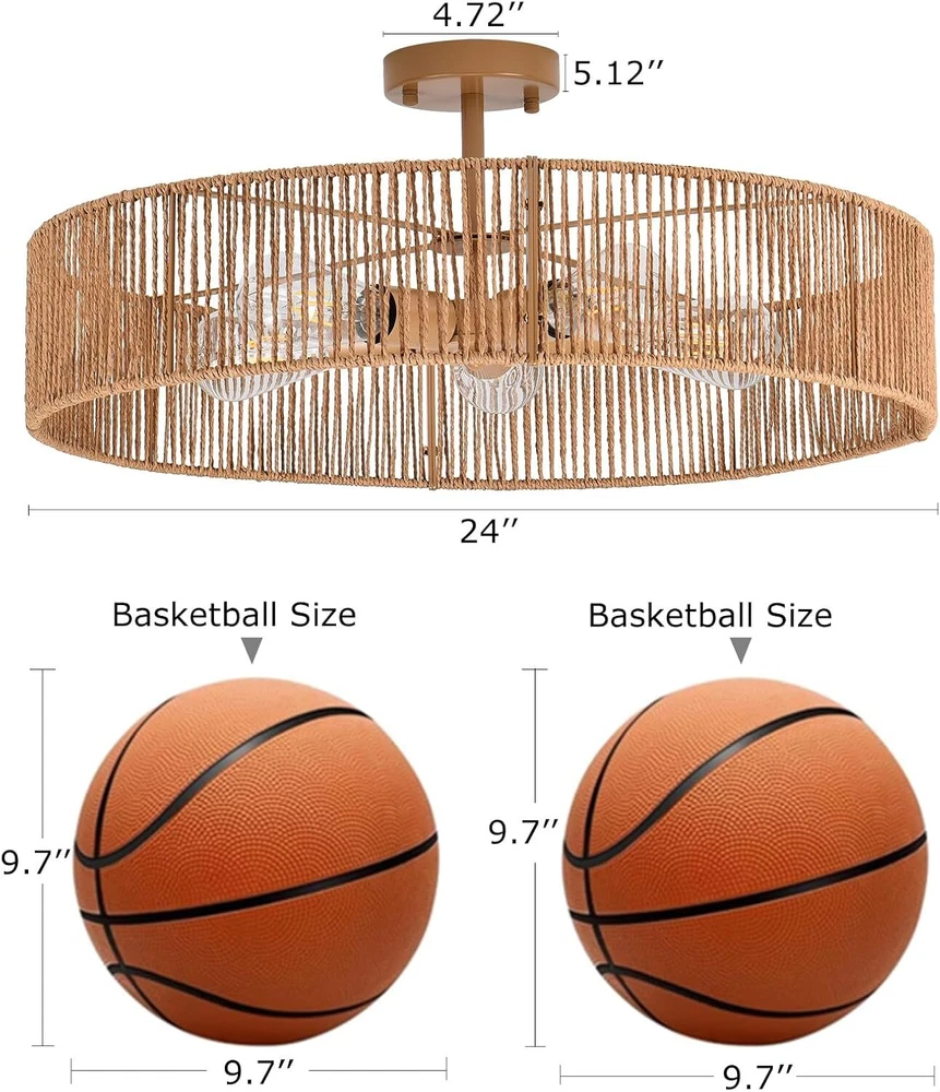 【5-Lights boho light fixture】 This rattan light fixtures ceiling is made of hand-woven natural rattan and durable metal, which is more eco-friendly, safety and healthy. The hollow design of lampshade enables this rattan ceiling light to emit 360° beautiful light shadow,creating a bohemian atmosphere. 【Bulb Requirements 】 The boho light fixture has a total height of 5.12 inches and a diameter of 24 inches. The metal Tray is 4.72 inches. This light fixtures ceiling hanging is equipped with 5*E26 lamp holders. Compatible with incandescent lamp, CFL, LED and halogen bulb and can be dimmable when used with dimmable bulbs and dimmable switches. (excluding). 【Unique Design & Wide Application】 The rattan ceiling light adopts a unique hollow structure, well-proportioned light and cast a very beautiful pattern on the ceiling, suitable for hallway, entryway, doorway bedroom, kitchen, dining room, living room, balcony, farmhouse, foyer. 【Easy to install】 The rattan chandelier is very simple, You only need to fix the lamp base and the lampshade together, then wire the ceiling light fixtures flush mount to the home circuit, and install the light bulb to get a perfect boho ceiling light,The whole process to install this close to ceiling light fixtures is even less than 15 minutes!