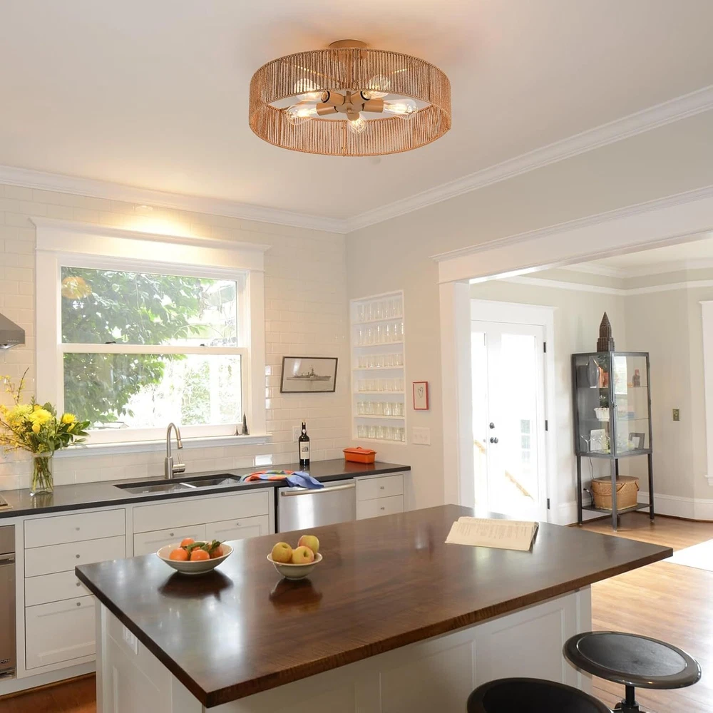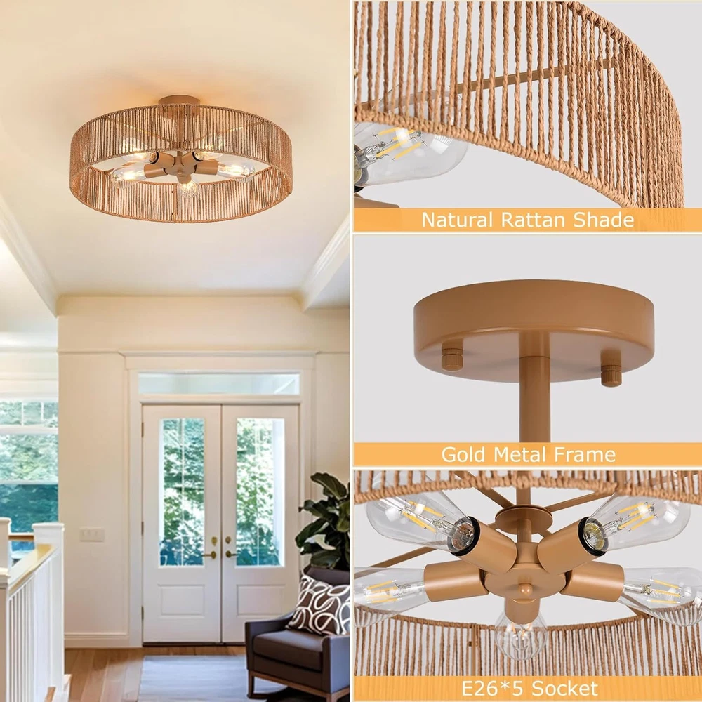finish type: ‎Painted dimensions: ‎14"L x 12"W x 7"H voltage: ‎110 Volts Brand: ‎ZSRACHIU bulb base: ‎E26 finish types: ‎Painted shade color: ‎wood power source: ‎AC style: ‎Modern specific uses for product: ‎Indoor use only indoor/outdoor usage: ‎Indoor room type: ‎‎Entryway Foyer Stairway Hallway Bedroom Living Room Kitchen weight: ‎4.79 pounds light source type: ‎LED number of light sources: ‎5 shade material: ‎Rattan batteries included?: ‎No Type: Not Supplied lighting method: ‎Downlight Material: ‎Rattan maximum compatible wattage: ‎40 Watts assembly required: ‎Yes shape: ‎Round included components: ‎Light kit inlcuded, Shade included mounting type: ‎Monopoint with Canopy light fixture form: ‎Close to Ceiling fixture type: ‎Non Removable batteries required?: ‎No bulb features: ‎Dimmable