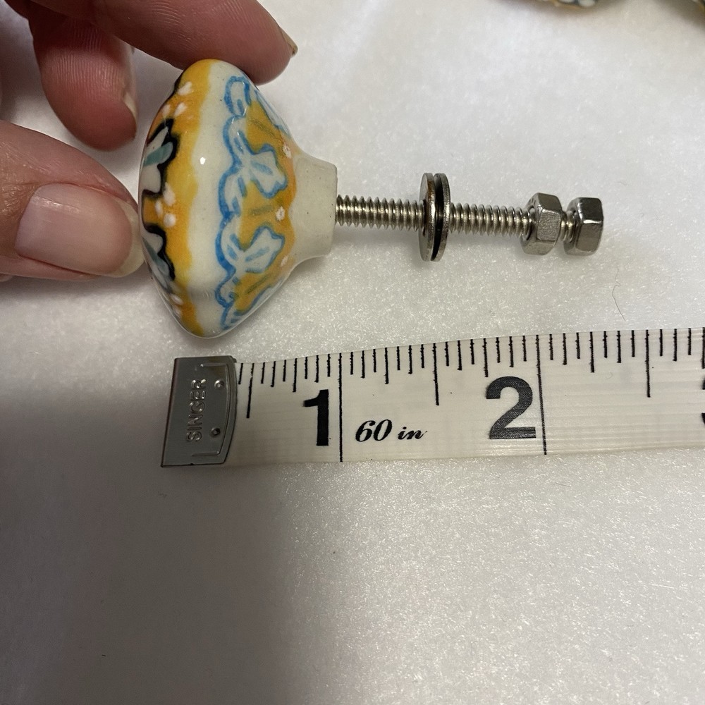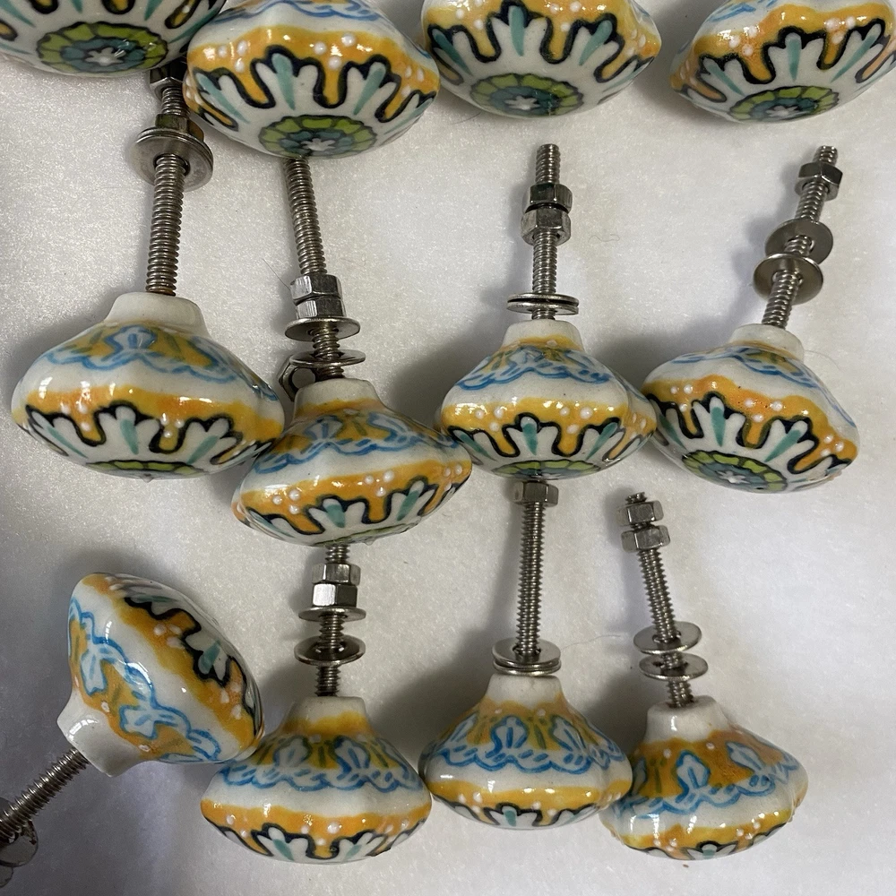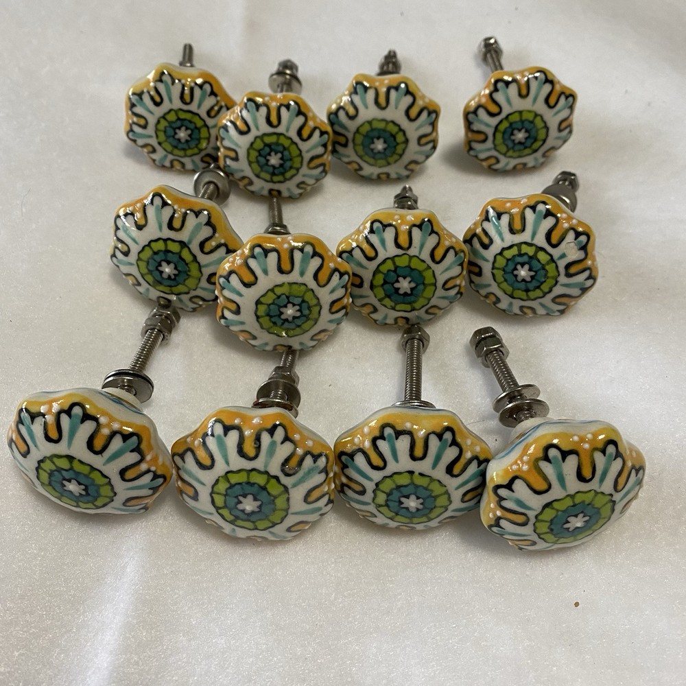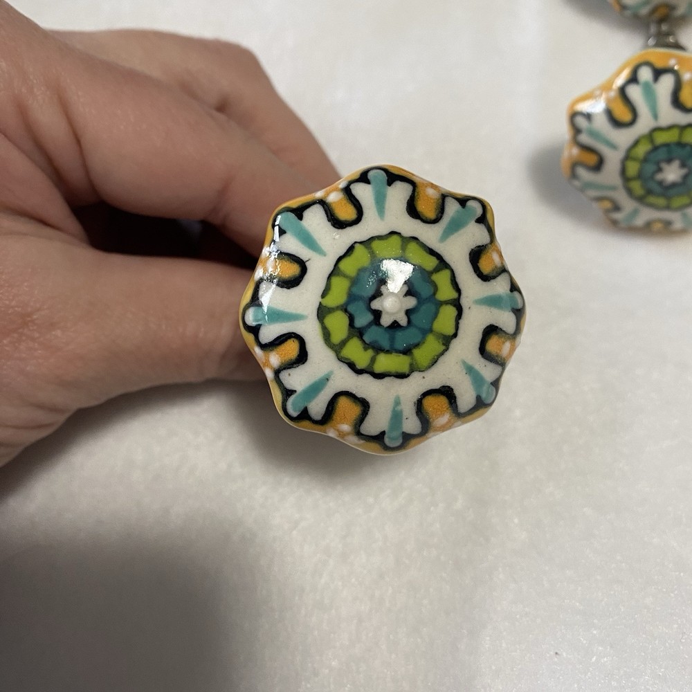 Replacement refinishing furniture drawer pulls cabinet knobs painted boho indie Whimsical colorful hand painted pattern ceramic knobs Yellows greens blues Set of 12 New without tags Cabinets or furniture knobs Indie cottage boho colorful whimsical Anthro painted pattern ceramic porcelain knobs drawer pulls furniture cabinet set