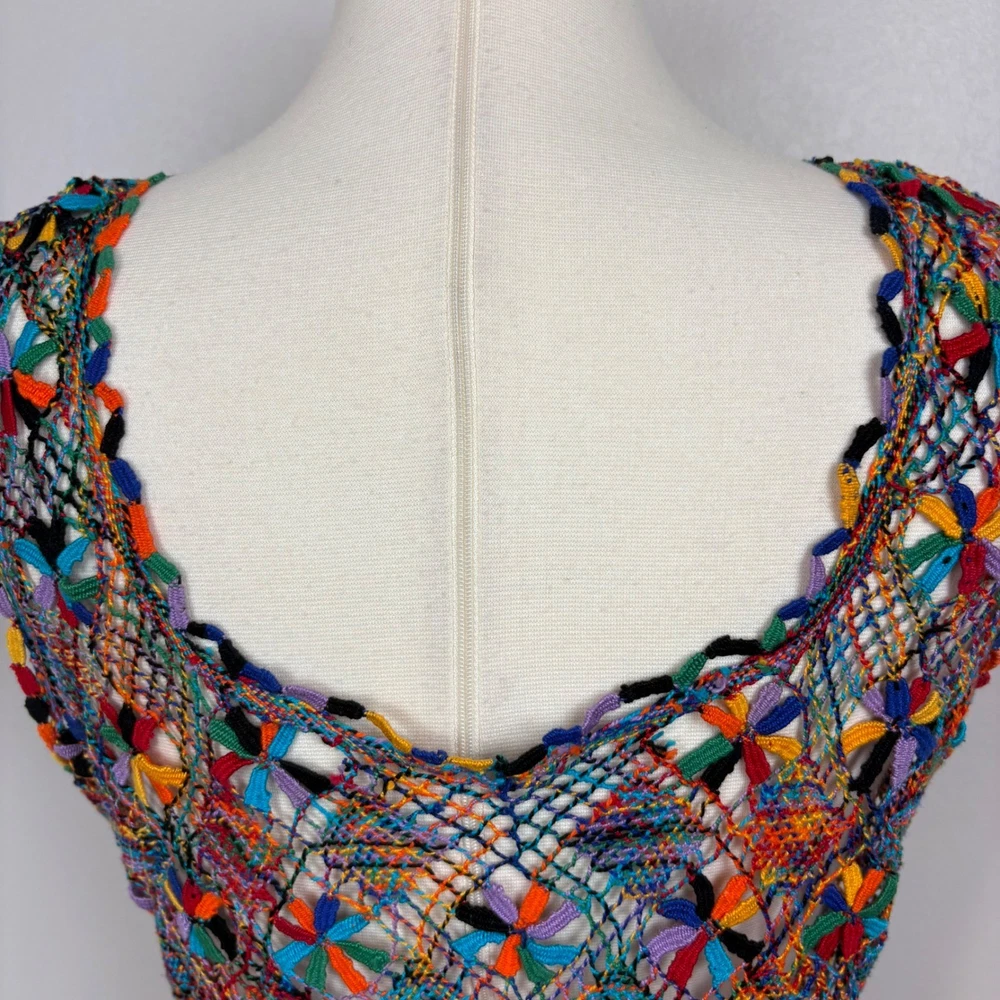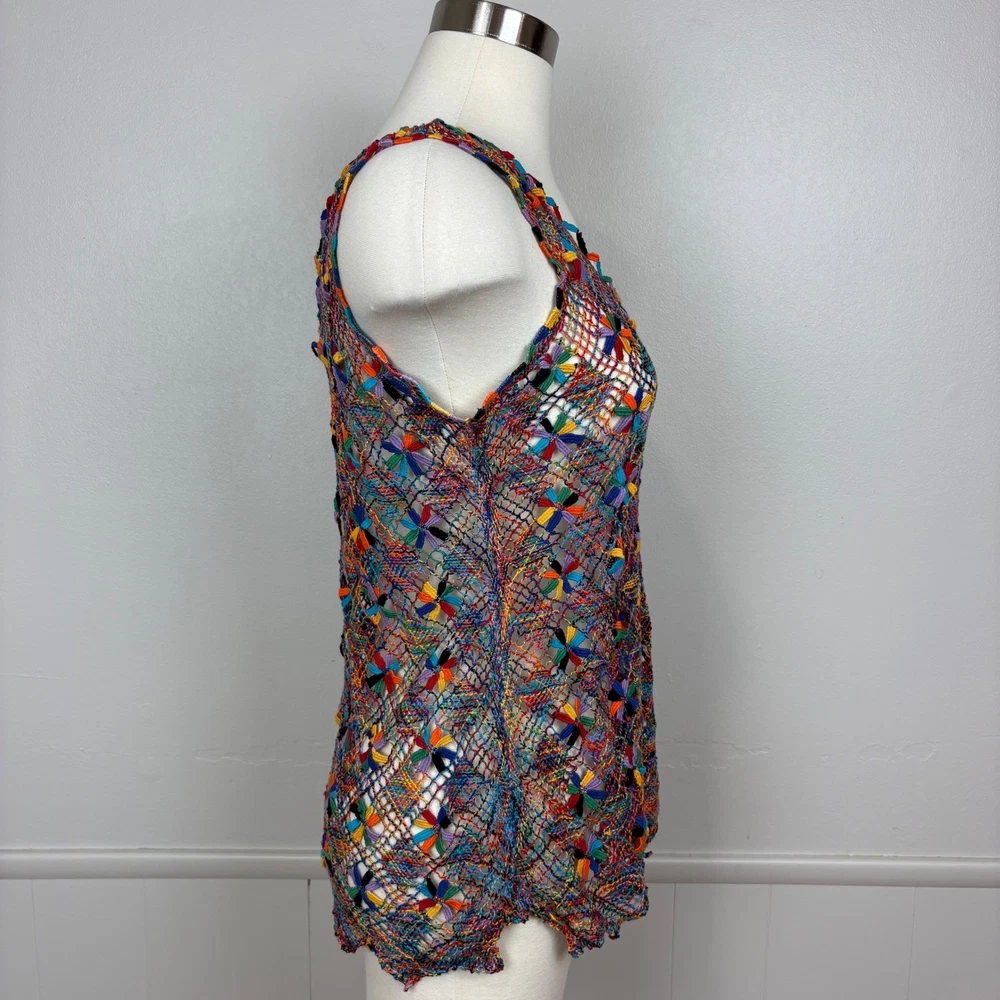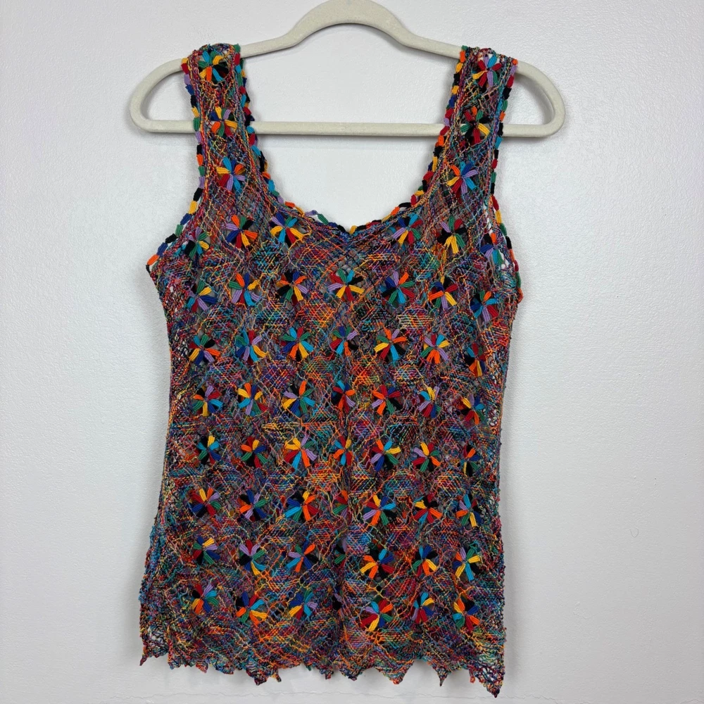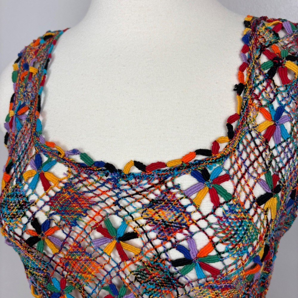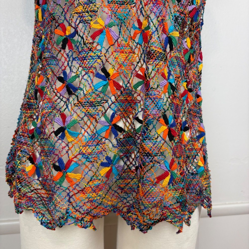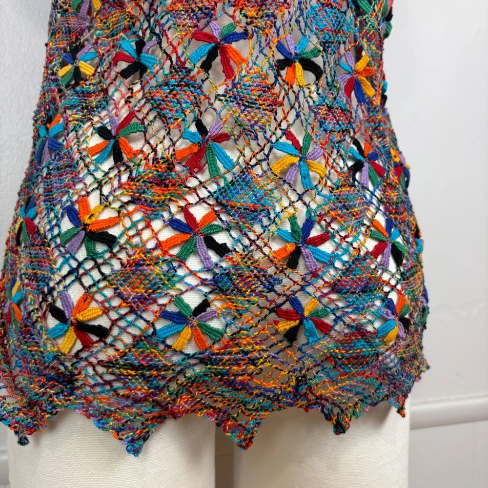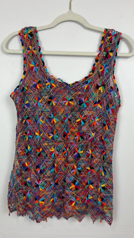Open knit sleeveless tank top features a scoop neck and scalloped hemline. Beautiful starbust floral design surrounded by diamond shaped open knit pattern in rainbow colored thread. Neckline is embellished with linked colorful bars. SIZE: Medium (no size tag - please check measurements below to ensure desired fit) COLOR: Multicolor MATERIAL CONTENT: Unknown CARE: Handwash CONDITION: Excellent pre-owned condition with no fading, stains, or signs of wear. Please see photos/video for details. FLAT MEASUREMENTS (approximate) Underarm to Underarm: 19" Shoulder to Hem: 26" Bundle this item with our other pieces for combined shipping and savings! If you have any questions, please don't hesitate to ask. Thanks for viewing our listing! Unique, quirky, festive, beachy, art to wear, open knit, cover up, pride, festival