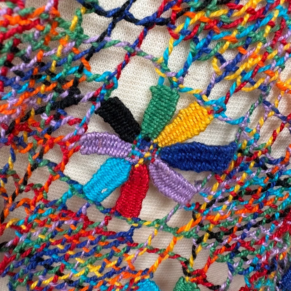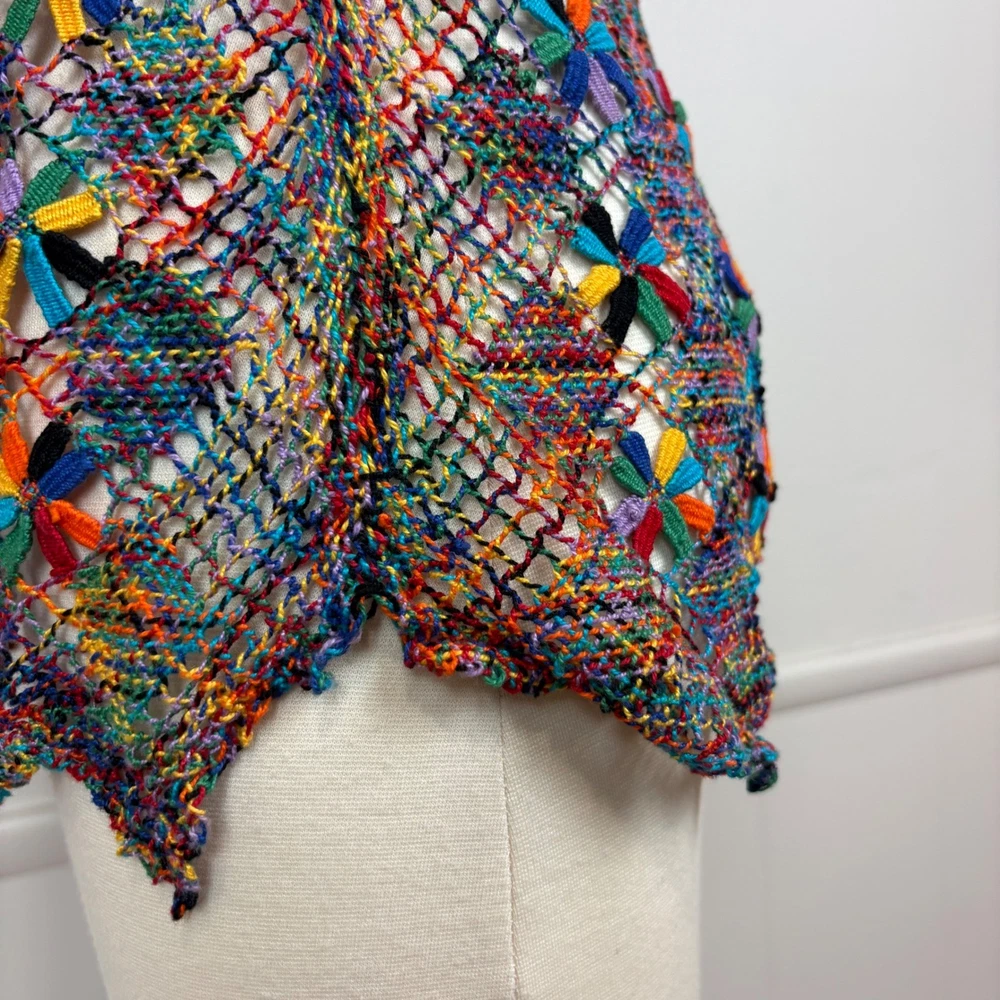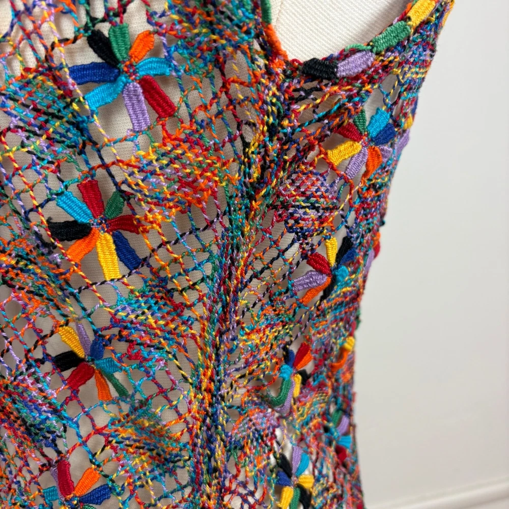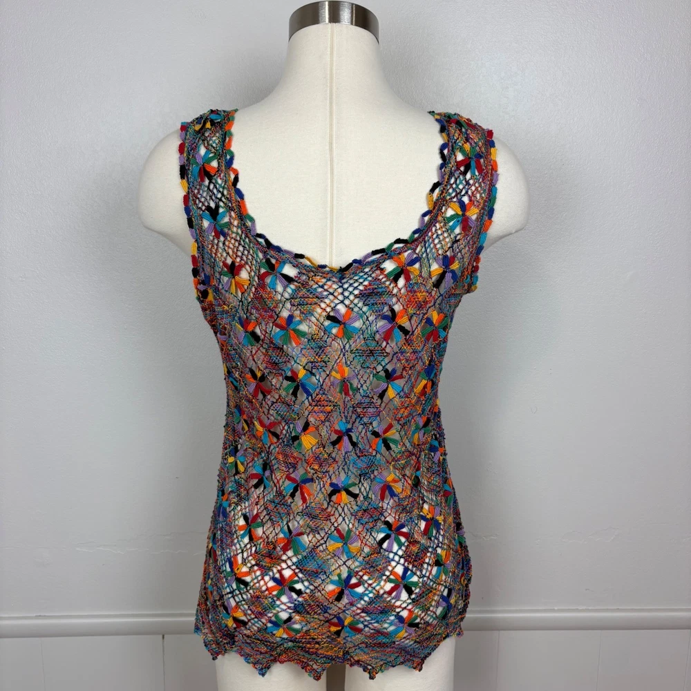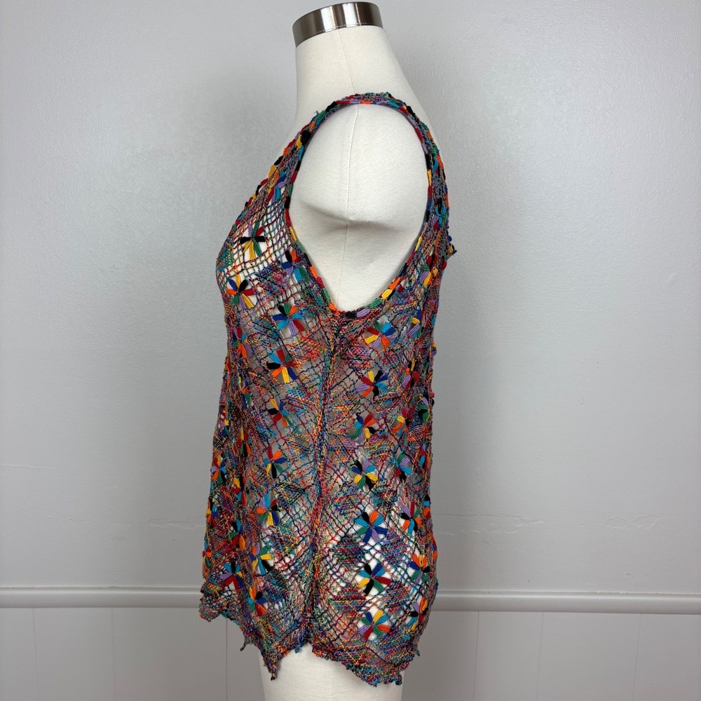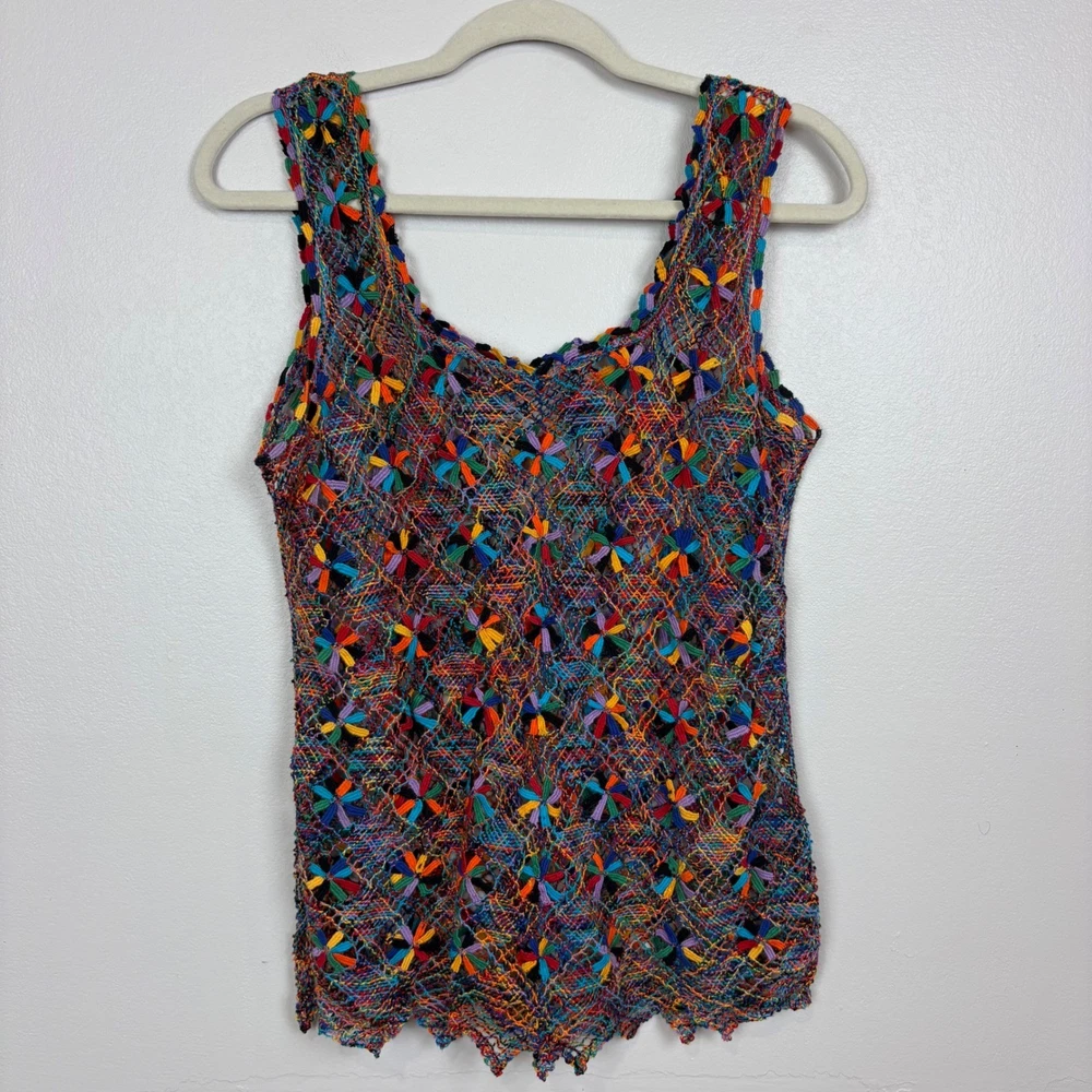 Open knit sleeveless tank top features a scoop neck and scalloped hemline. Beautiful starbust floral design surrounded by diamond shaped open knit pattern in rainbow colored thread. Neckline is embellished with linked colorful bars. SIZE: Medium (no size tag - please check measurements below to ensure desired fit) COLOR: Multicolor MATERIAL CONTENT: Unknown CARE: Handwash CONDITION: Excellent pre-owned condition with no fading, stains, or signs of wear. Please see photos/video for details. FLAT MEASUREMENTS (approximate) Underarm to Underarm: 19" Shoulder to Hem: 26" Bundle this item with our other pieces for combined shipping and savings! If you have any questions, please don't hesitate to ask. Thanks for viewing our listing! Unique, quirky, festive, beachy, art to wear, open knit, cover up, pride, festival
