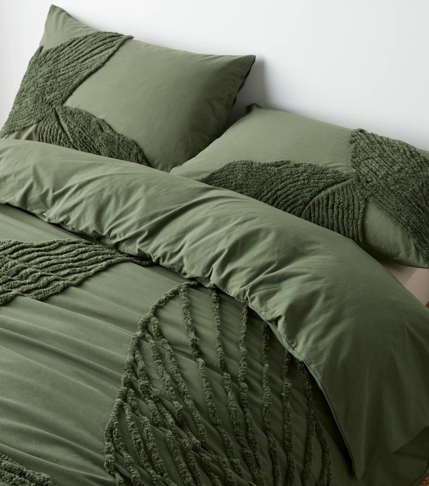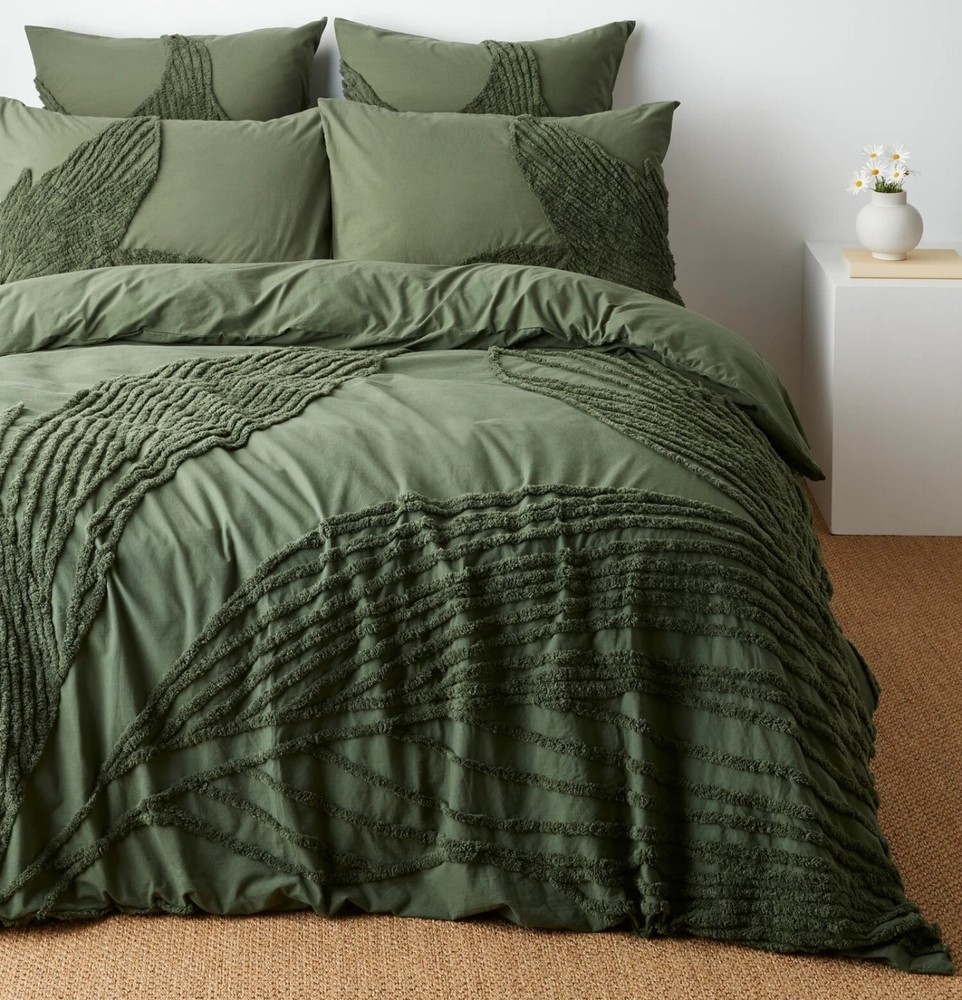 Adorn your bed with the Boho Dark Green Tufted Cotton Duvet Cover Set, featuring a tasteful leaf design that brings a touch of nature to your bedroom. This five-piece set, meticulously crafted in India, embodies a luxurious boho style that is sure to add texture and comfort to your space. Constructed with 100% cotton and boasting a thread count between 201 and 400, this duvet cover set promises breathability and softness. It caters to a variety of ages and tastes, fitting perfectly in any bedroom decor. The set includes a rectangular duvet cover with a convenient zip closure, and it's easy to maintain with machine wash and tumble dry instructions. ITEM DESCRIPTION : Item 3 Piece Set - 1 PC Duvet Cover With 2 PC Pillow Covers. Material - 100% Soft Cotton Fabric Feature - Tufted Design Color - ivory and white , Beige, Grey, Pastel Yellow , Sage Green. Closure - Back Side Zip Closure Wash Care - Dry Clean SIZE CHART : Twin - 68" x 90" inches & Pillow Size is 20" x 30" inches Twin XL - 59" x 102" Inches & Pillow Size is 20" x 26" Inches Full - 80" x 90” Inches & Pillow Size is 20" x26” Inches . Queen - 90" x 90” Inches & Pillow Size is 20" x 30” Inches . King - 90" x104” Inches & Pillow Size is 20" x 36” Inches. Cl.king - 98" x104” Inches & Pillow Size is 20" x 36” Inches. Cushion Cover Size - 18X18" inches in Standard Size. We ship order order by FedEx, & Dhl Express, hence rest assured for prompt delivery of your order. NOTE : International buyers are responsible for their countries duties and taxes.