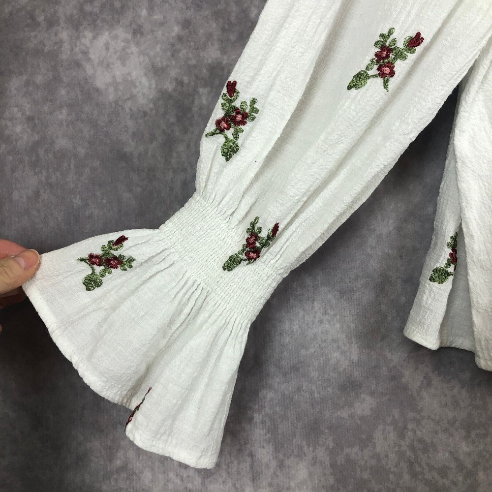 Altar’d State Top Boho Floral Embroidered Off Shoulder Peasant Blouse Cropped Size Medium Smocked neckline 100% Cotton 3/4 length flared sleeves Very good pre-owned condition. Measures approximately: 21" armpit-armpit 16" length (X)