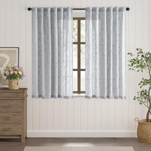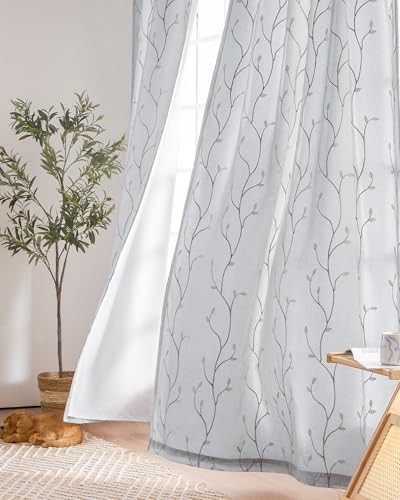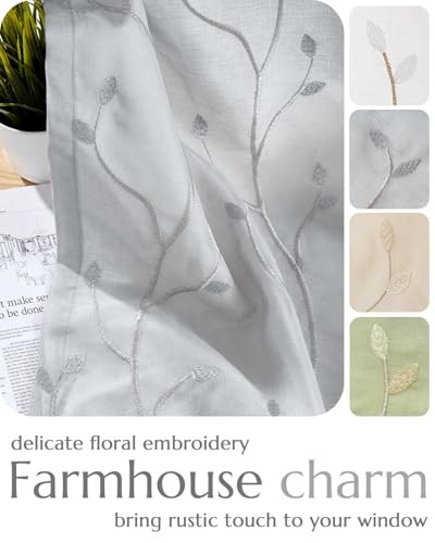 Boho Floral Embroidered Sheer Curtains 63 Inch for Bedroom