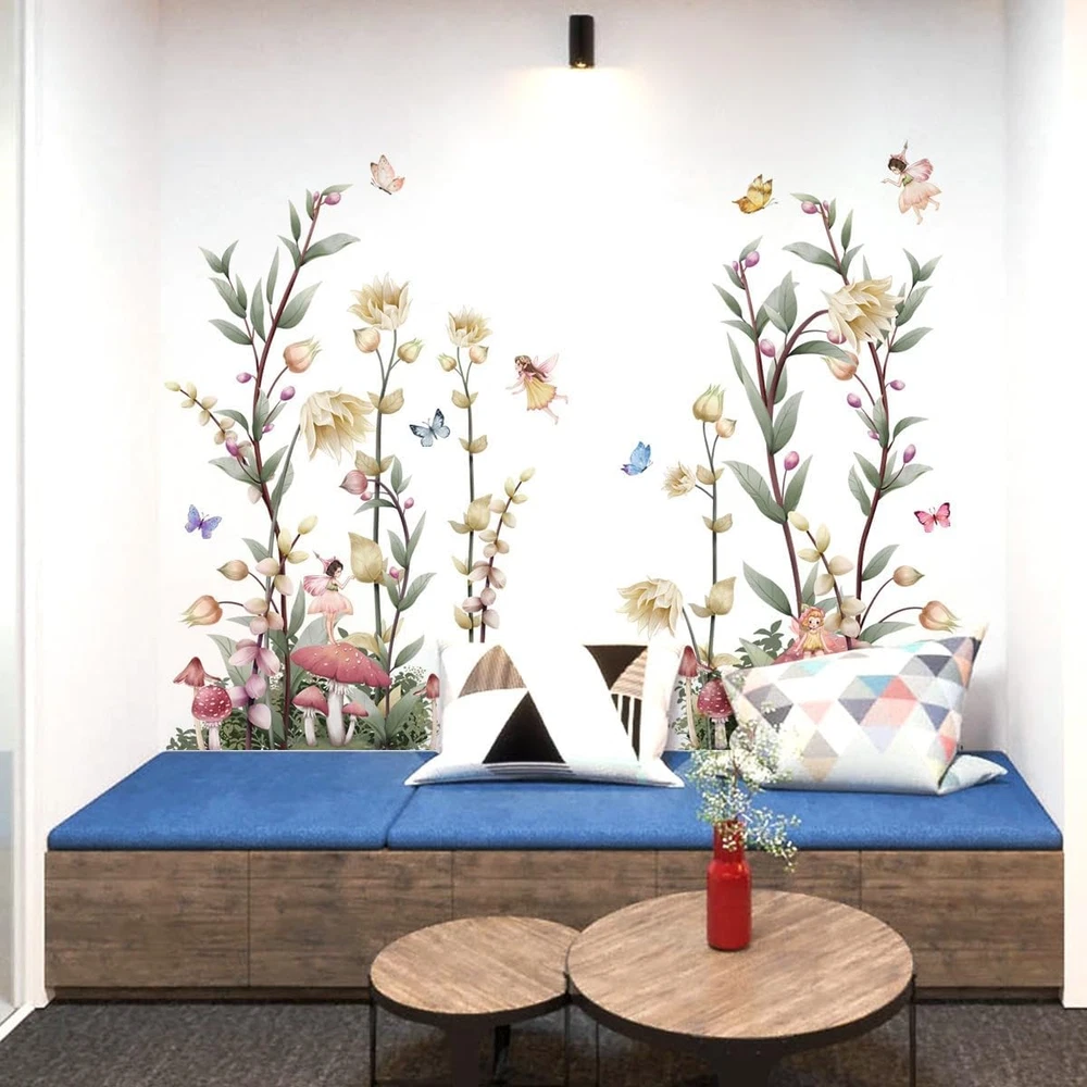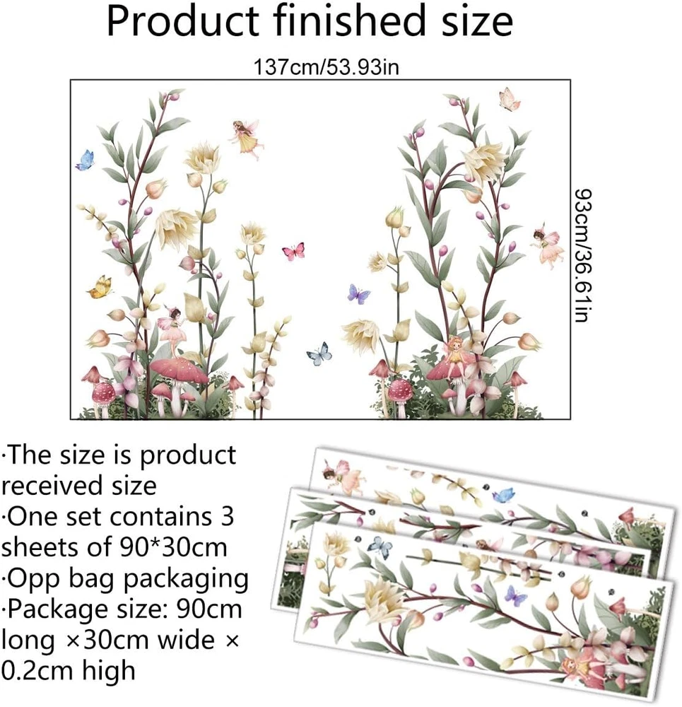 Decorative Wall Decals: This set includes 3 sheets of peel-and-stick wall decals featuring boho flowers design with wildflowers, butterflies, fairies and mushrooms. Versatile Decor: Boho-inspired wildflower wall decals with fairy and mushroom accents, perfect for adding a touch of nature to living rooms, bedrooms, or offices. Large Size: Each decal sheet measures 30cm x 90cm (11.8in x 35.4in), with a combined finished size of 137cm x 38cm (53.9in x 15in) when installed, offering ample coverage for transforming walls into captivating floral murals. Easy Installation: Peel-and-stick design allows for hassle-free application and removal without damaging walls, making it perfect for renters or those who love to update their decor frequently Removable Design: These wall decals can be repositioned or removed without leaving residue, enabling versatile decor changes. Bring the beauty of nature into your living space with these stunning boho flower wall decals. Featuring a delightful array of wildflowers, mushrooms, fairies and whimsical butterflies, this set of peel and stick wall decal is perfect for creating a serene and enchanting atmosphere in your living room, bedroom, or office. The vibrant colors and intricate details will instantly elevate the ambiance of any room. With a finished size of 53.93 inches wide x 36.61 inches high when assembled, these removable decals are easy to apply and reposition, allowing you to transform your walls without damaging them. Embrace the bohemian spirit and let these delightful floral wall decals add a touch of magic to your surroundings.