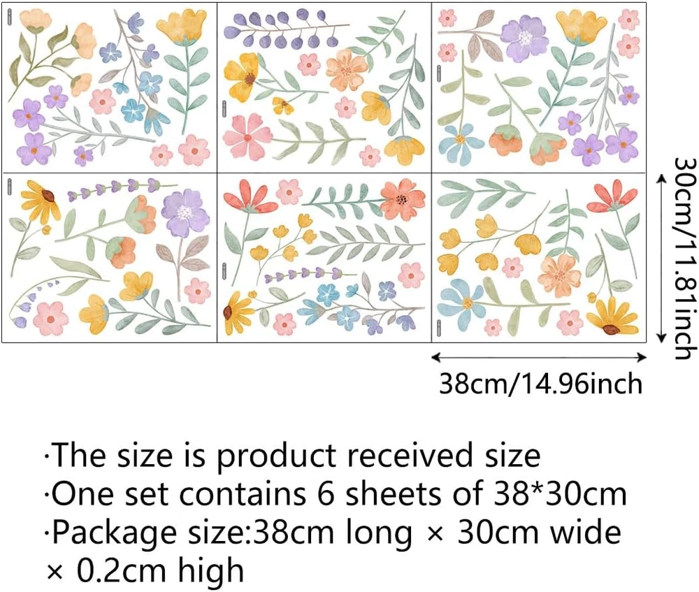 BOHO COLORFUL FLOWER WALL STICKER: Add vibrancy to any space with our stunning flower wall decals. These captivating pieces instantly elevate your decor with their colorful blooms. EASY APPLICATION AND REMOVAL: Our peel-and-stick design ensures hassle-free application and removal. Effortlessly adorn your walls with beautiful floral arrangements, and change up your decor as often as you like. VERSATILE DECOR: Perfect for bedrooms, living rooms, nurseries, and more, our flower wall decals offer endless decorating possibilities. Create a serene sanctuary or a whimsical space with ease. PREMIUM QUALITY: Crafted from high-quality vinyl, our decals boast durability and longevity, ensuring they retain their vibrant colors and intricate details over time. AFTERSALES SUPPORT: Your satisfaction is our priority. Reach out to us for prompt assistance with any issues. We're committed to ensuring you have a seamless experience with our flower wall decals. Product Description Colorful Flowers Wall Decal-Boho Color Combination Flowers Wall Sticker Colorful Bohemian Floral Wall Sticker - Bring a unique charm to your room Boho colorful flower wall decor will decorate any room, perfect for girls' bedrooms, kids' rooms, nurseries, daycare centers and more! Infuse your space with bohemian charm using our stunning BOHO watercolor flower wall decals! Let the vibrant hues and whimsical designs transport you to a world of artistic expression and free-spirited elegance. Embrace the beauty of bohemian style and create a dreamy atmosphere in any room. Note: In order for the colorful flower stickers to adhere to the wall effectively, please clean the wall before use. After applying the combination of colorful flower stickers, Then press gently with your hands or other flat tools to make it fit better and more securely. Boho Colorful Flowers Wall Decal There are many types of colorful Boho flower theme wall stickers, and the installation method is also very flexible. You can also choose to peel it off the wall when changing environments. These stickers are unbreakable, won't damage walls, and are extremely reliable, flower wall stickers can be used for DIY decoration in a variety of bedroom situations. Flower sticker combination decorative wall decals are made of high quality vinyl, Each pack contains 6 11.81" * 14.96" stickers. Installation process STEP 1 Clean surfaces to ensure they are clean, neat, free of dust, debris, etc. STEP 2 Carefully peel the sticker off the back. STEP 3 You can put the stickers where you want them to go STEP 4 Use other tools to squeeze out all the air bubbles inside There are more stickers for you to choose from Add to Cart Add to Cart Add to Cart Add to Cart Add to Cart Add to Cart Price $9.99 $ 9 . 99 $9.99 $ 9 . 99 $9.99 $ 9 . 99 $9.99 $ 9 . 99 $9.77 $ 9 . 77 $11.77 $ 11 . 77 — waterproof √ √ √ √ √ √ √ birthday √ √ √ √ √ √ √ durability √ √ √ √ √ √ √ Easy to use √ √ √ √ √ √ √ vinyl √ √ √ √ √ √ √
