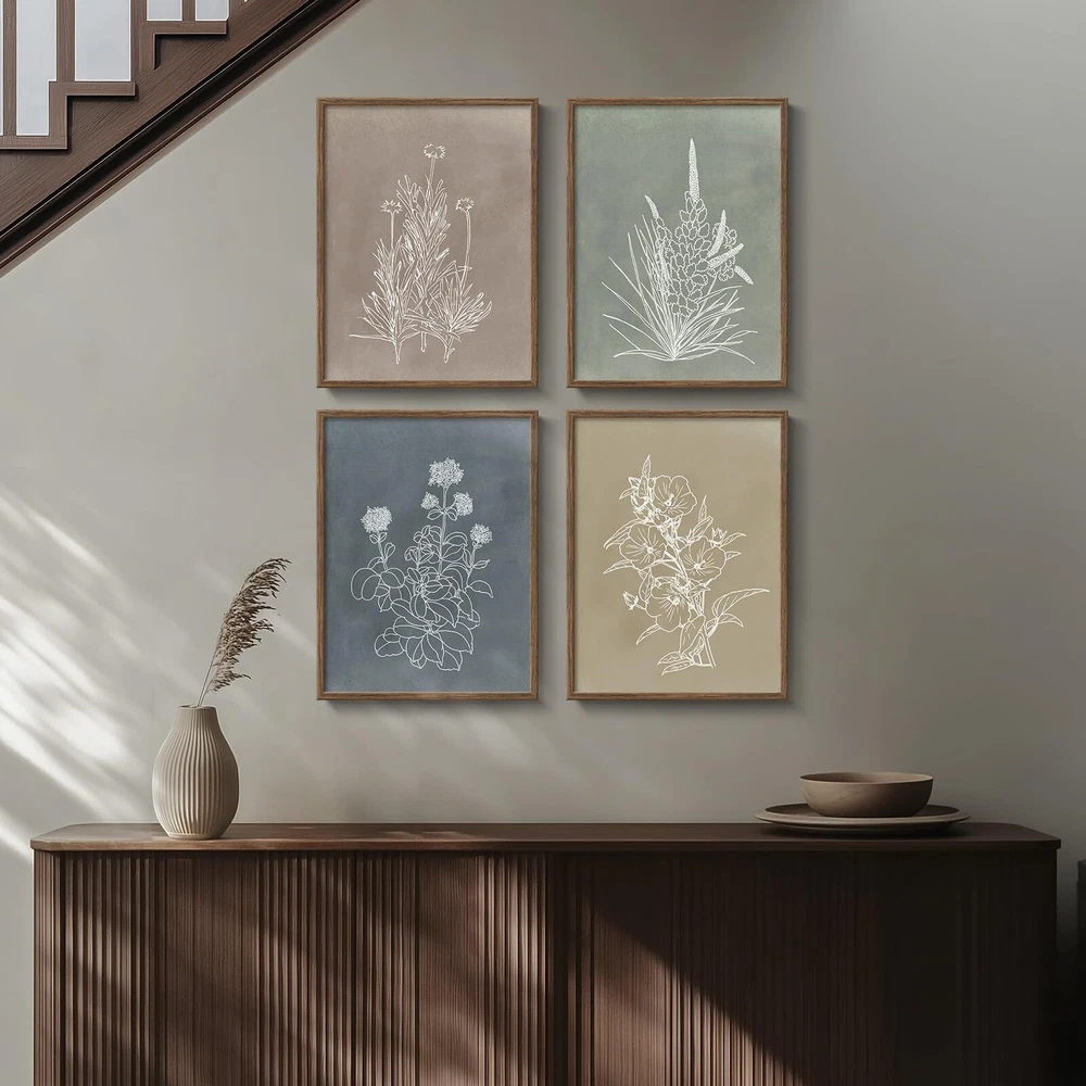 [Framed Wall Art]: A set of 4 boho vintage framed floral wall art prints with simple and rustic patterns, each measuring 12x16 inches. The frame is made of durable, rust-proof metal with a dark wood veneer on the surface to simulate real wood texture. [Canvas Art Wall Decor]: Our artwork is made of waterproof canvas, which is moisture-proof and easy to maintain. This canvas has a unique texture that can enhance the visual effect of the image and make the color more saturated, which can keep the color of the painting bright for a long time and is not easy to fade or damage. [As Great As The Picture]: The background color of this set of artworks is selected from soft earth tones such as beige, light green and dark blue, giving a calm feeling. The dark wood frame adds a rustic charm, combined with the line drawing plant pattern, creating a yet modern visual effect, and it is also easy to match with other furniture and decorations. Perfect for hanging in various rooms such as living room, bedroom, bathroom, dining room, study or office area. [Ready to Hang]: Each painting is framed for you. After receiving it, you can hang it up and decorate your beautiful home very easily and conveniently. [Gifting]: This set of bohemian style rustic botanical wall art prints are perfect for your new home decoration, or you can also give them to your relatives and friends when they move into a new home.