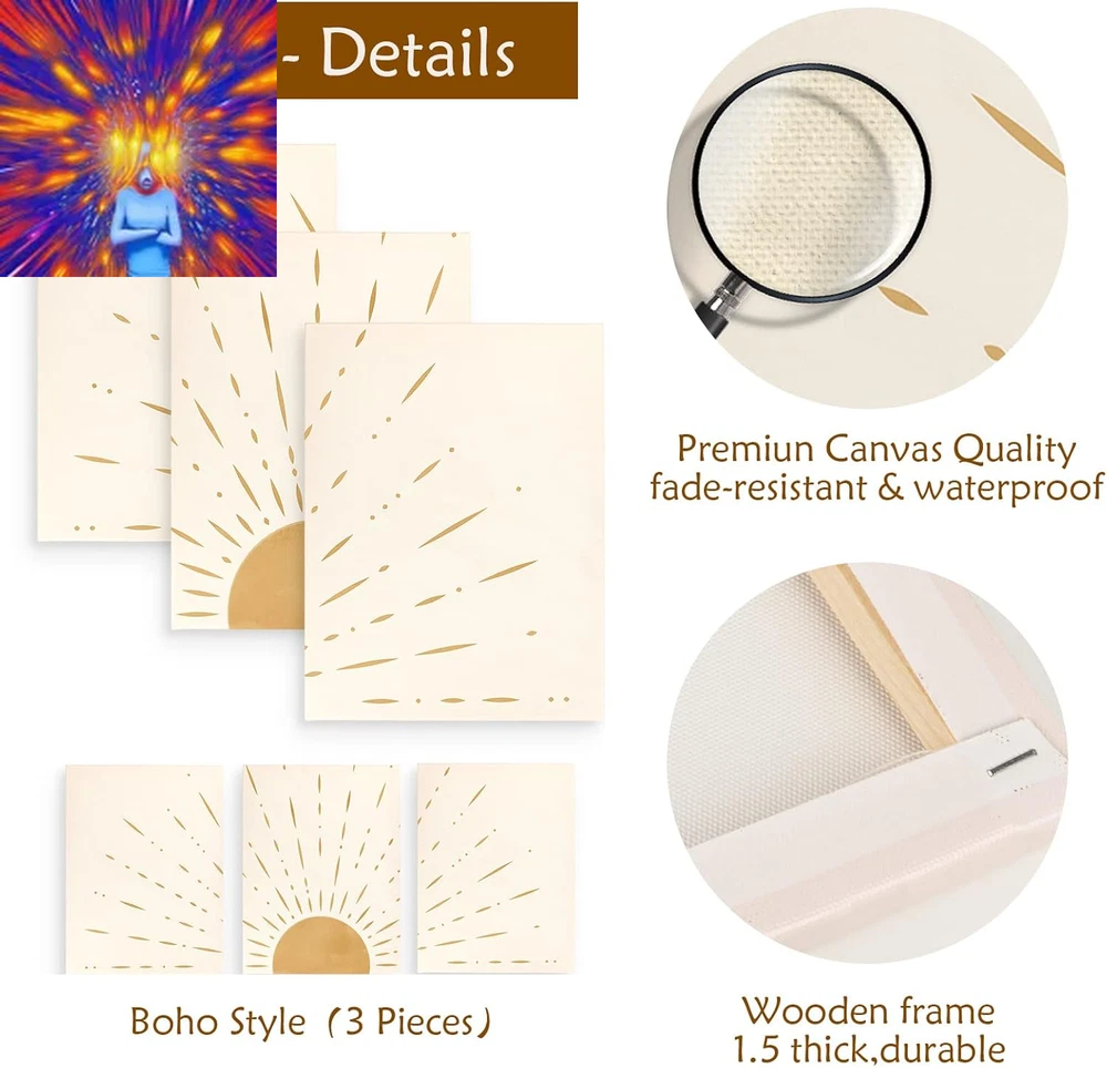Store New Arrivals Add to Favorite View Feedback Contact Boho Minimalist Wall Art Set - Modern Framed Canvas Prints Featuring Bohemian Style, Geometric Figures, and Abstract Art - Ideal for Home or Office Wall Decor (12"X16", Set of 3) Description Item Weight 1.76 pounds Color Boho Sun Rising Product Dimensions 15.75 x 11.81 x 0.2 inches Premium Quality: Our minimalist wall art set of 3 is printed on high-quality canvas with fade-resistant ink, ensuring long-lasting durability and beauty. Each canvas is 12"x16" (30cmx40cm) and comes ready to hang with solid wooden frames, gallery wrapped and complete with hooks and accessories. Modern Boho Style: Featuring a beautiful design of the sun rising on the horizon, our modern boho wall decor combines abstract art and the Bohemian style for a unique and elegant touch to any space. It can easily brighten up your room and give it a warm and welcoming atmosphere. Versatile Wall Decor: Perfect for any room in your home, our boho bedroom wall decor can be hung on the wall as a set or separately to create a unique and personalized theme. It's perfect for bedroom, kitchen, living room, bathroom, office, porch, corridor, dorm wall decor, and more. Easy to Match: The neutral beige color of our boho room decor makes it easy to mix and match with most home decor styles, such as Bohemian, mid-century modern, or minimalist decor. It's perfect for housewarming parties or gallery decoration. Great Gift Idea: Our modern art prints are the perfect gift for your friends, relatives, or colleagues who love Bohemian, mid-century modern, or minimalist themes. This wall art set can be a great gift for housewarming, birthday, Hanukkah, Christmas, Thanksgiving, and other occasions. Product Description Modern Boho Framed Canvas Minimalist Wall Art Prints Set of 3, the perfect addition to any boho, mid-century modern, minimalist, or neutral home decor. Elevate your home decor with our Modern Boho Framed Canvas Minimalist Wall Art Prints Set of 3 - an elegant and unique addition to any space. Product Details Each piece of cabvas is crafted from high-quality canvas material and fade-resistant ink to ensure long-lasting durability and vibrancy. Each canvas is 12"x16" (30cmx40cm), complete with hooks and accessories for easy installation and immediate wall decoration. The 1.5 inch thick wooden frames are carefully crafted to ensure that each giclee print is stretched tightly and does not buckle. Our minimalist boho wall art set is ideal for a range of scenarios, including living rooms, bedrooms, kitchens, dressing rooms, art rooms, galleries, offices, and bars. It also makes the perfect gift for any occasion, including housewarmings, Valentine's Day, Thanksgiving, Christmas, birthdays, Father's Day, Mother's Day, and anniversaries. ABOUT US We offer the best prices around on high quality products. Our E-store includes media such as books, movies, music and games while offering electronics, toys, sporting apparel, clothing, tools, general home, garden items and more. SHIPPING We are always working hard to ensure your package arrives as soon as possible. Please understand that some factors like weather, high postal traffic, and the performance of shipping companies are outside of our control. We offer free shipping to the lower 48 states and ship within 2 business days of payment, usually sooner. We do not accept P.O. Boxes. Please provide a physical address. For shipping outside of the continental USA, we only use eBay's Global Shipping Program.The item is shipped to KY and then sent to the rest of the world. International customers are responsible for all duties and taxes. Continue to check out in order to calculate costs for shipping the item to your country. Messages regarding eBay's Global Shipping Program MUST be directed at eBay EXCLUSIVELY. RETURNS We offer a 30-Day Return Policy on items which you are not completely satisfied with. You have the option for a full-refund or an exchange of the item. No returns are available on items shipped outside of the USA. PAYMENT We accept PayPal. CONTACT US This page content is yet to come Please ad us to your favorite seller and visit again later Thank You CUSTOMER SATISFACTION We try our very best to make sure every customer is completely satisfied. If there's a problem, message us! We're happy to help. WE ACCEPT