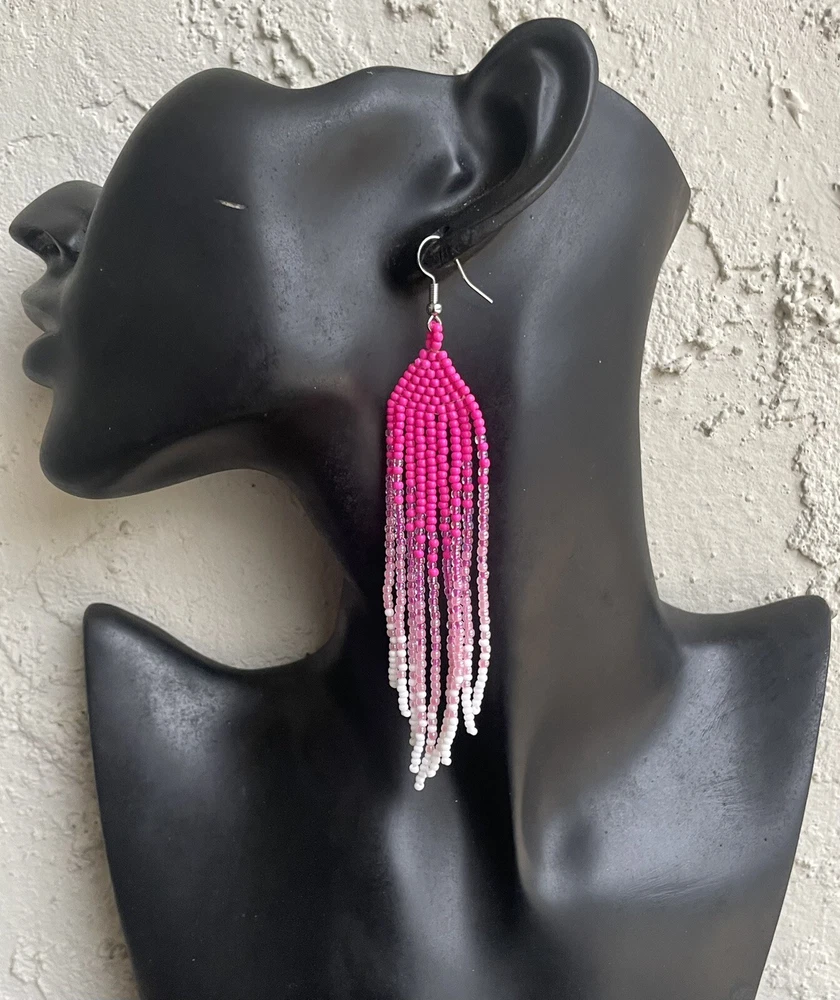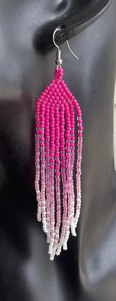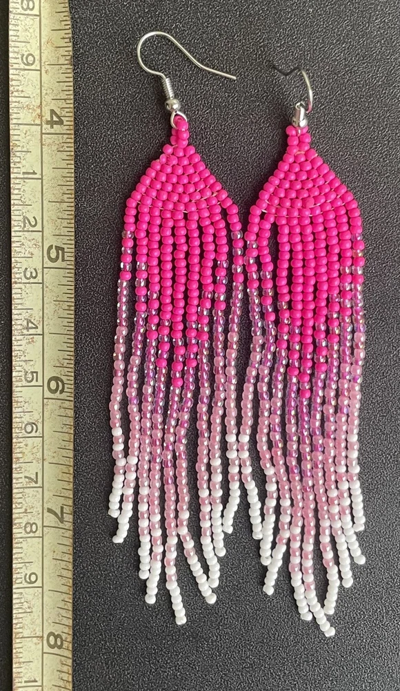 1 pair of pink and white graduated seed bead beaded earrings. You will receive earrings pictured. The earrings are made with seed beads.The earrings are approximately 4 1/4" long with the ear hooks included. They are for pierced ears. 0-ea-seed-259-1