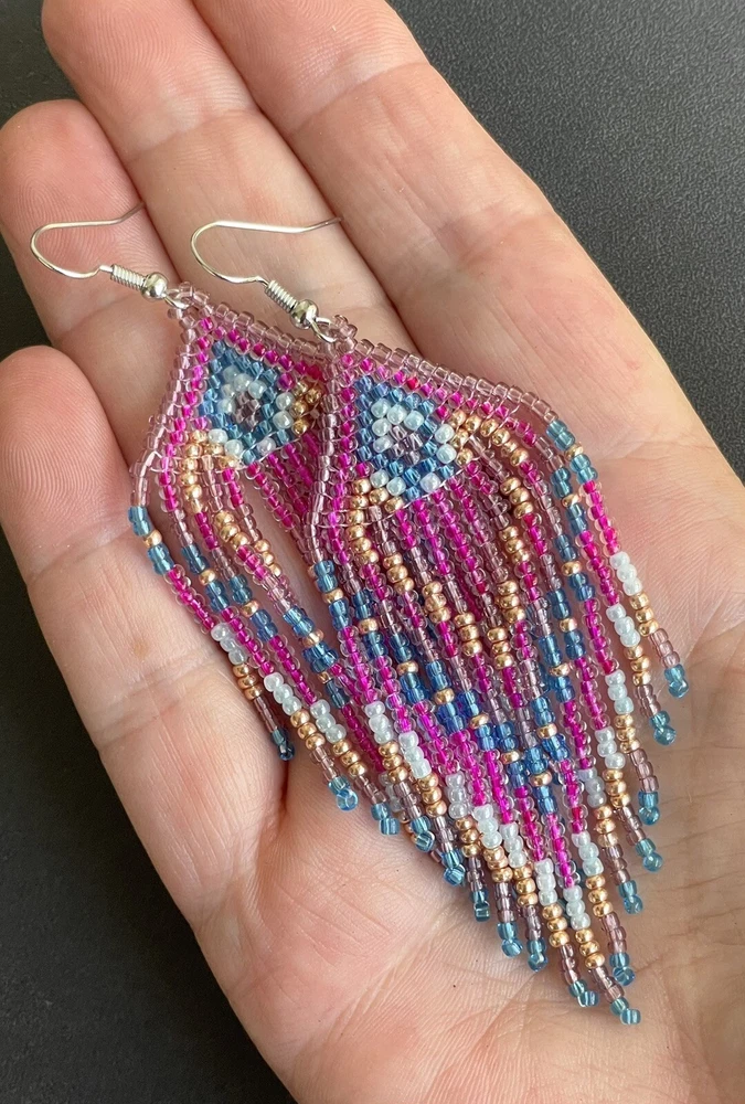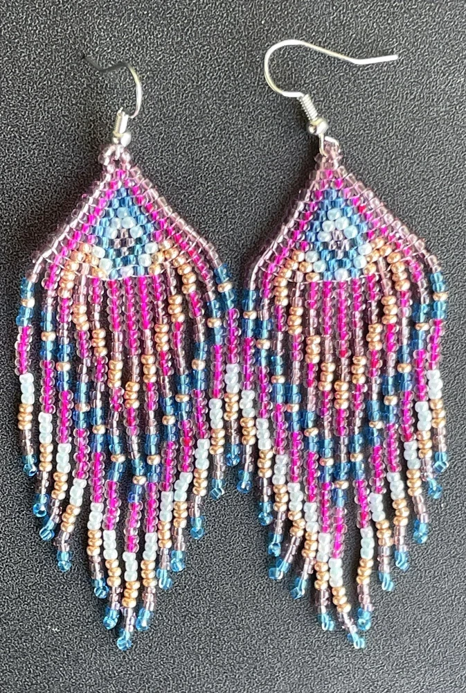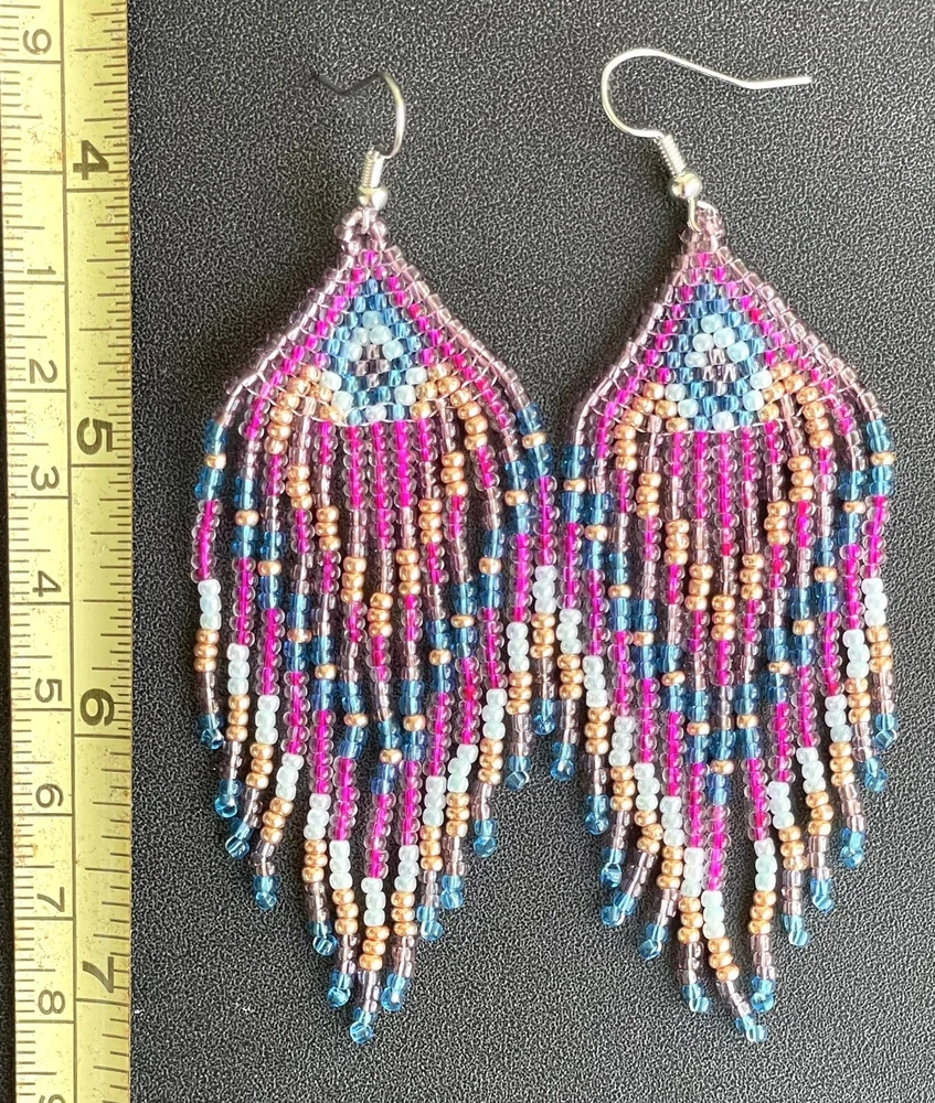 1 pair of pink, purple, blue and gold seed bead earrings. You will receive earrings pictured. The earrings are handmade with seed beads.The earrings are approximately 4" long with the ear hooks included. They are for pierced ears. 0-ea-seed027-1