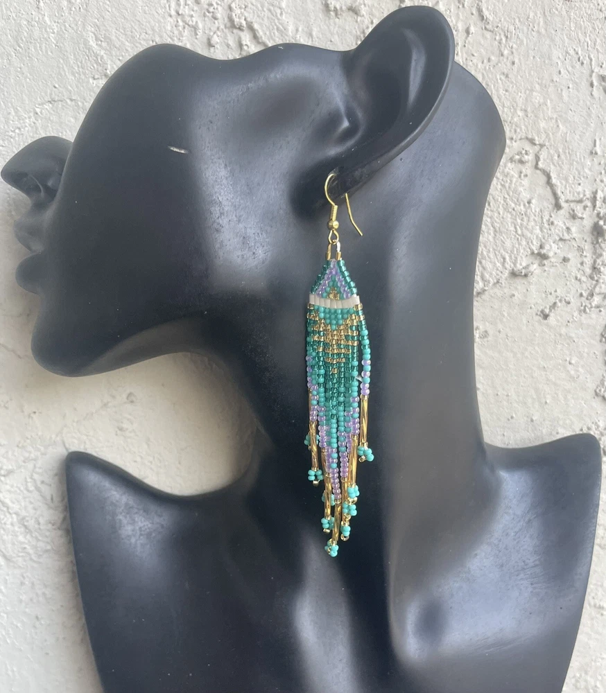 1 pair of handmade long turquoise and gold seed bead beaded earrings. You will receive earrings just like the ones pictured. The earrings are handmade with seed beads. The earrings are approximately 4 1/4" long with the ear hooks included. They are for pierced ears. 0-ea-seed-196-1