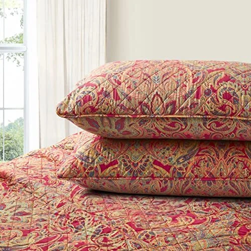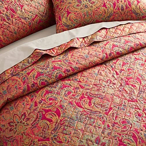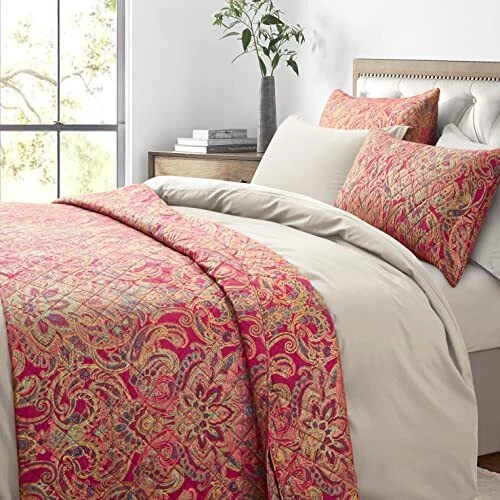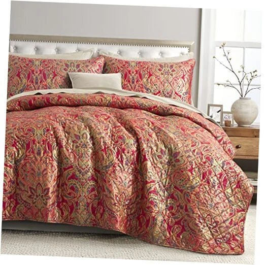 Return Policy Fast Delivery Trusted seller Boho Paisley Print Luxury Quilt and Shams Bedding Set Bohemian Damask Medallion Bedspread 400TC Egyptian Cotton Sateen Coverlet Bothe Quilted Blanket Spanish Red (Red Gold, Queen) Product Description Luxurious vintage Bohemian Paisley Bedding, printed coverlet and shams set Classic Persian inspired Boteh paisley medallion pattern bedspread in bright red, blue, tan with metallic gold accent. A layer for all seasons. This luxe coverlet and shams are quilted with diamond pattern for a classic look that works with everything in your linen closet. It’s tailored of wrinkle-free cotton sateen for its buttery soft hand and subtle luster. An all-season patterned coverlet adds texture and quiet elegance to your bed. Measurement and Quantity: Queen Size 3pc. Set: 1pc. Duvet Cover 92 by 90-inch and 2pc. 20 by 30-inch pillow shams. King 3pc. Set: 1pc. Duvet Cover 92 by 108-inch and 2pc. 20 by 36-inch pillow shams. Materials: Shell: 400 thread count 100-percent Egyptian cotton, densely woven and smooth with a subtle sheen Filling: 80% Cotton / 20% Polyester. Machine washable Shipping Returns Payment Shipping Shipping is FREE to all addresses other than APO/PO boxes in the lower 48 states. All our stock ships from US-based warehouses. Shipped via USPS or UPS (depending on location and package weight) Unless stated otherwise, all orders will ship within 24-72 hours of your payment being processed. Check our feedback to see the great reviews of FAST shipping we offer. Returns Seller does not accept returns Payment We currently accept payment via eBay managed payments only. Once payment is cleared, we will dispatch your shipment within 1-3 business days. Please refer to the "Shipping" tab for more information regarding shipping speed to your destination.
