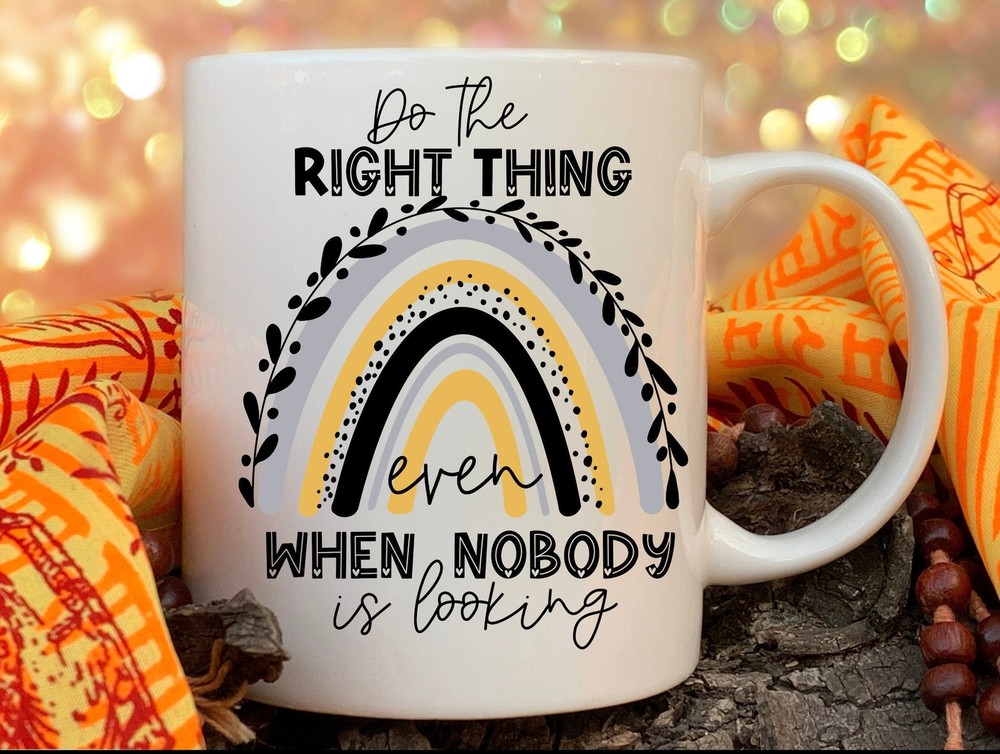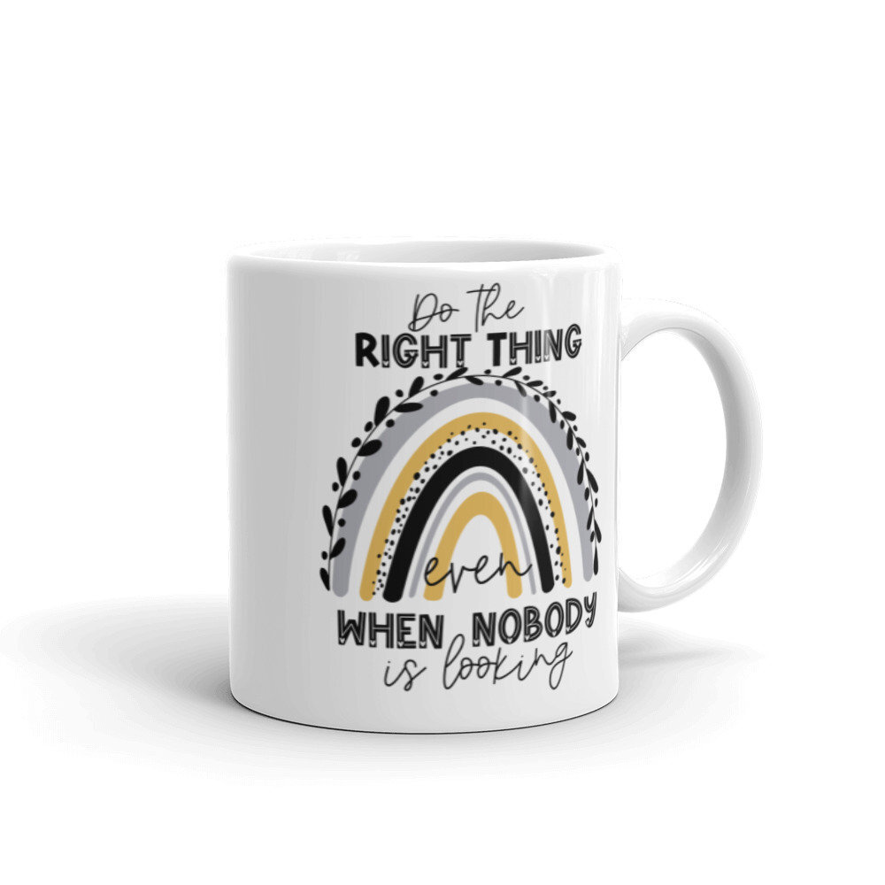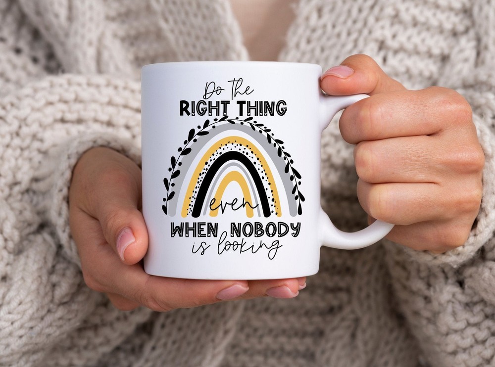 Rainbow Mug Do The Right Thing Even When Nobody Is Looking Mug Boho Rainbow Mug Product Details.. This high quality 11oz. ceramic white mug has a premium hard coat that provides crisp and vibrant color reproduction sure to last for years. Perfect for all hot & cold beverages. The highest quality printing possible is used. It will never fade no matter how many times you wash it. Material: 100% Ceramic. Print both sides. Dishwasher and Microwave Safe. High Gloss + Premium White Finish. Printed in the U.S.A. Personalized & Custom. We support personalized and custom mug to add custom, when placing an order, you can add notes to the "order note" in shipping address section. Also you can contact us directly via message. Shipping Info. Ready to ship in 1 to 2 business days, All products are made-to-order and proudly printed in the United States. Shipped by USPS and DHL, You will receive your order in 5-7 days. Replace & Refund. All products are defective during shipping broken, chipped will be replaced free of charge. You are not satisfied with the product, we will refund 100% money to you. If any other issues arise, please do not hesitate to message, we would be more than happy to assist you.