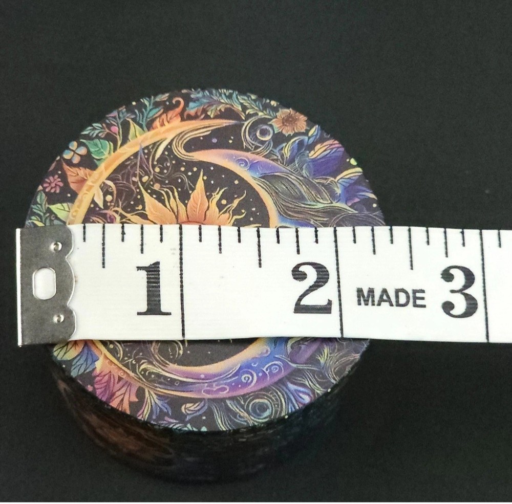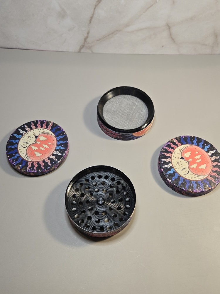 The Boho Spice/Herb Grinder 2.375" with a Celestial Sun & Moon Design is a stylish and functional addition to any collection. Made of durable Zinc Alloy, this manual grinder features a magnetic lid for secure closure. Hand wash only to maintain its unique design and quality. Imported from China, this non-handmade grinder is perfect for grinding tobacco, herbs, or spices with its convenient size and reliable operation.