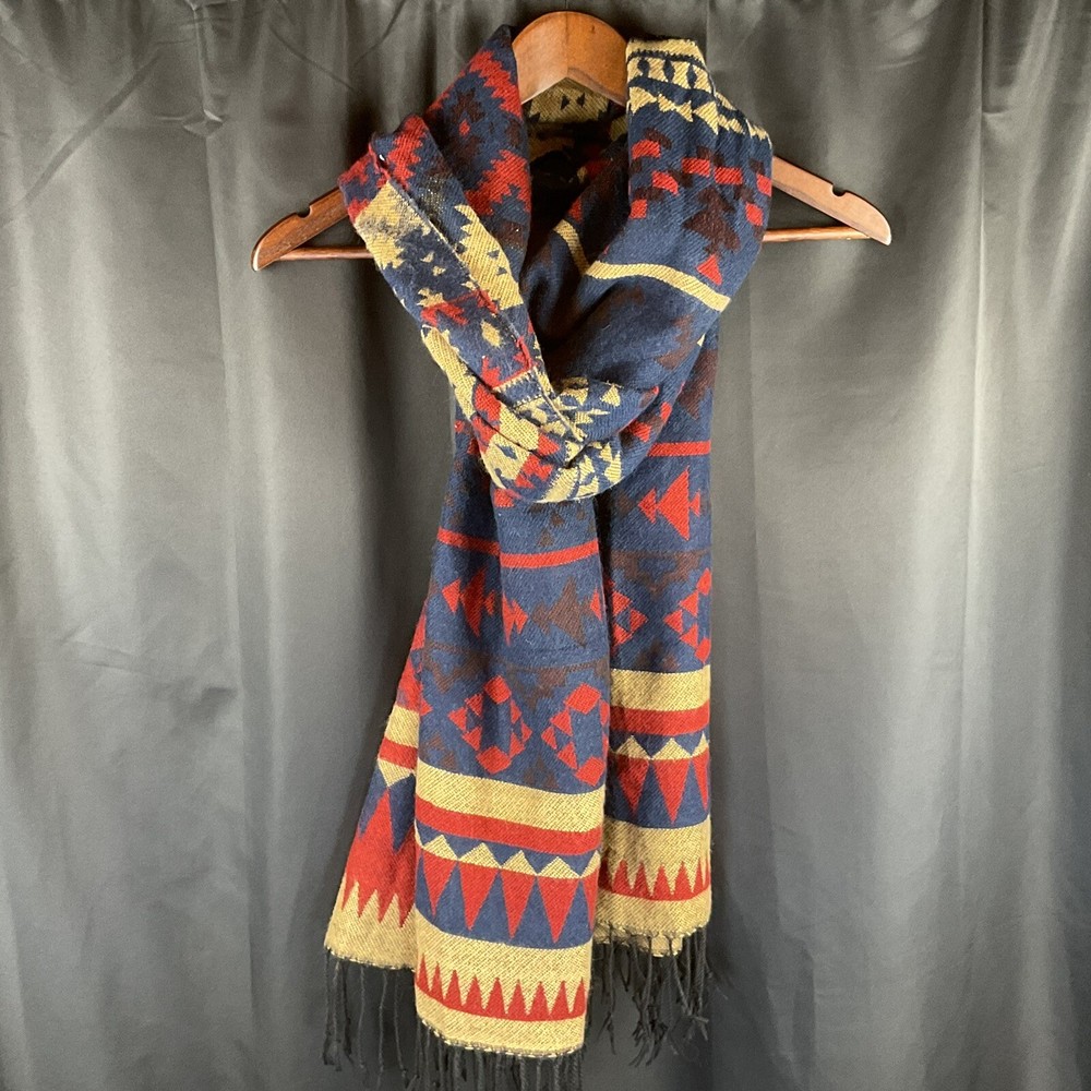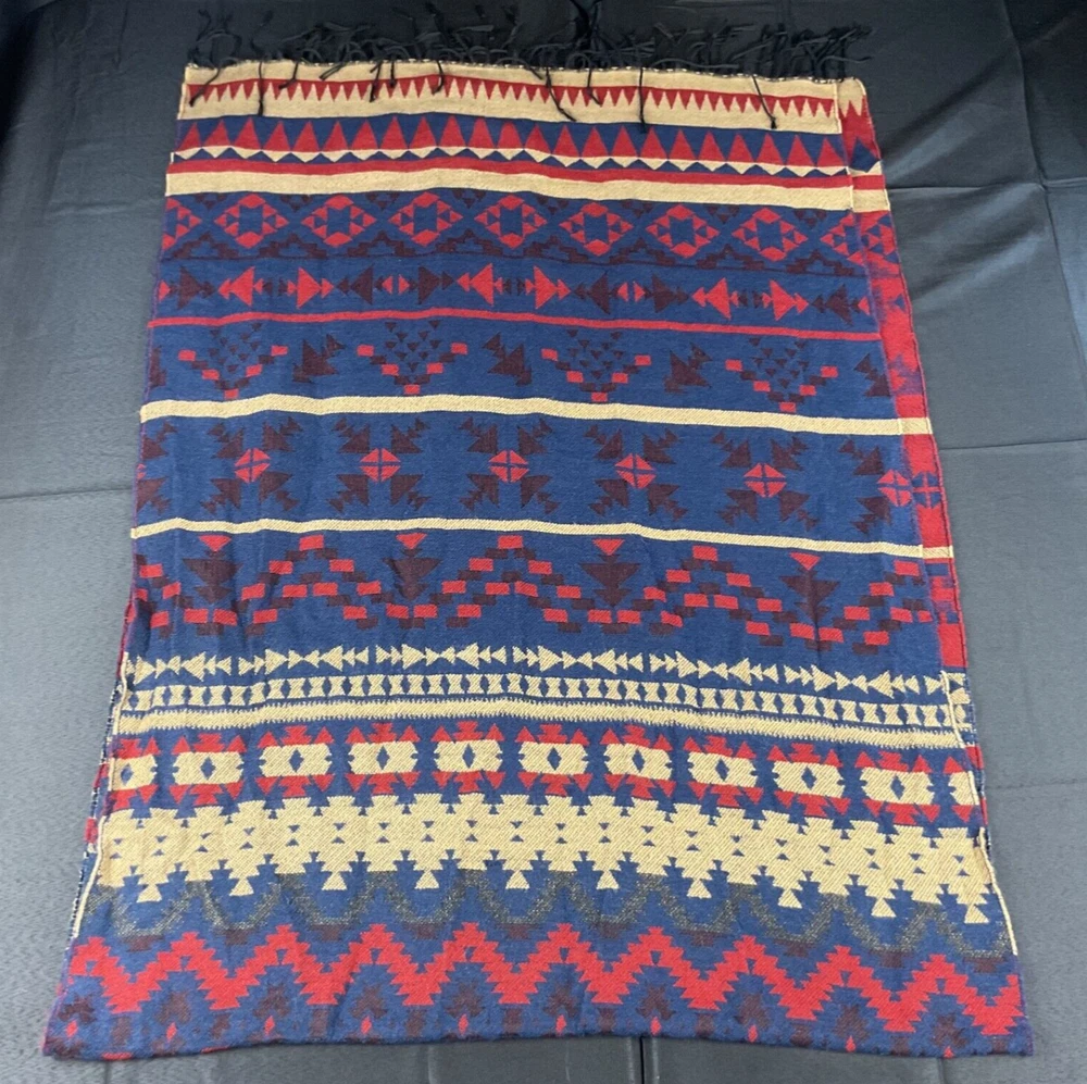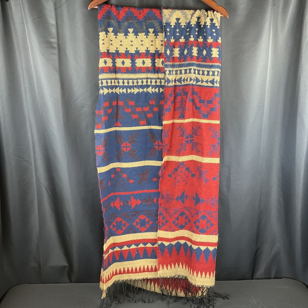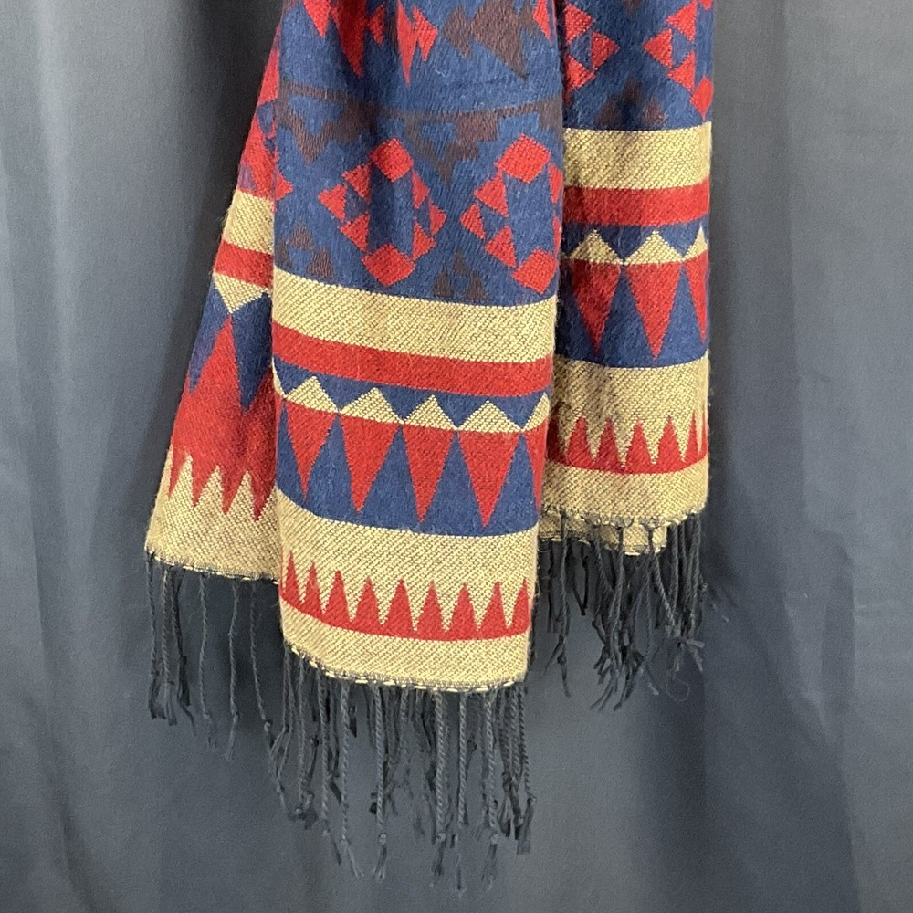 Boho western print polyester/acrylic blend blanket scarf with fringe. Made in China, one size, machine washable, dry flat. Very good preowned condition - please see photos for additional info.