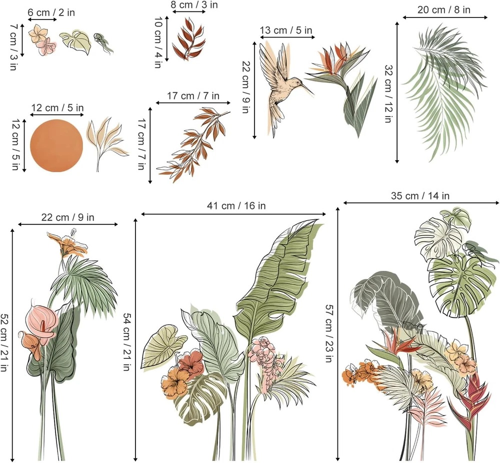 It can be stuck onto any clean, dry, non-textured smooth surfaces: walls, windows, tiles, furniture, mirrors, even your refrigerators. decalmile wall stickers are made of high quality, bright and colourful, easy to peel and stick, removable and waterproof. decalmile boho tropical leaves flower wall decals are perfect to decorate bedroom, living room, dining room, sofa tv background. Come in 2 sheets, sheet size: 30cm × 90cm (11.8" × 35.4"), recommend finished size: 88cm x 88cm (34.6" x 34.6") or depending on your preference to DIY. If you're not satisfied with your purchase or have any problems on installation, please feel free to contact us and we will reply and help solve problems within 24 hours. Product Description DECALMILE FLOWER WALL DECALS Add Chill Vibes Various Choices with Unique Design decalmile stock a huge selection of stunning wall stickers catering to all ages and tastes. We promise all stickers are non-toxic and top quality PVC material Wall Decals for Kids Become an interior decorator and transform your living space from ordinary to extraordinary with decalmile unique wall stickers. Flower Wall Decor Add to Cart Add to Cart Add to Cart Add to Cart Add to Cart Add to Cart Add to Cart Customer Reviews 4.5 out of 5 stars 213 4.5 out of 5 stars 257 4.4 out of 5 stars 78 4.4 out of 5 stars 78 4.5 out of 5 stars 40 4.3 out of 5 stars 739 4.5 out of 5 stars 155 Price $11.99 $ 11 . 99 $12.99 $ 12 . 99 $17.99 $ 17 . 99 $12.99 $ 12 . 99 $11.99 $ 11 . 99 $16.99 $ 16 . 99 $12.99 $ 12 . 99 Removable ✔ ✔ ✔ ✔ ✔ ✔ ✔ Material PVC PVC PVC PVC PVC PVC PVC Installation Type Peel & Stick Peel & Stick Peel & Stick Peel & Stick Peel & Stick Peel & Stick Peel & Stick Theme Leaves Flower Flower Flower Flower Leaves Sunflower Color Multi Multi Multi Multi Multi Multi Multi Pink Wall Decor Add to Cart Add to Cart Add to Cart Add to Cart Add to Cart Add to Cart Add to Cart Customer Reviews 3.7 out of 5 stars 48 4.4 out of 5 stars 102 4.5 out of 5 stars 40 4.7 out of 5 stars 138 4.4 out of 5 stars 78 4.6 out of 5 stars 510 4.4 out of 5 stars 387 Price $14.99 $ 14 . 99 $18.99 $ 18 . 99 $12.99 $ 12 . 99 $11.99 $ 11 . 99 $11.99 $ 11 . 99 $21.99 $ 21 . 99 $11.39 $ 11 . 39 Removable ✔ ✔ ✔ ✔ ✔ ✔ ✔ Material PVC PVC PVC PVC PVC PVC PVC Installation Type Peel & Stick Peel & Stick Peel & Stick Peel & Stick Peel & Stick Peel & Stick Peel & Stick Color Multi Multi Multi Multi Multi Multi Multi Theme Palm Tree Palm Tree Vine Flower Flower Blossom Tree Vine What types of surfaces can the wall decals be applied to? Our wall stickers can be applied to just about any clean and smooth surface that is free of dust, grease, or other contaminants. DecalMile wall stickers may not adhere to heavily-textured surfaces but can adhere to lightly textured wall. How long will my wall sticker stay up? DecalMIile wall stickers are not intended for permanent application. However, they can last for months or years depending on the surface and environment. Will the wall decals damage my wall? When walls have been prepared as recommended and proper application, most people have no wall damage issue while removing. Please be aware that there is potential for wall damage. Freshly painted walls should be allowed to cure for at least 4 weeks. I installed a wall decal but it is starting to peel off. What do I do? If part of a wall sticker starts to come off a surface, you can use washable glue, such as a glue stick or wallpaper paste or glue, to reattach it.